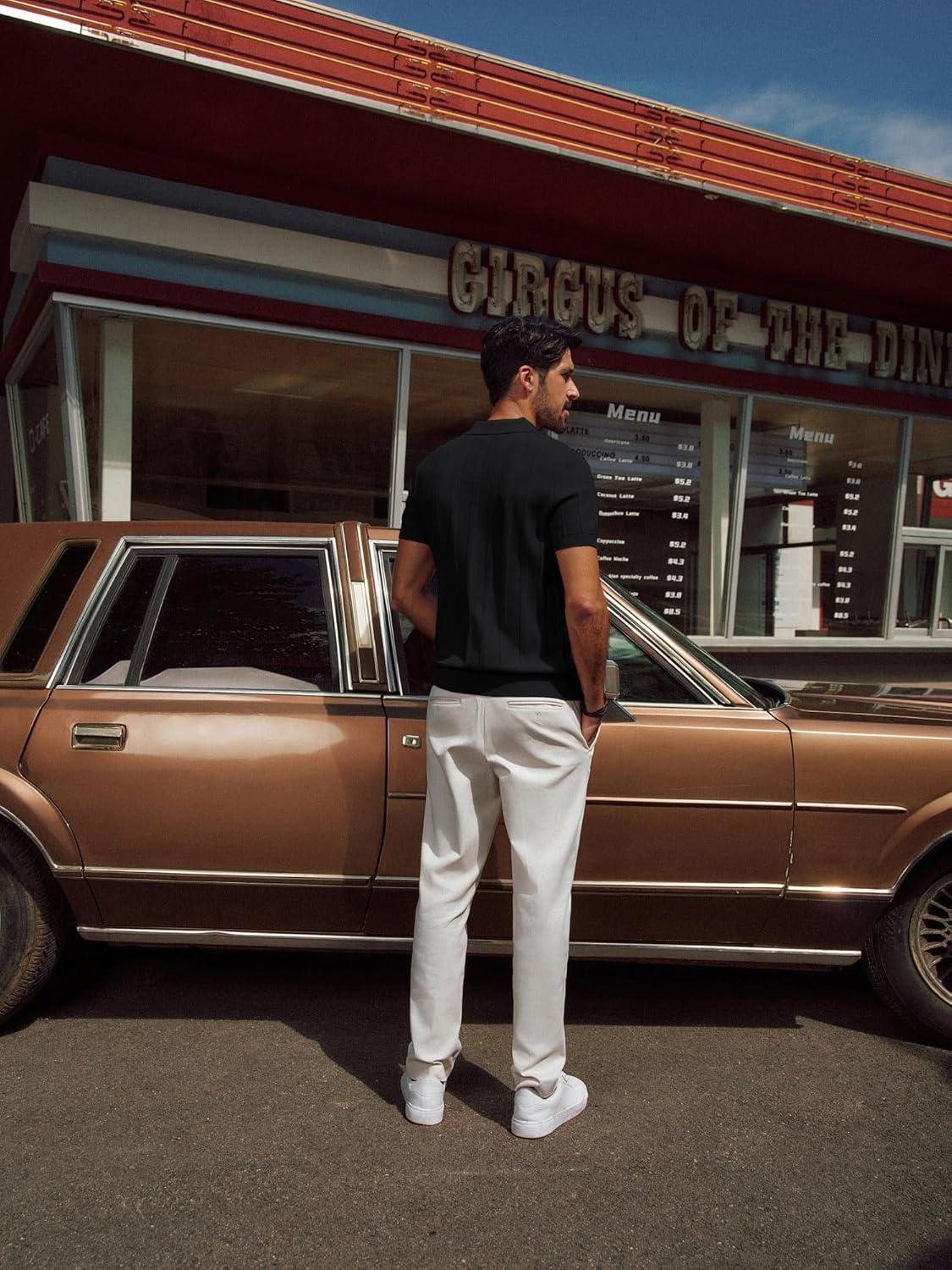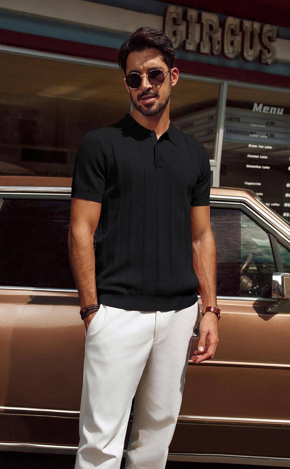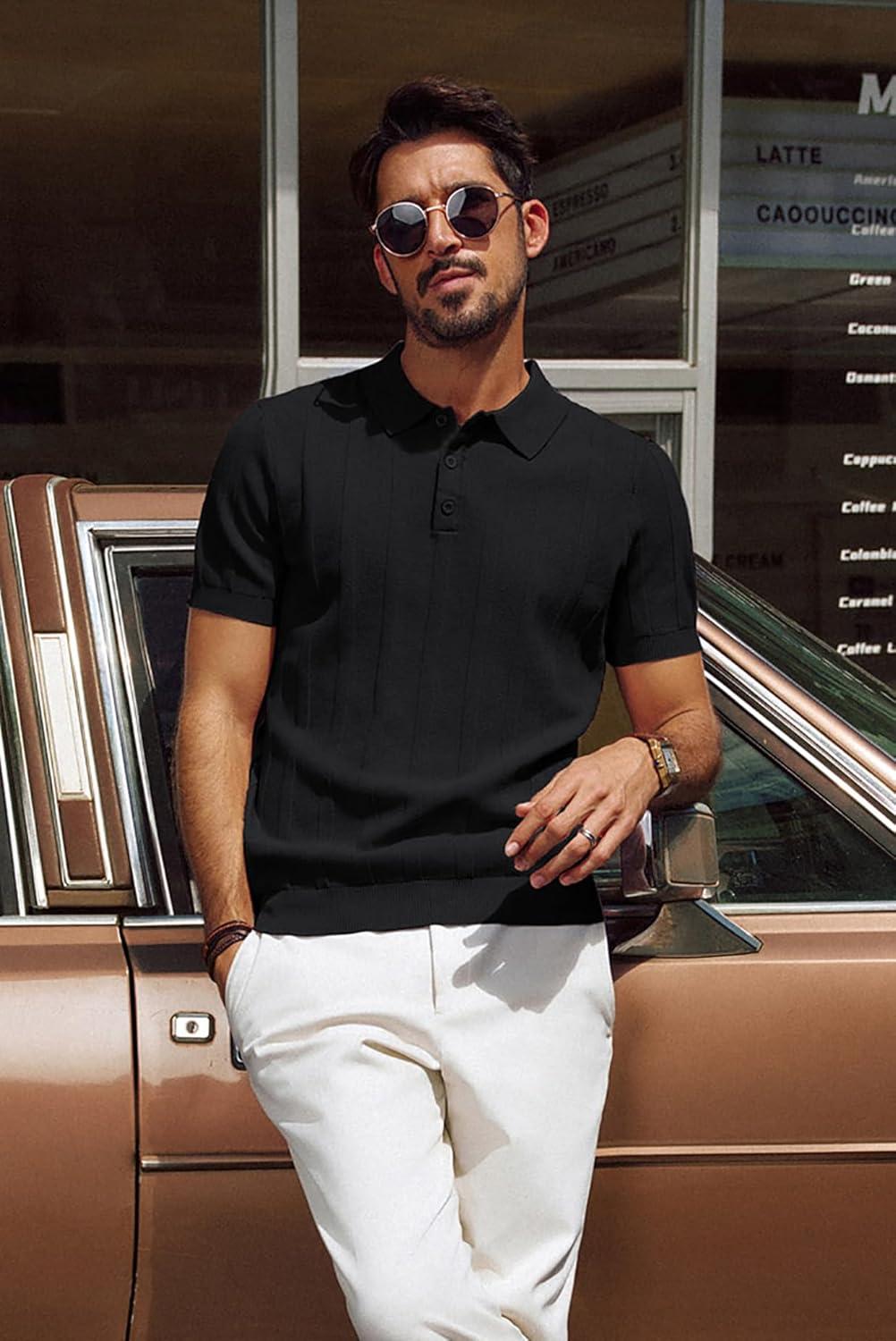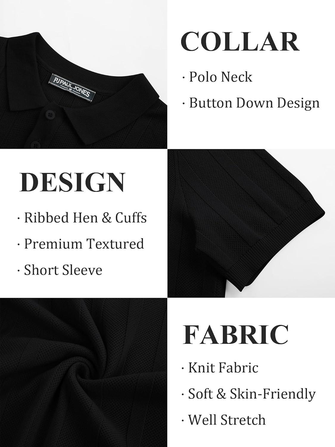 PJ PAUL JONES Mens Polo Shirts Short Sleeve Textured Knit Polo Shirt Ribbed Casual Golf Shirts(Black)