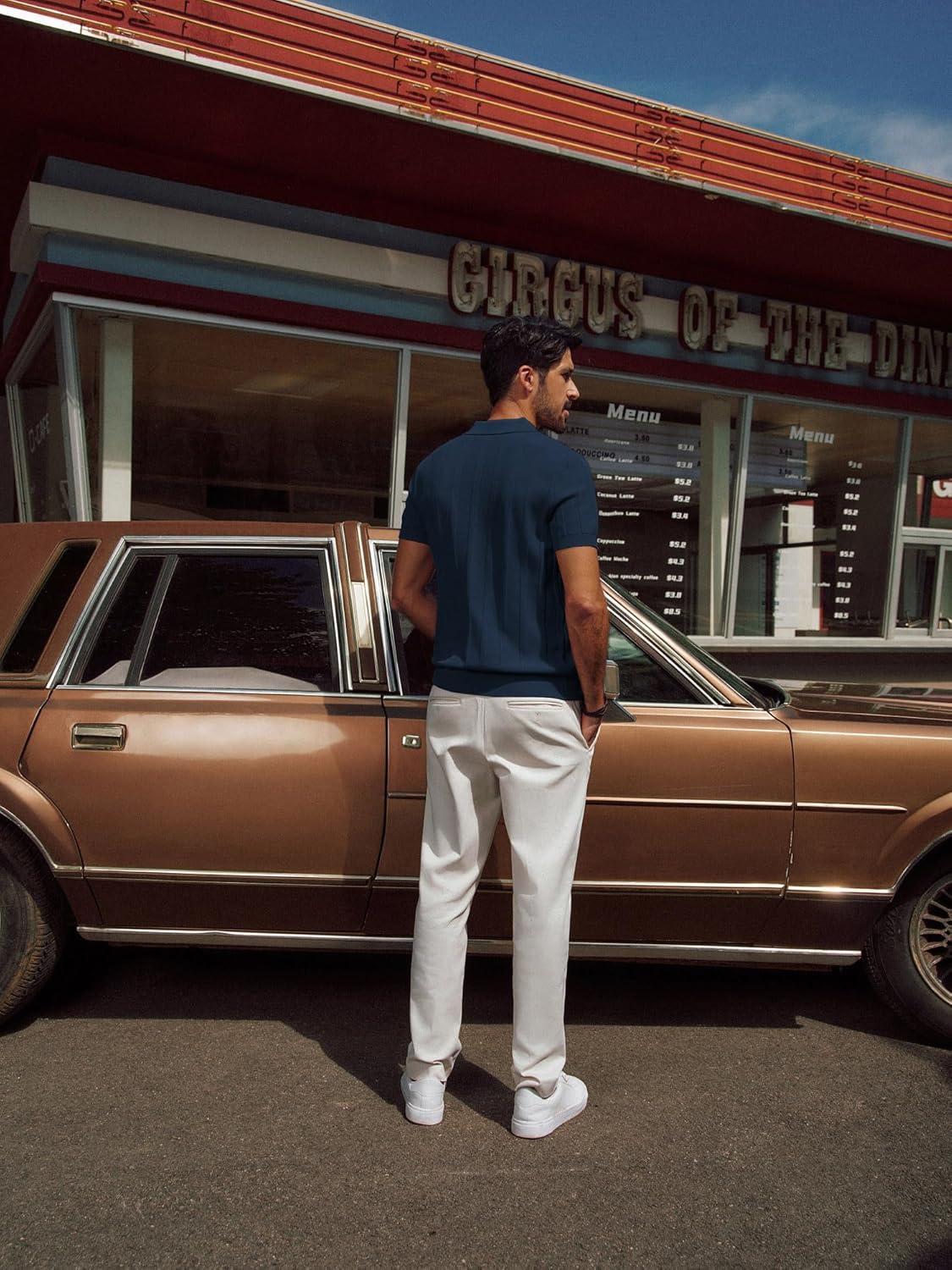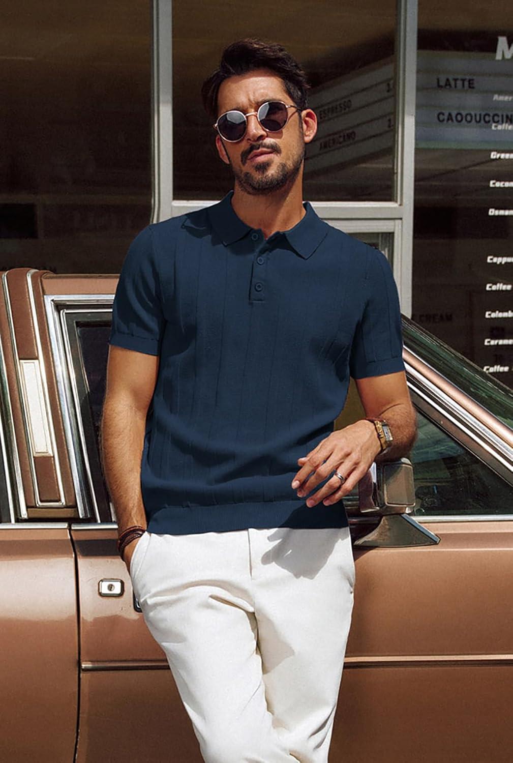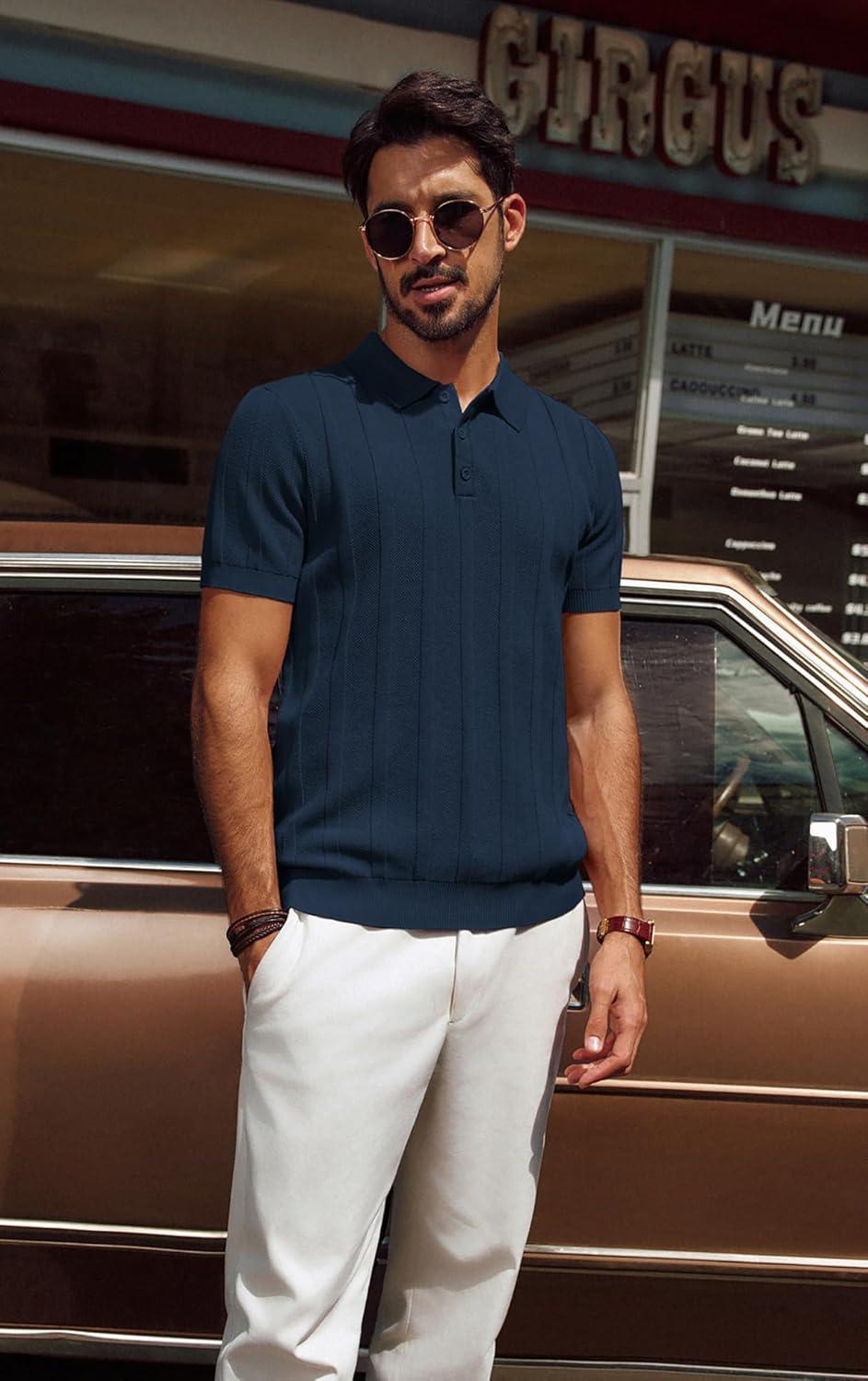 PJ PAUL JONES Mens Polo Shirts Short Sleeve Textured Knit Polo Shirt Ribbed Casual Golf Shirts(Navy Blue)