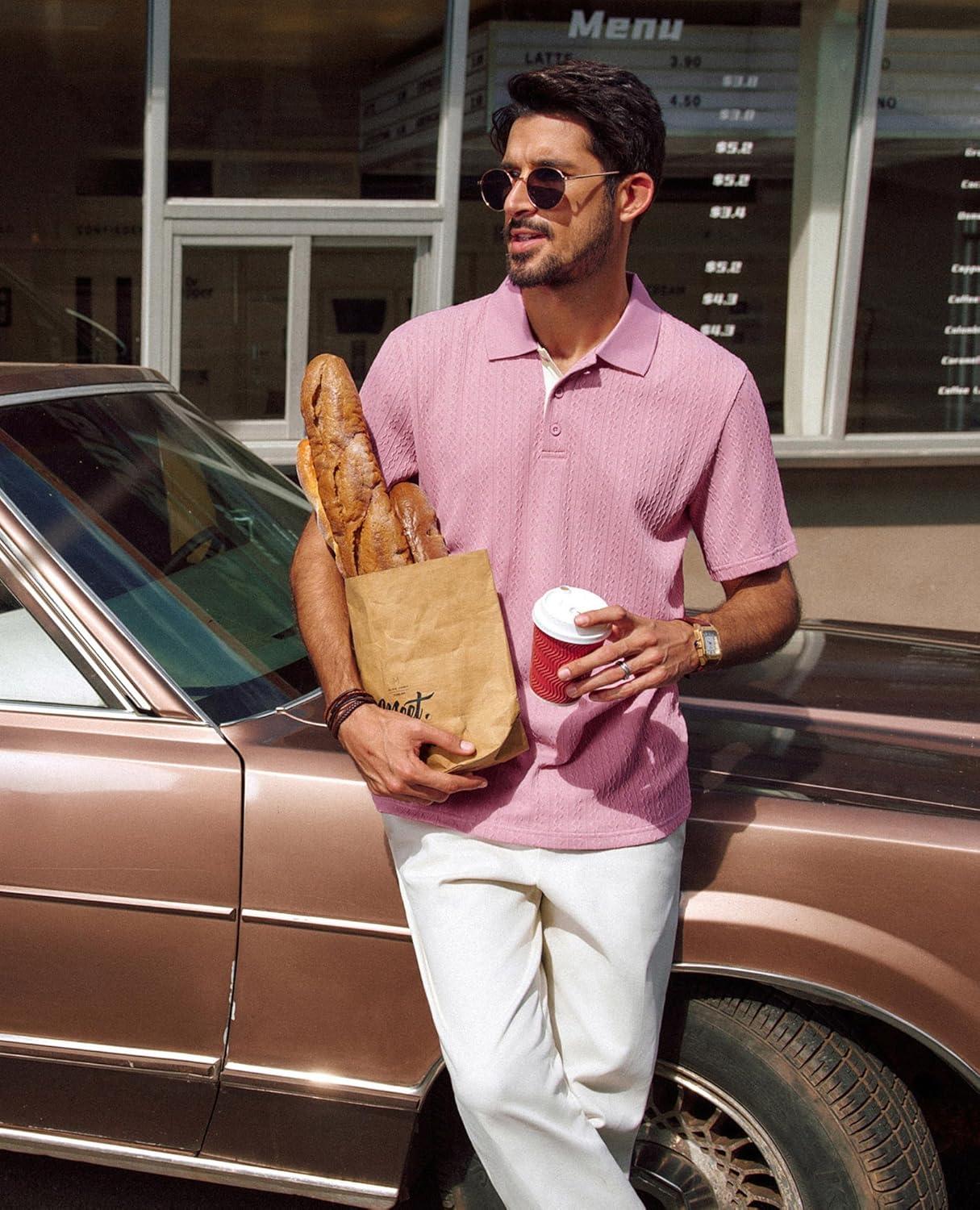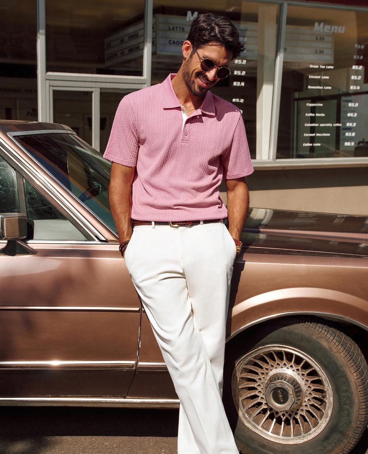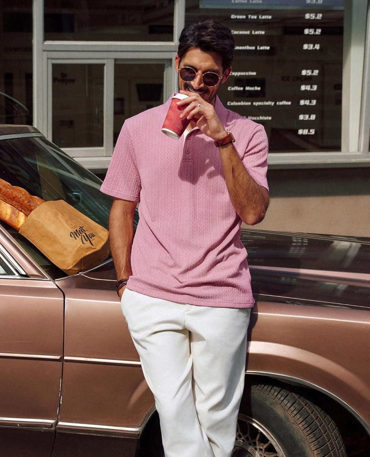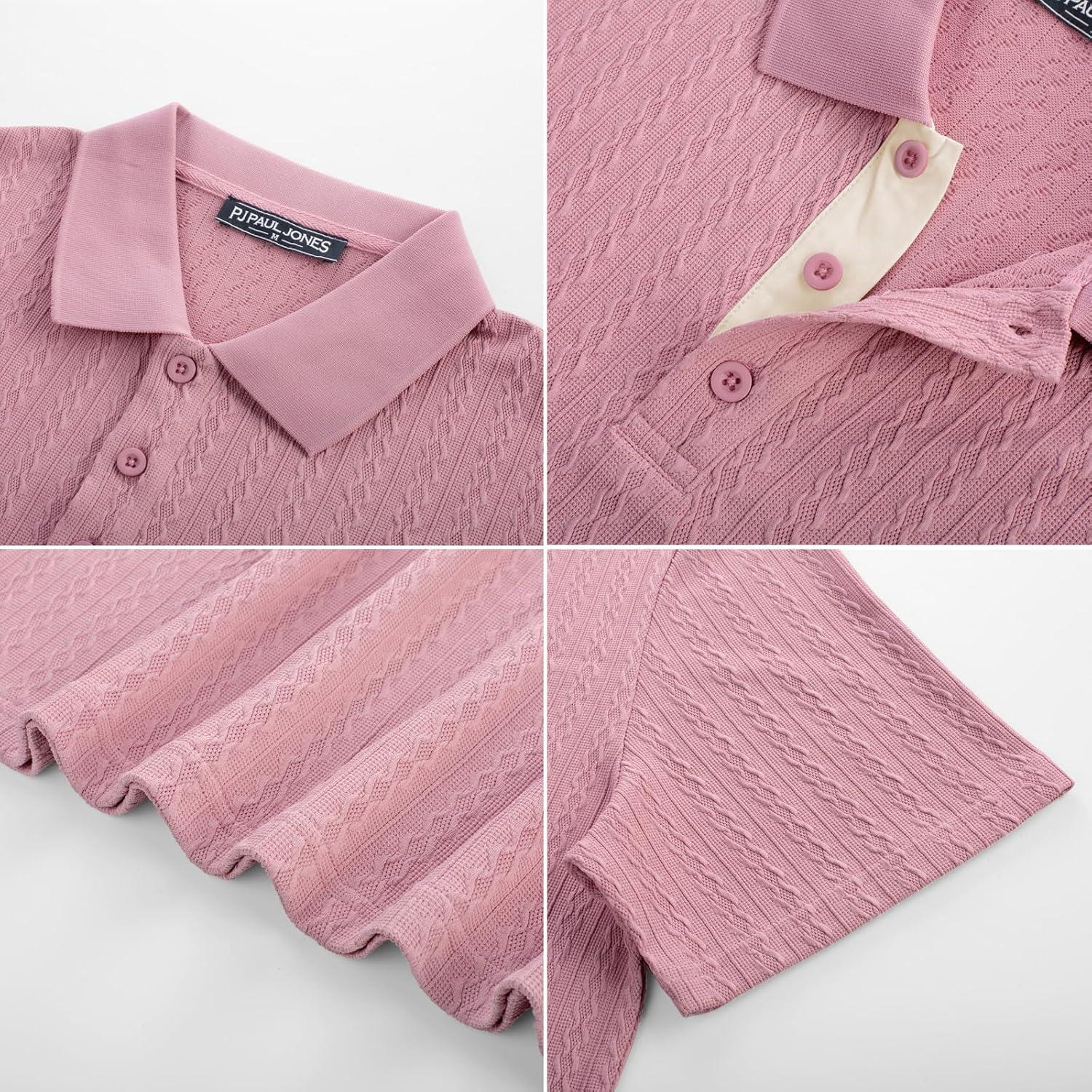 PJ PAUL JONES Mens Polo Shirts Short Sleeve Textured Polo T Shirt Summer Casual Knitted Golf Shirt(Pink)