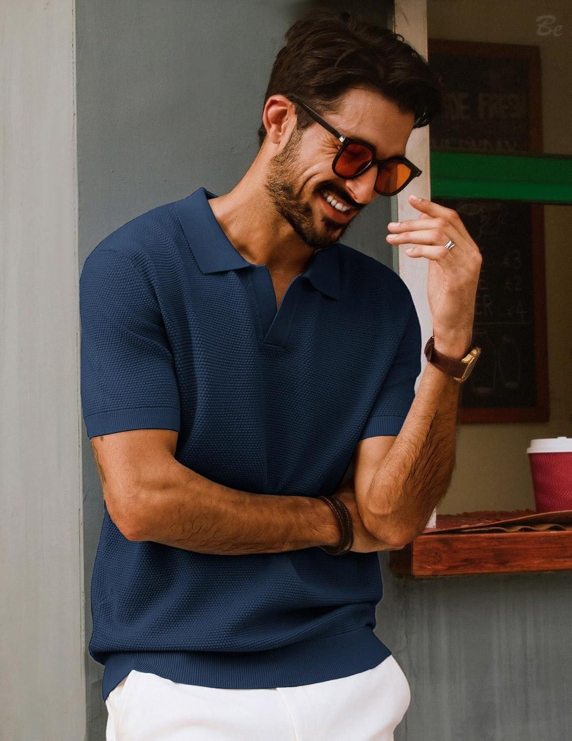 PJ PAUL JONES Mens Polo Shirts Short Sleeve V Neck Knit Textured Polo Knitted Golf Shirt(Royal Blue)