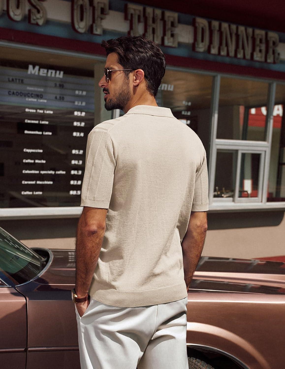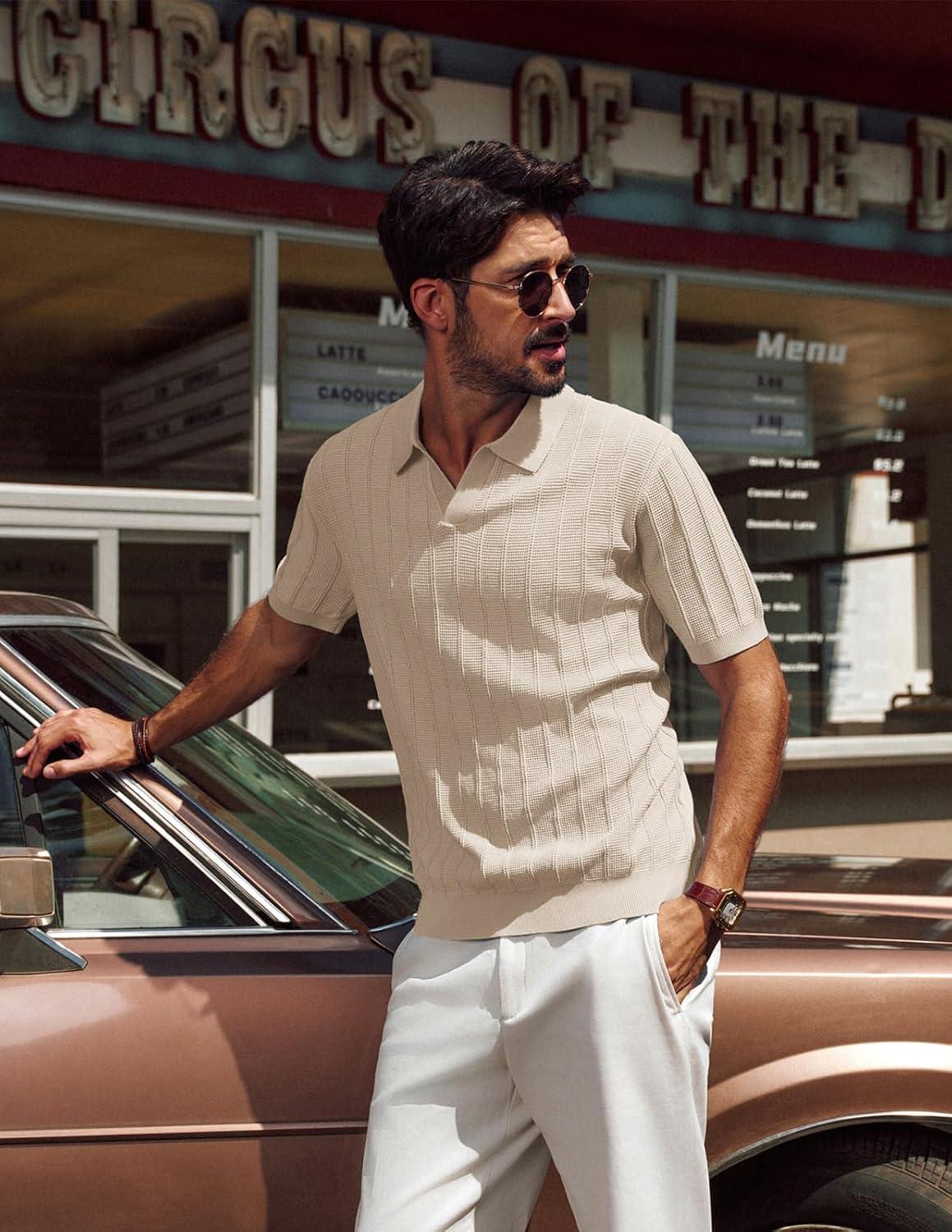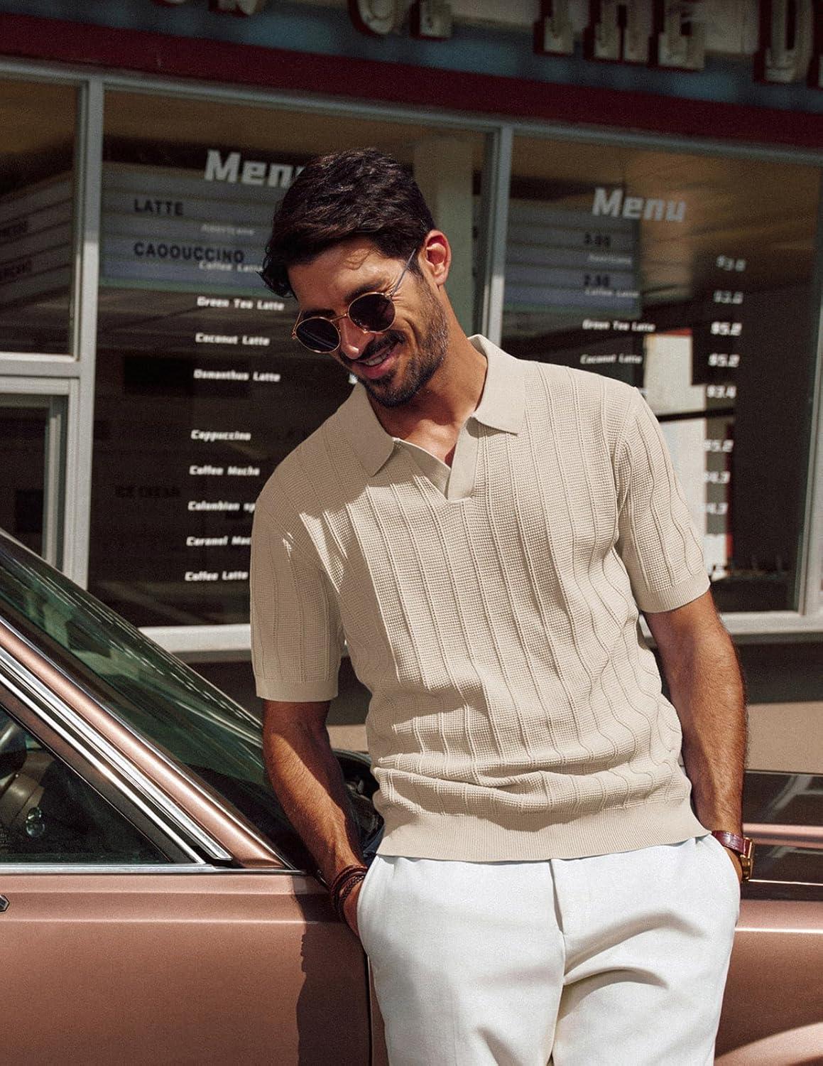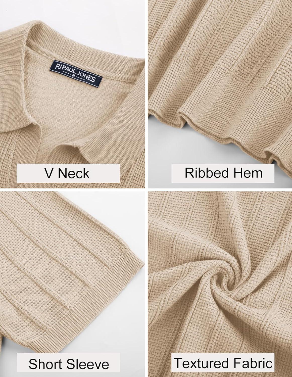 PJ PAUL JONES Mens Polo Shirts V-Neck Knit Polo Textured Summer Shirts(Apricot)