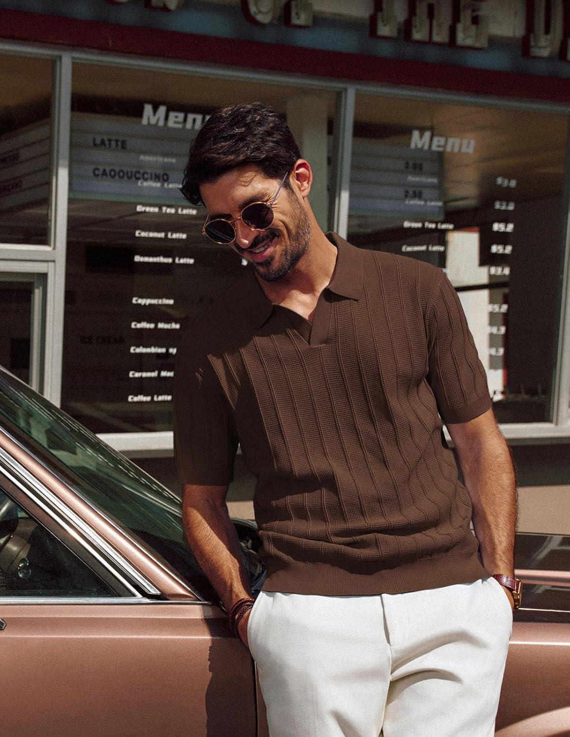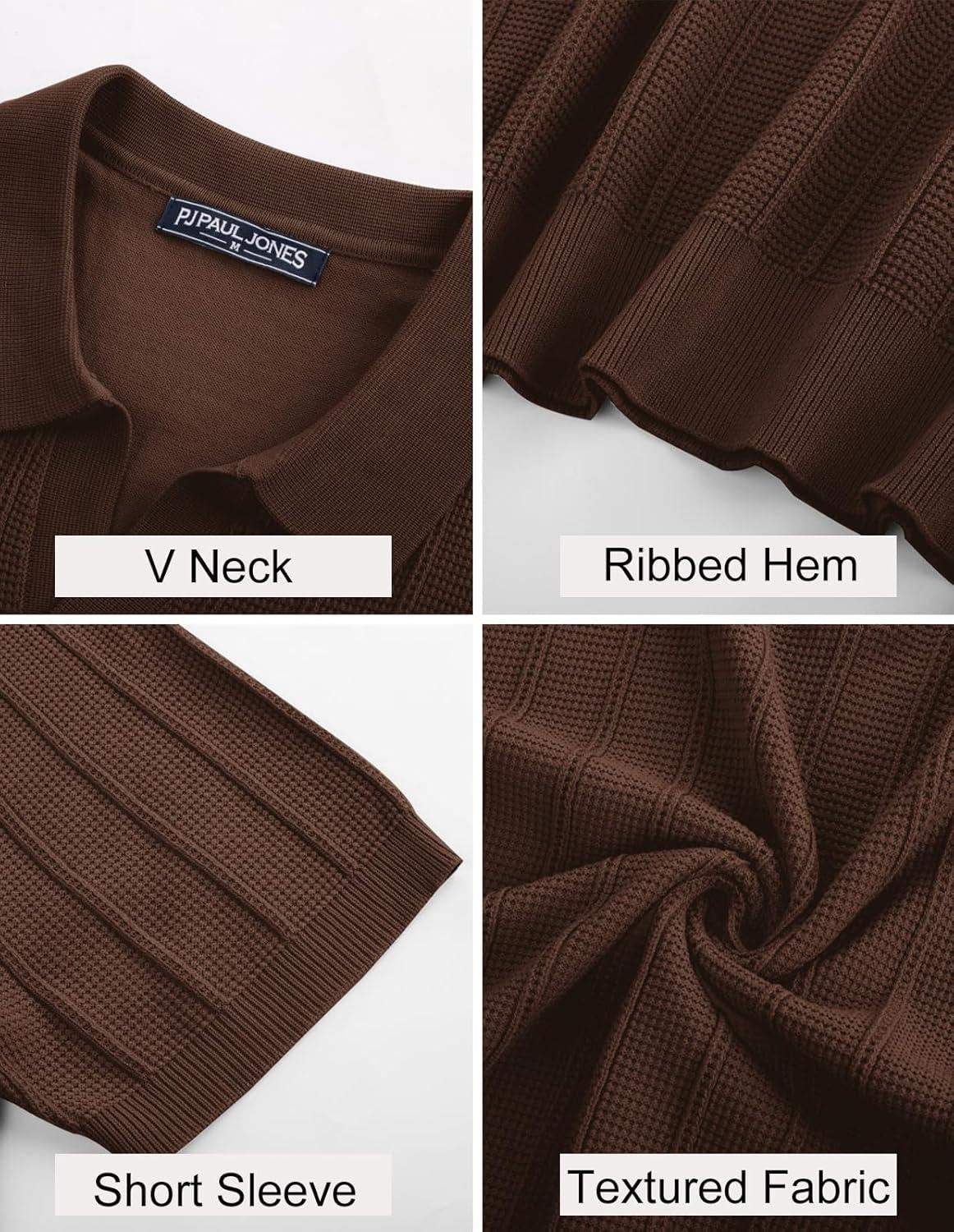 PJ PAUL JONES Mens Polo Shirts V-Neck Knit Polo Textured Summer Shirts(Coffee)