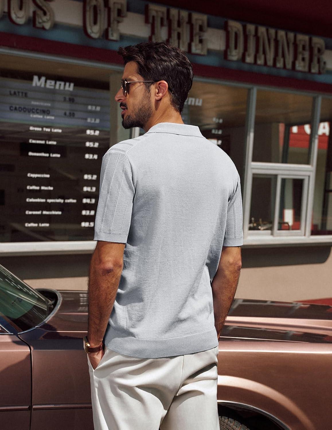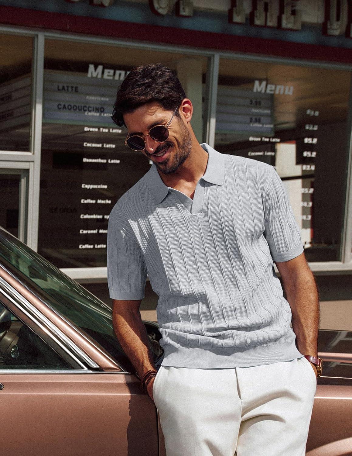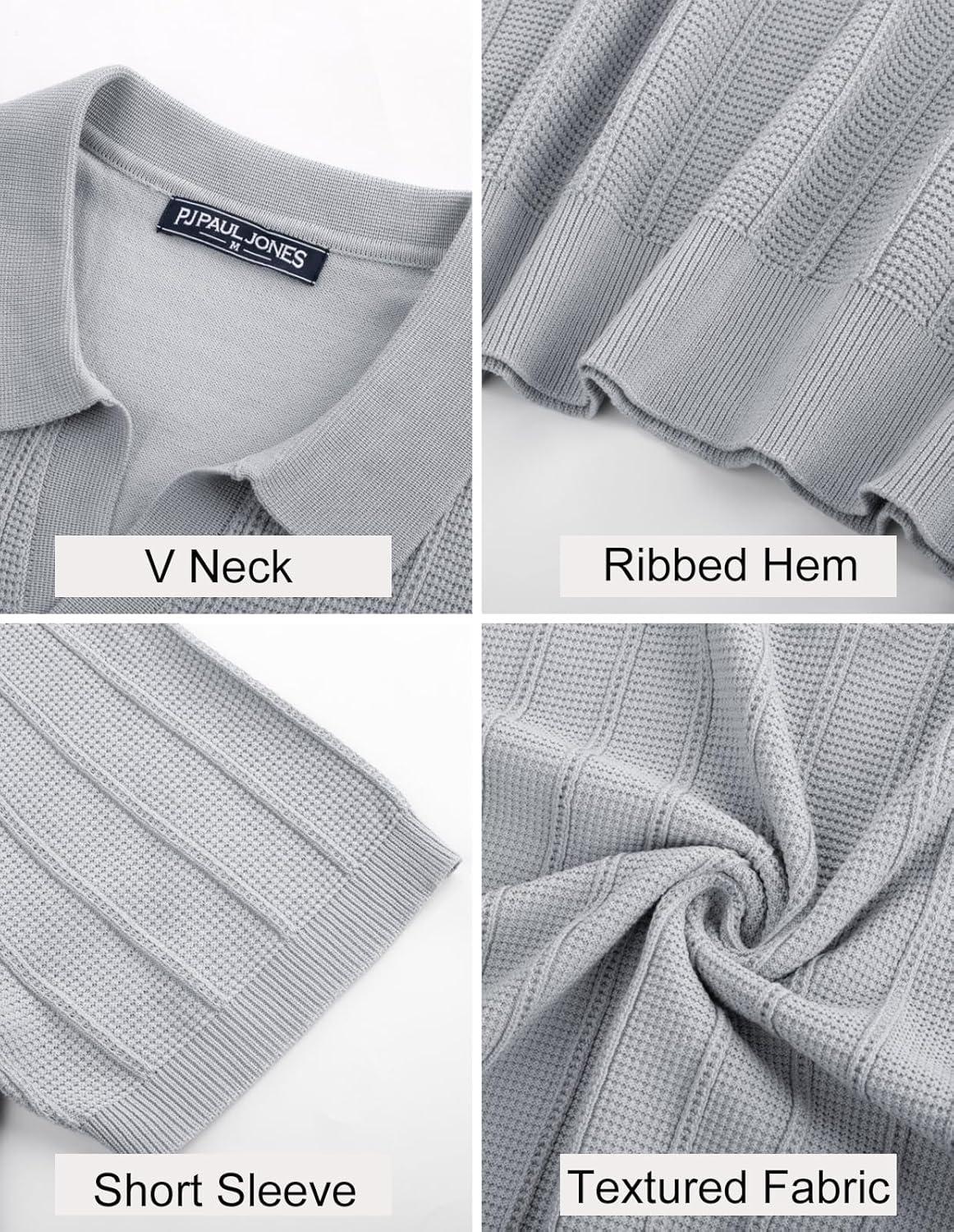PJ PAUL JONES Mens Polo Shirts V-Neck Knit Polo Textured Summer Shirts(Light Grey)