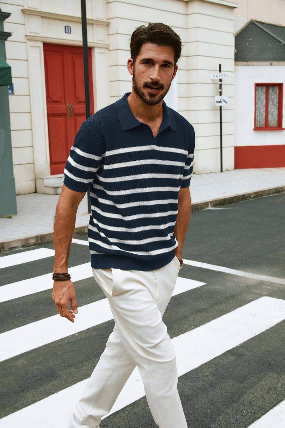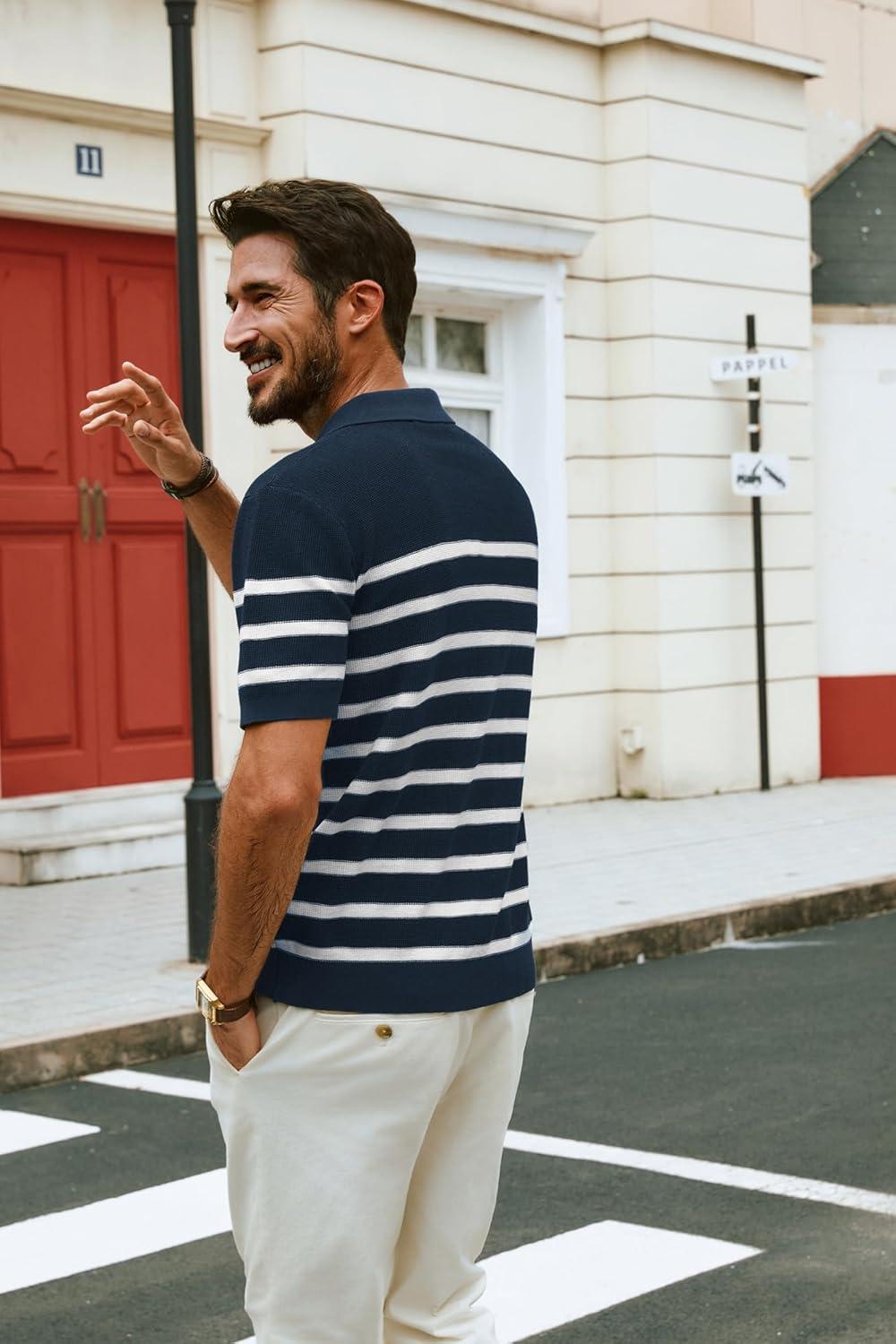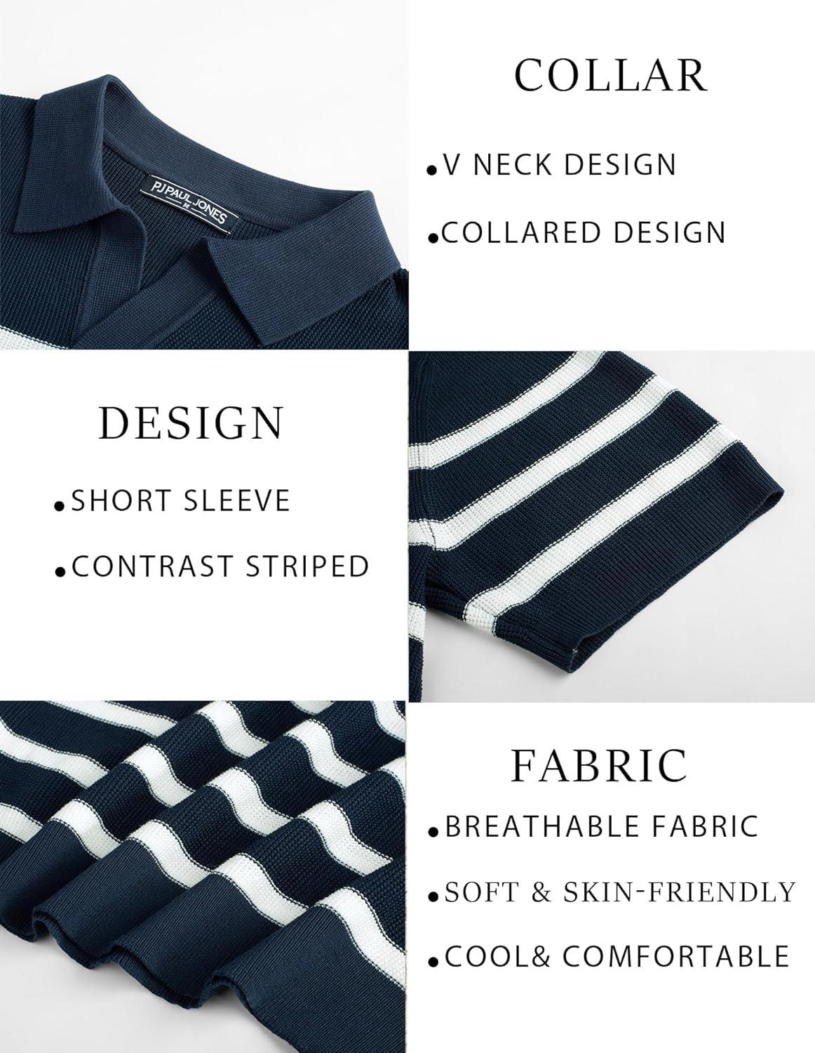 PJ PAUL JONES Mens Polo Shirts V-Neck Knit Polo Textured Summer Shirts(Navy Blue-stripe)