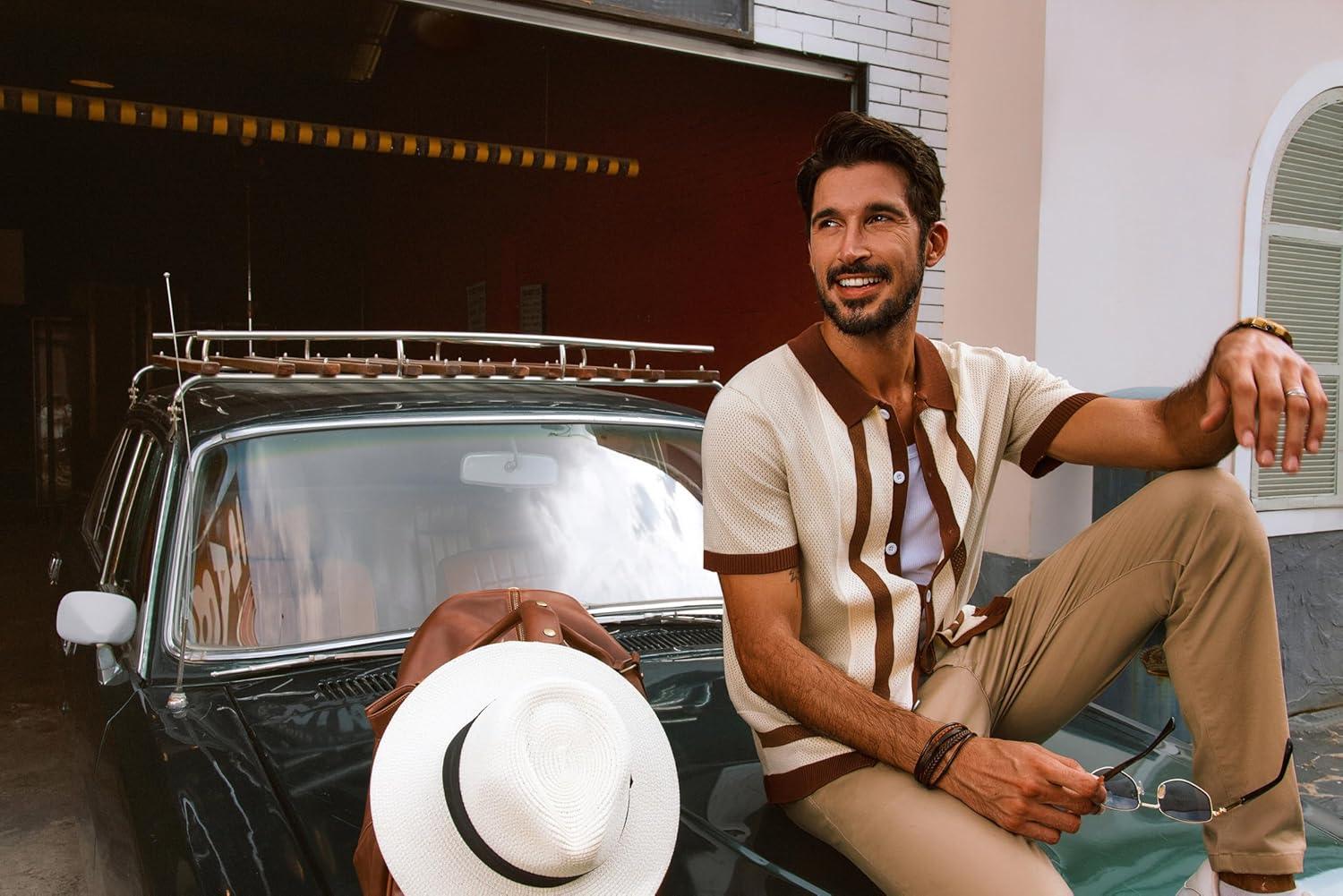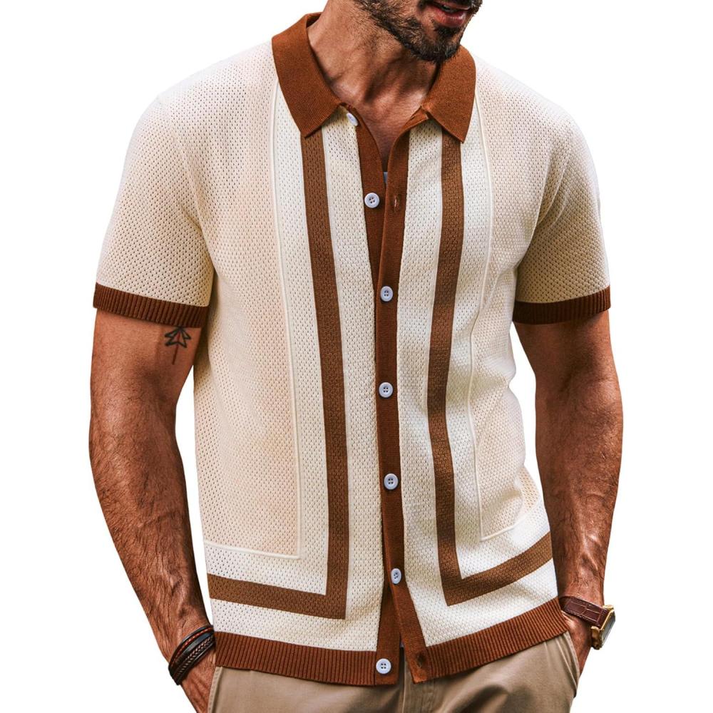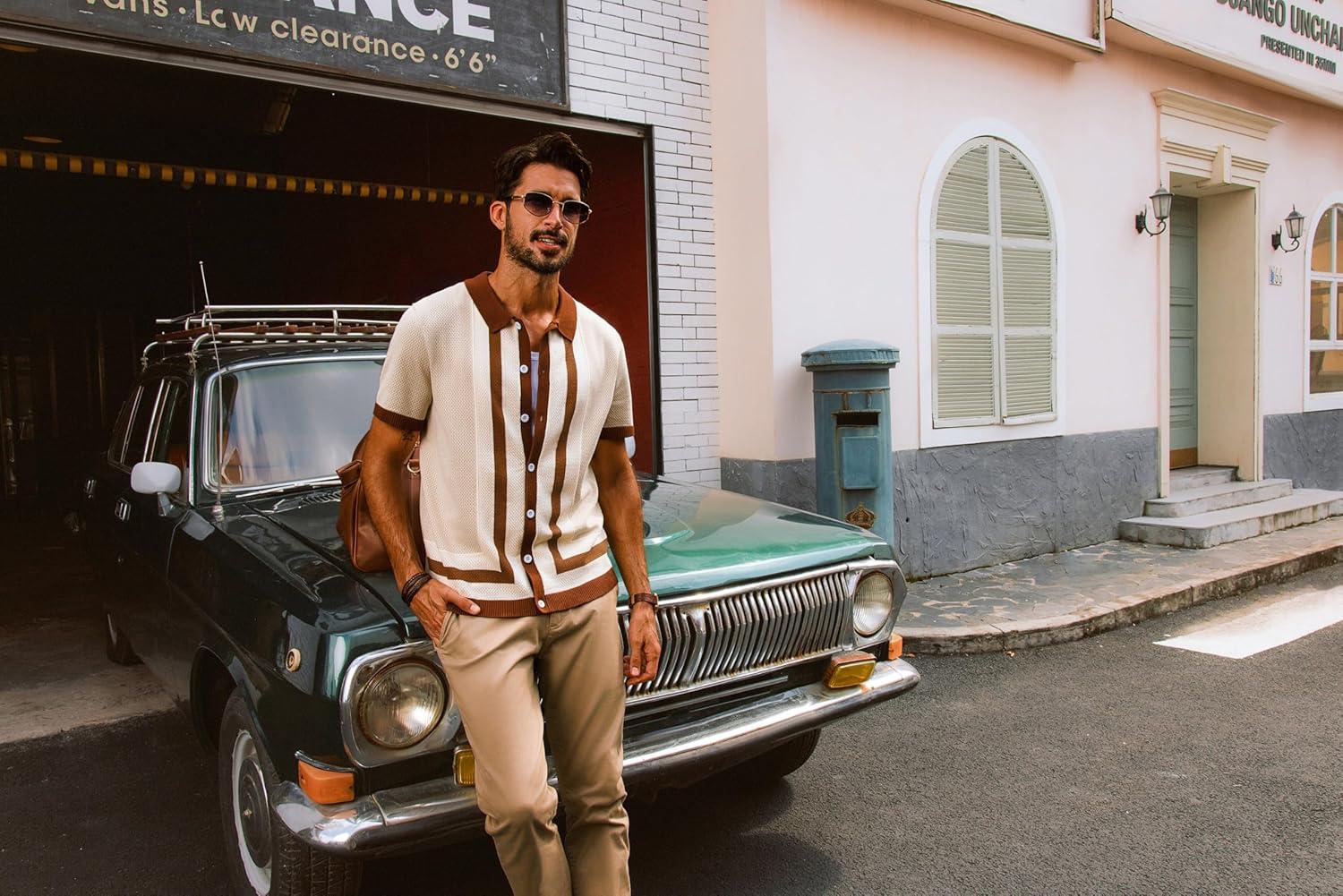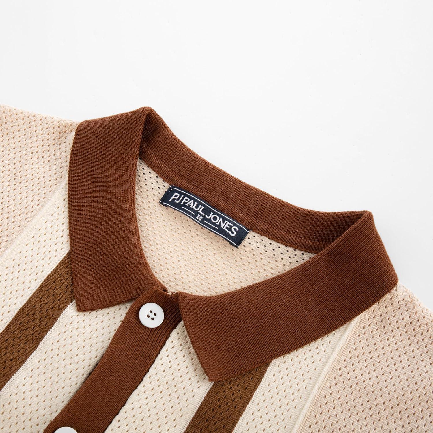 PJ PAUL JONES Mens Polo Shirts Vintage Striped Button Down Knitted Golf Shirts(Apricot-vintage)