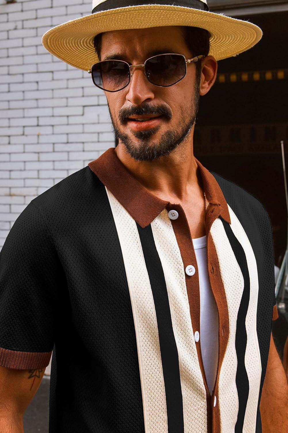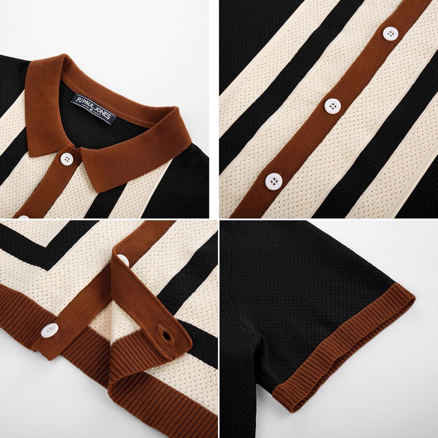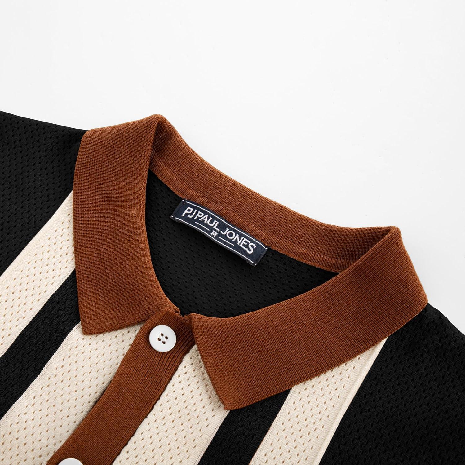 PJ PAUL JONES Mens Polo Shirts Vintage Striped Button Down Knitted Golf Shirts(Black-vintage)