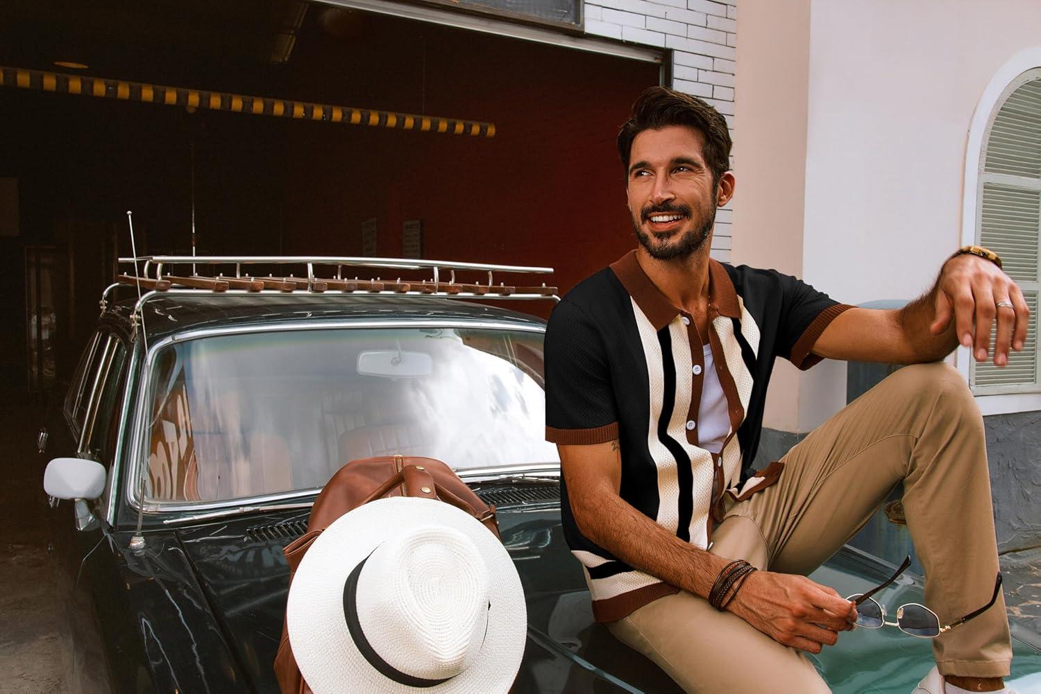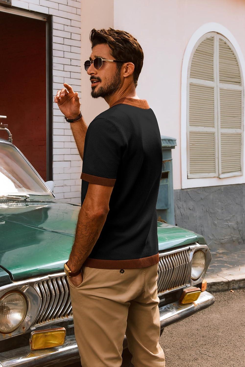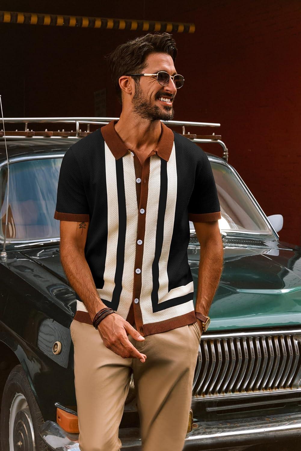 PJ PAUL JONES Mens Polo Shirts Vintage Striped Button Down Knitted Golf Shirts(Black-vintage)