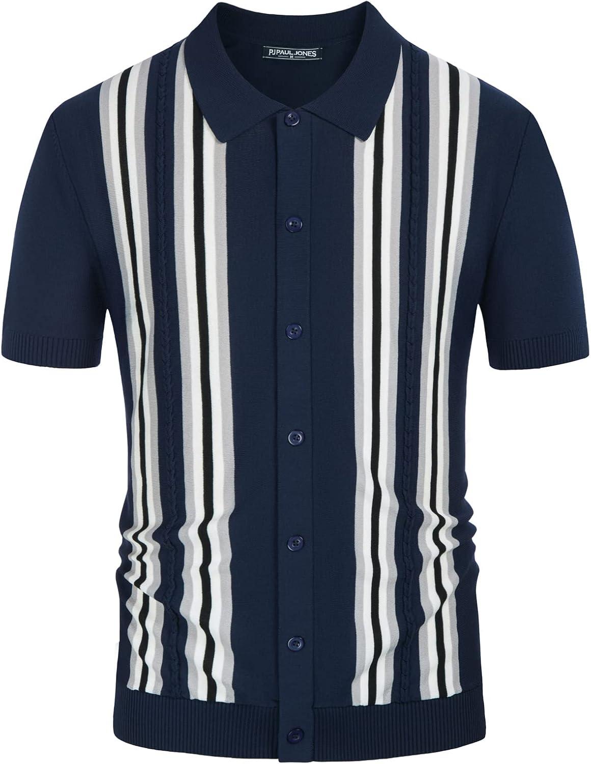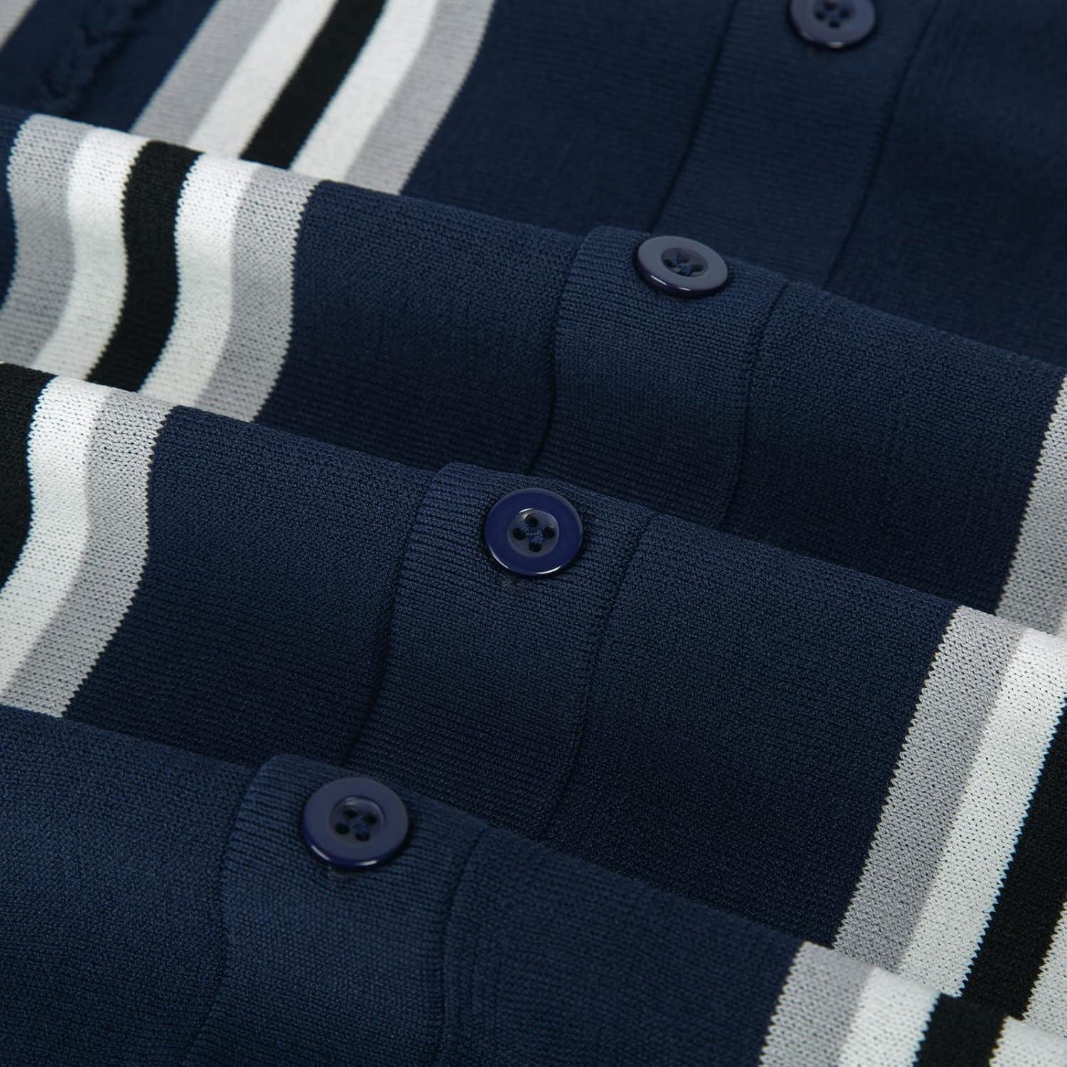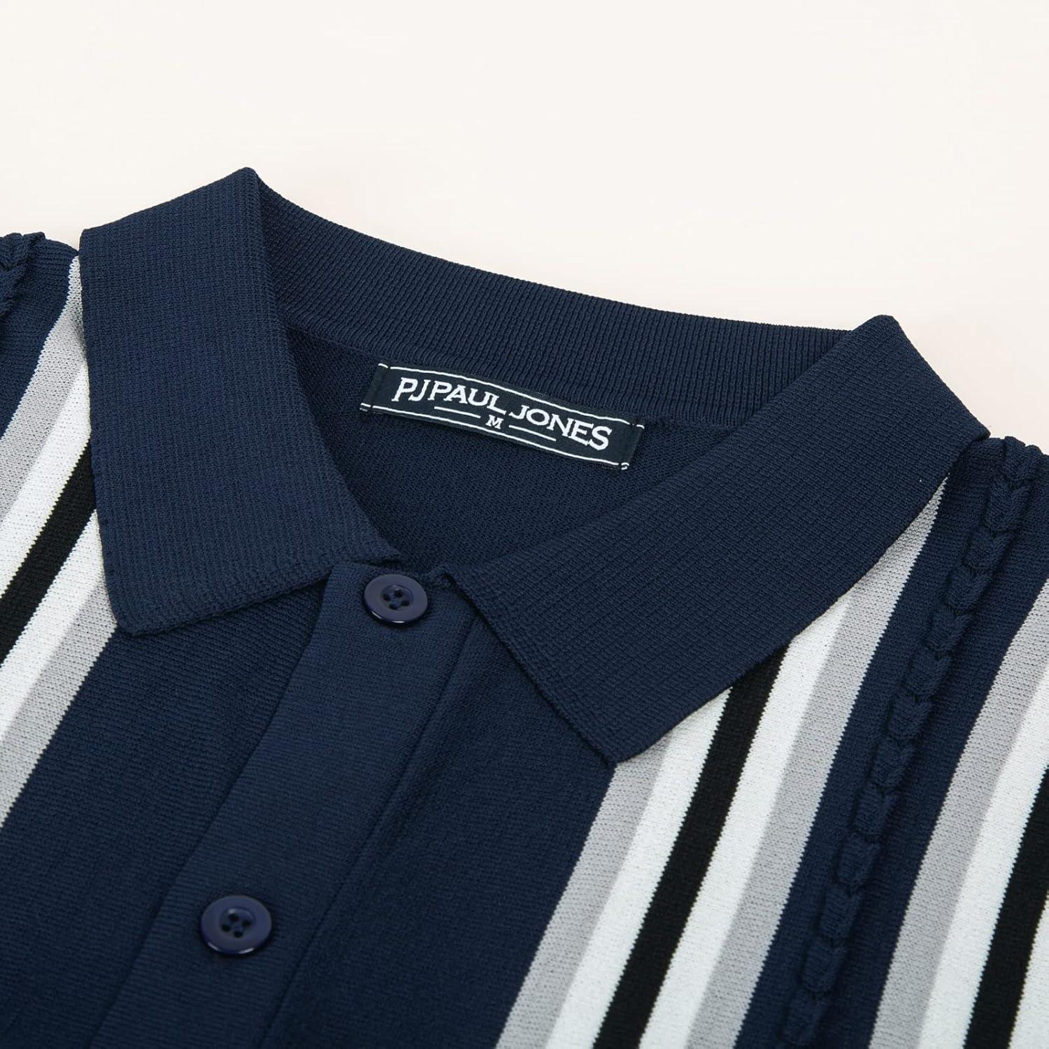 PJ PAUL JONES Mens Polo Shirts Vintage Striped Button Down Knitted Golf Shirts(Navy Blue)