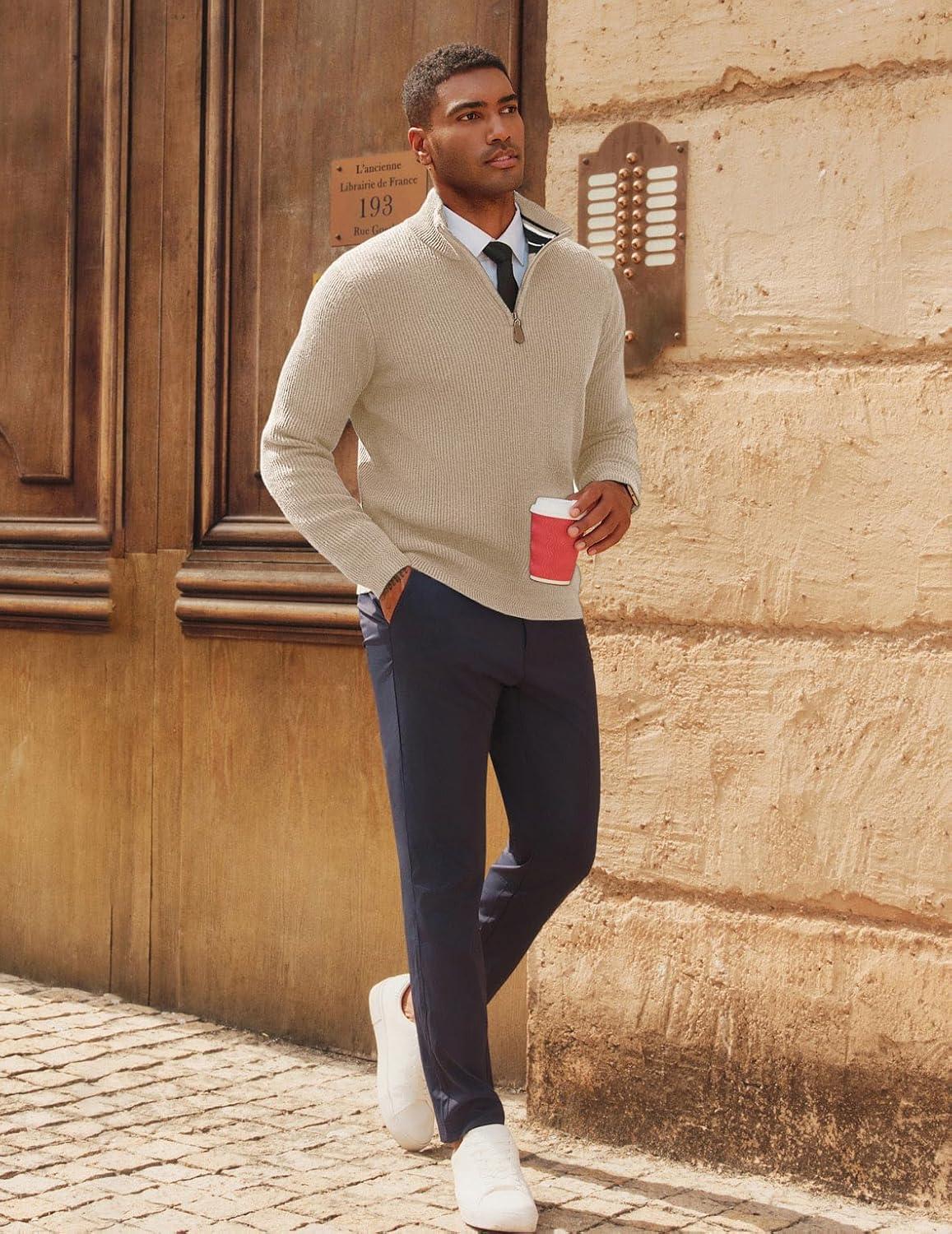 PJ PAUL JONES Mens Quarter Zip Pullover Sweaters Casual Slim Fit Lightweight Knit Sweater(Apricot)