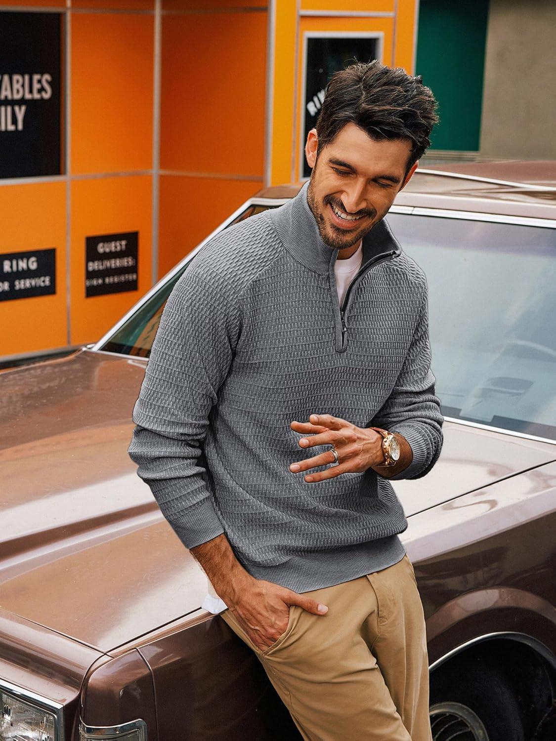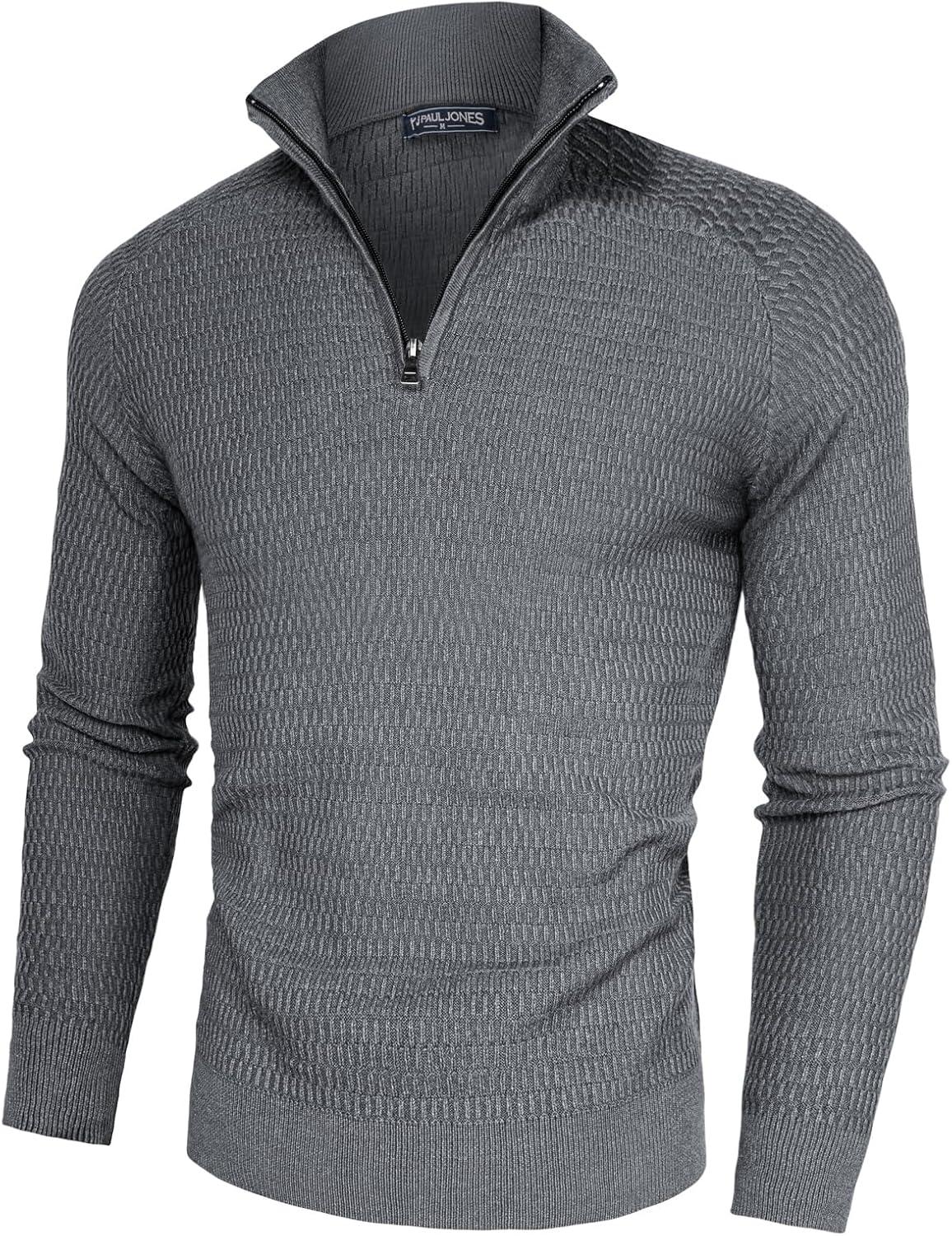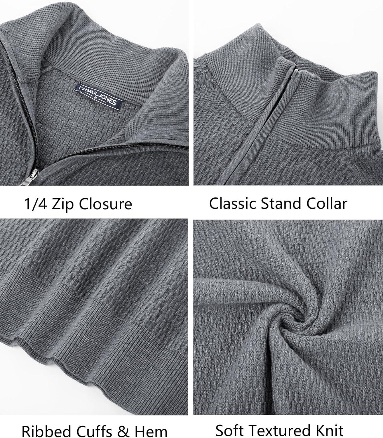 PJ PAUL JONES Men’s Quarter Zip Sweaters Slim Fit Long Sleeve Casual Pullover Sweater Knit Textured Mock Neck Polo Sweaters(Grey)