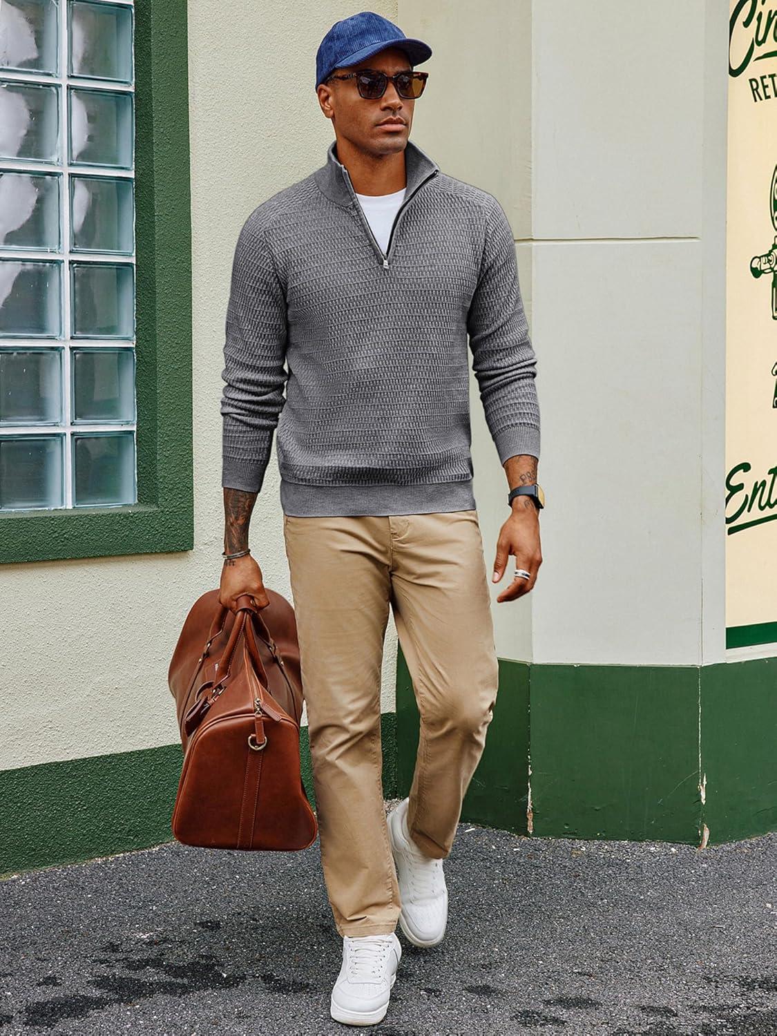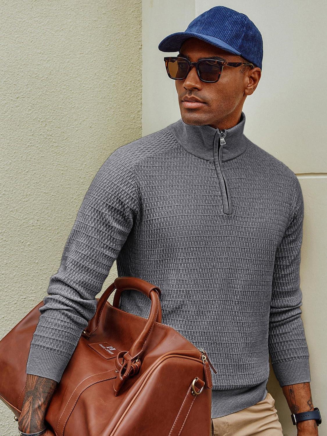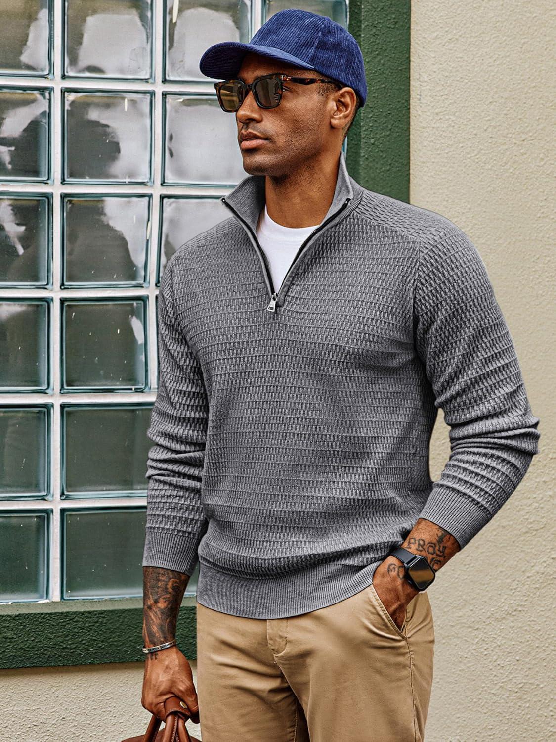 PJ PAUL JONES Men’s Quarter Zip Sweaters Slim Fit Long Sleeve Casual Pullover Sweater Knit Textured Mock Neck Polo Sweaters(Grey)