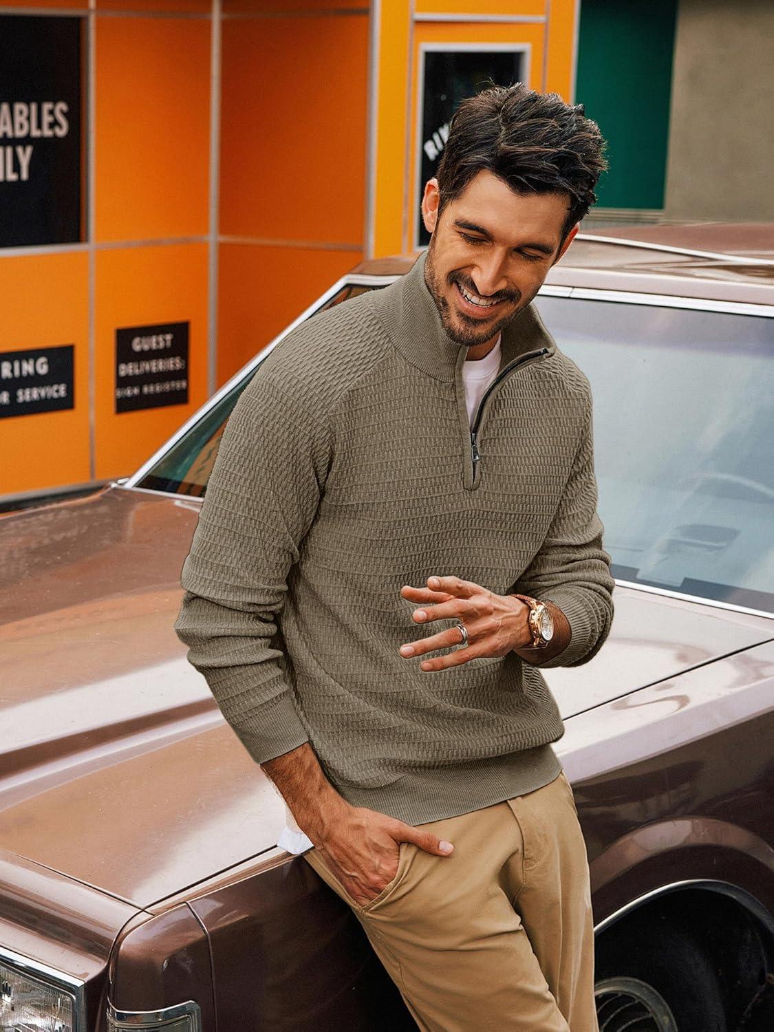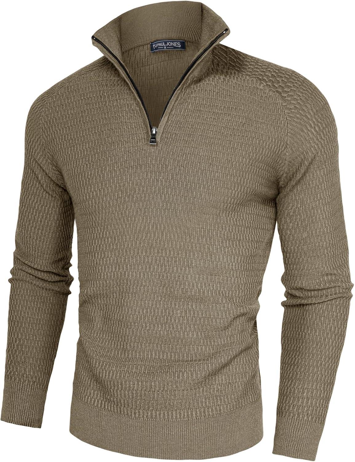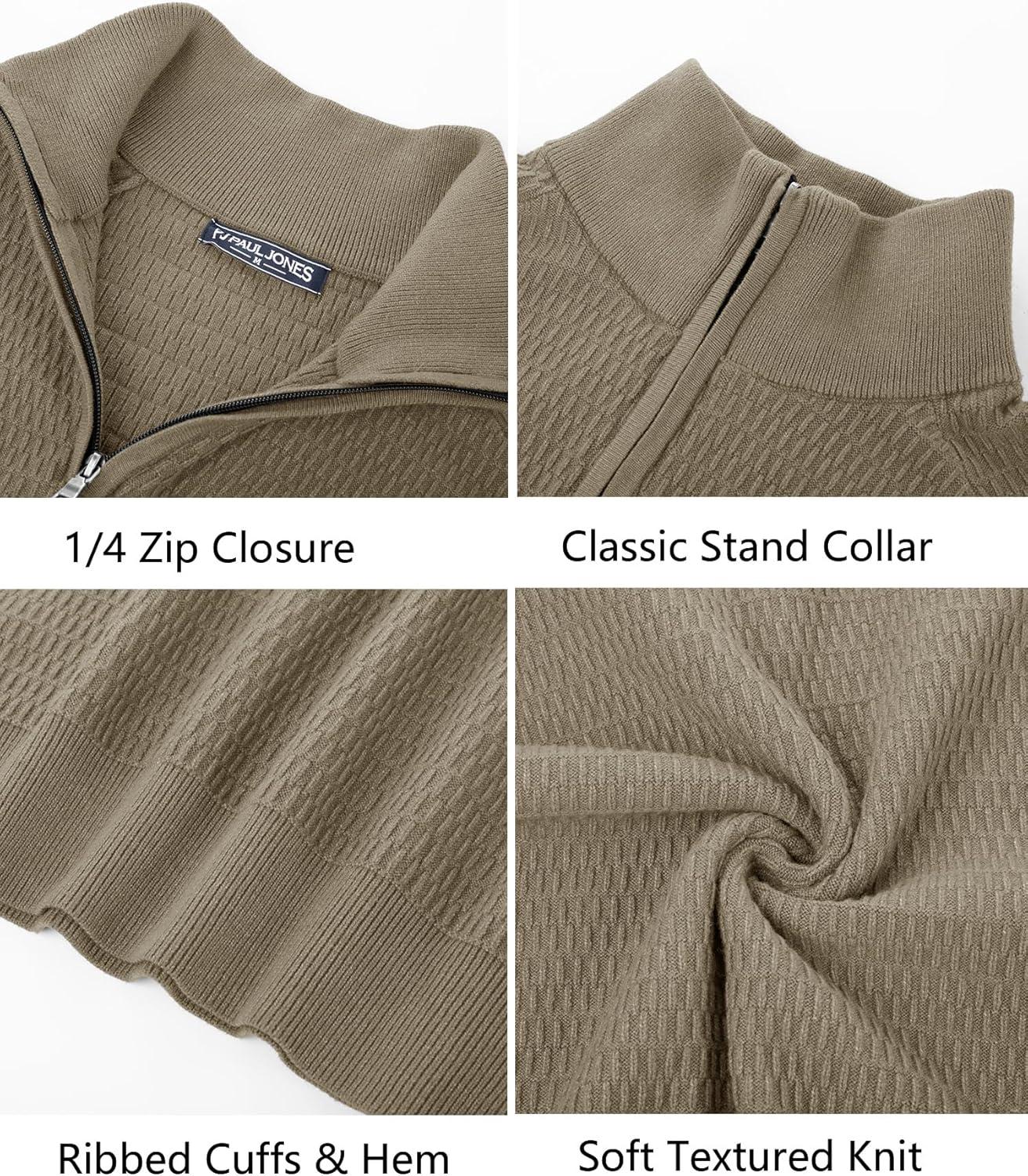 PJ PAUL JONES Men’s Quarter Zip Sweaters Slim Fit Long Sleeve Casual Pullover Sweater Knit Textured Mock Neck Polo Sweaters(Khaki)
