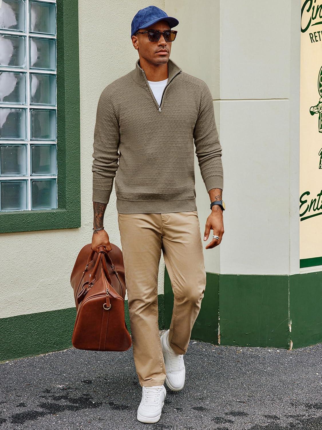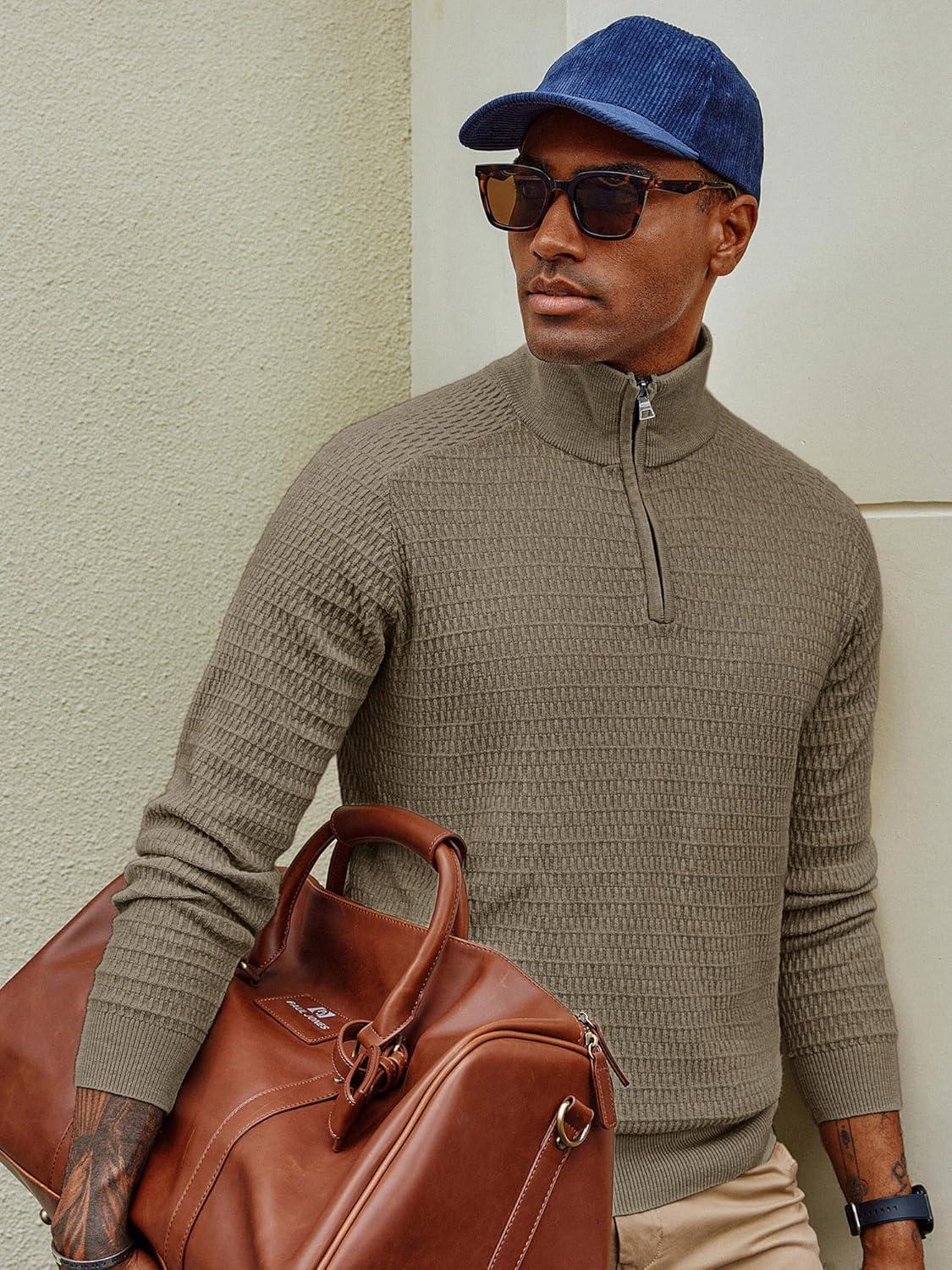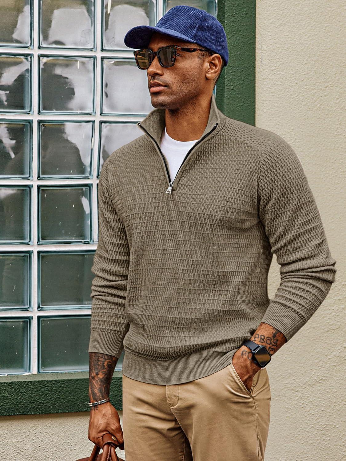 PJ PAUL JONES Men’s Quarter Zip Sweaters Slim Fit Long Sleeve Casual Pullover Sweater Knit Textured Mock Neck Polo Sweaters(Khaki)