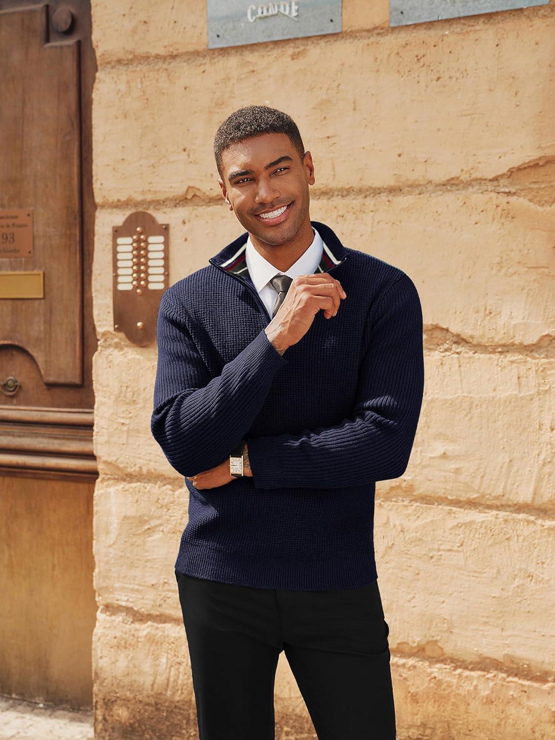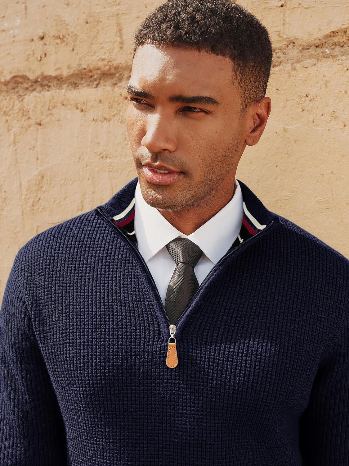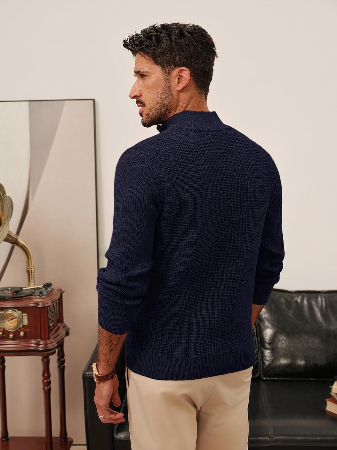 PJ PAUL JONES Men’s Quarter Zip Sweaters Slim Fit Long Sleeve Casual Pullover Sweater Knit Textured Mock Neck Polo Sweaters(Navy Blue Waffle)