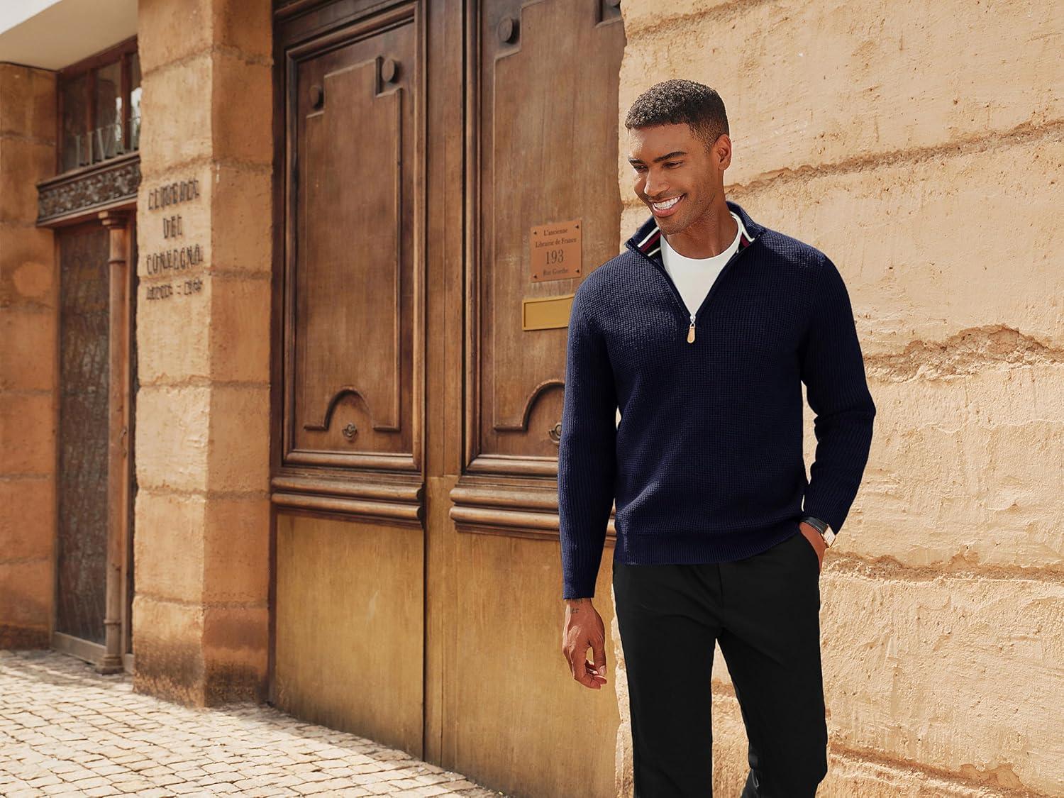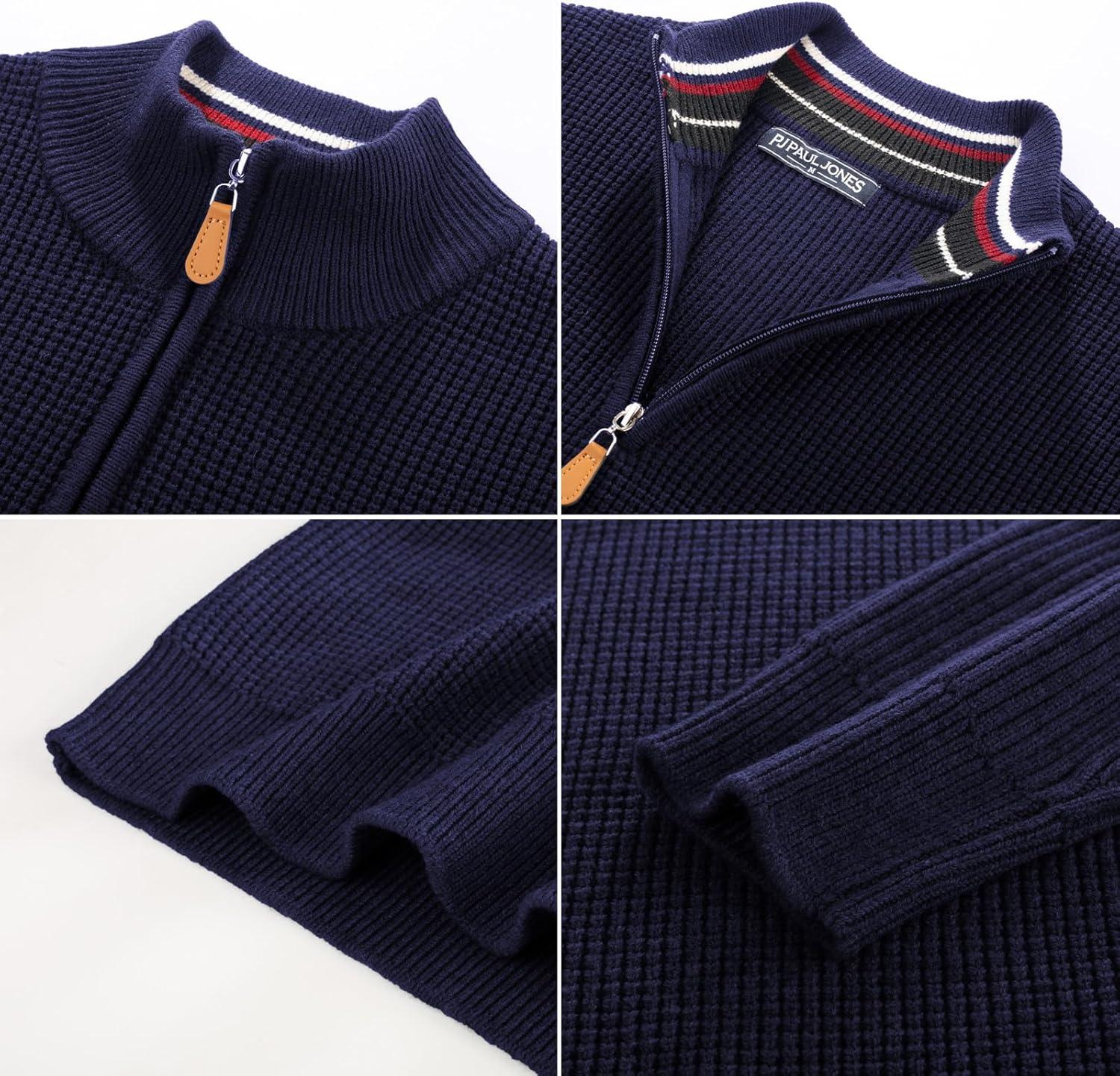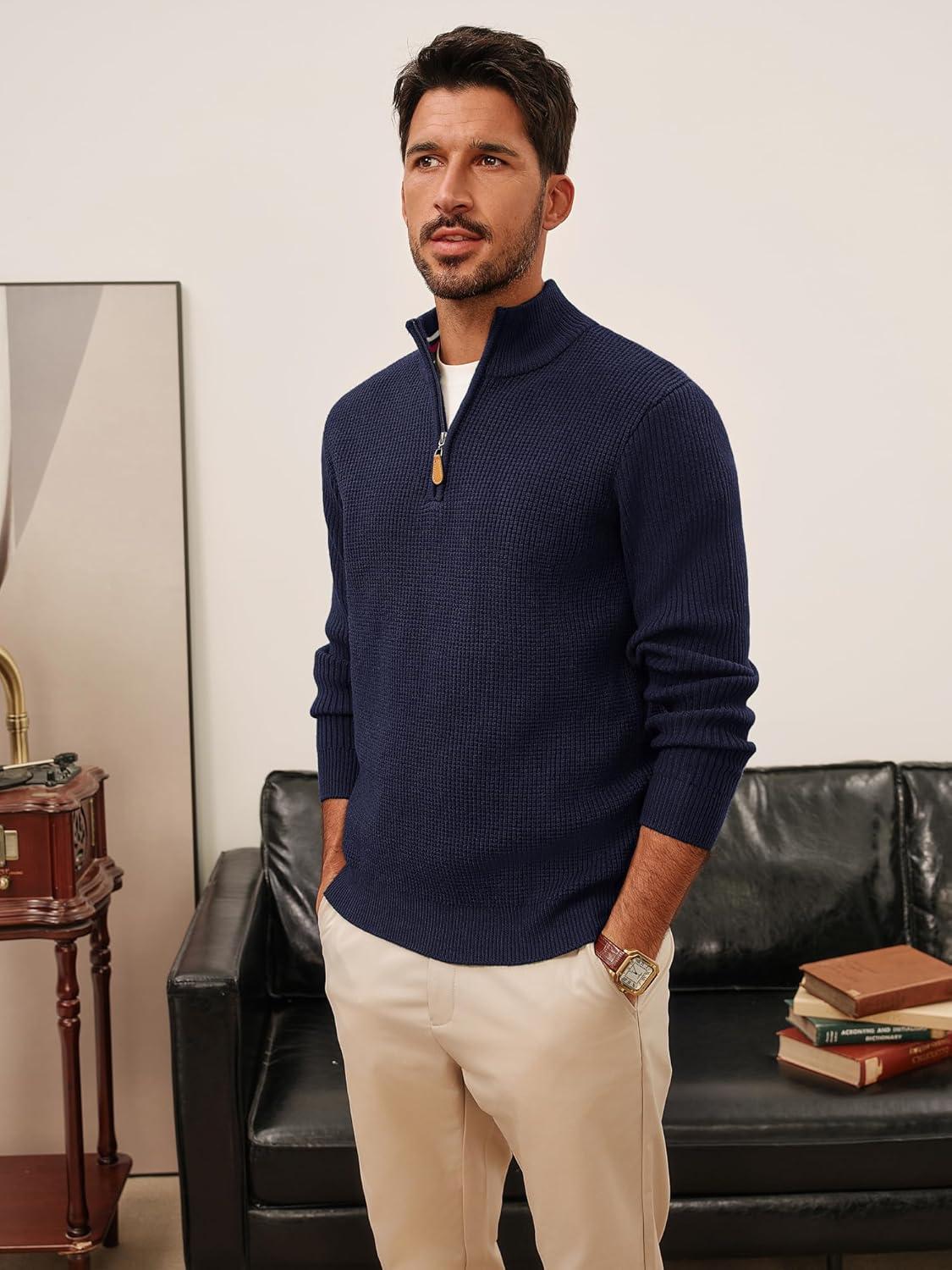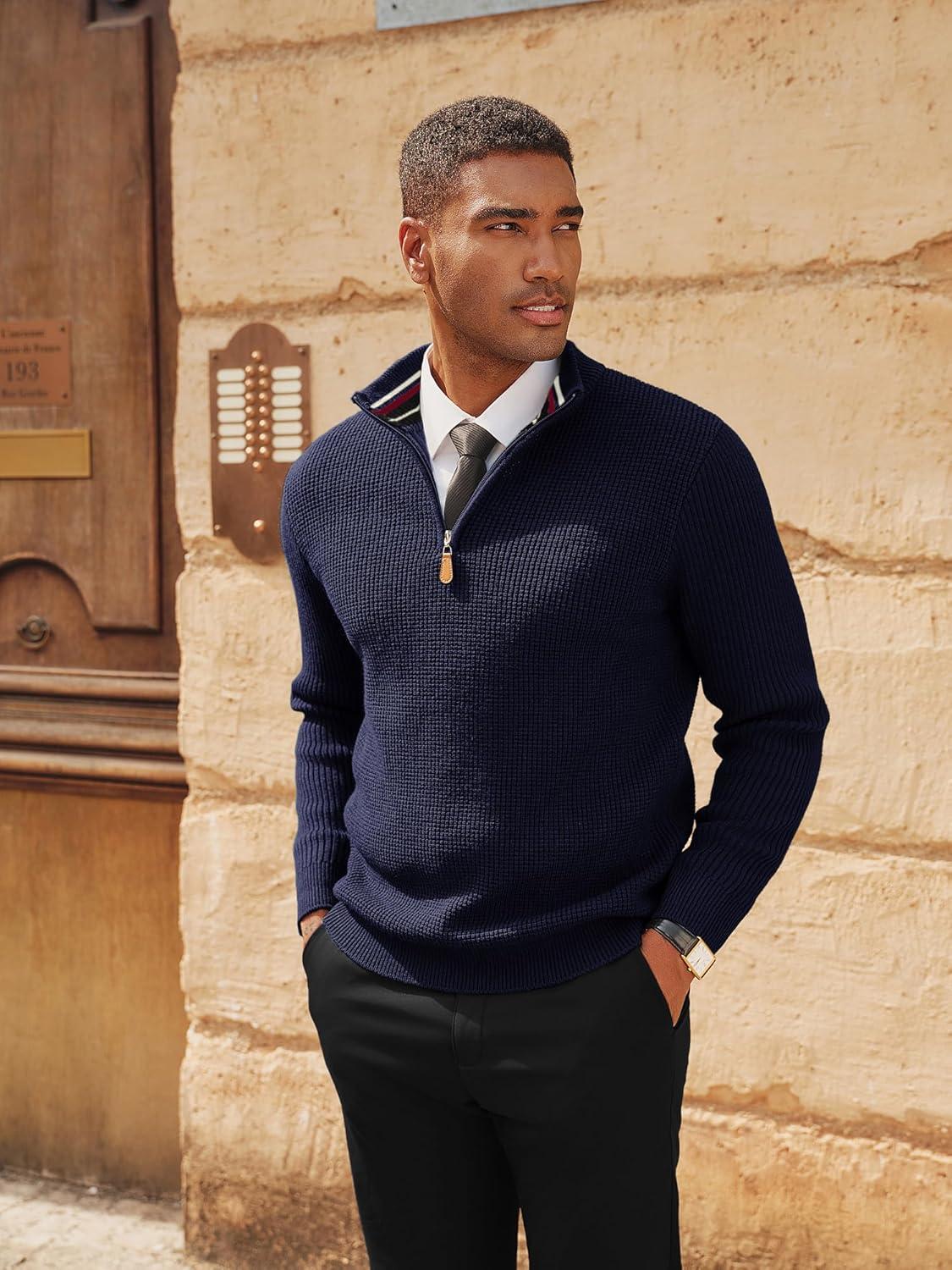 PJ PAUL JONES Men’s Quarter Zip Sweaters Slim Fit Long Sleeve Casual Pullover Sweater Knit Textured Mock Neck Polo Sweaters(Navy Blue Waffle)