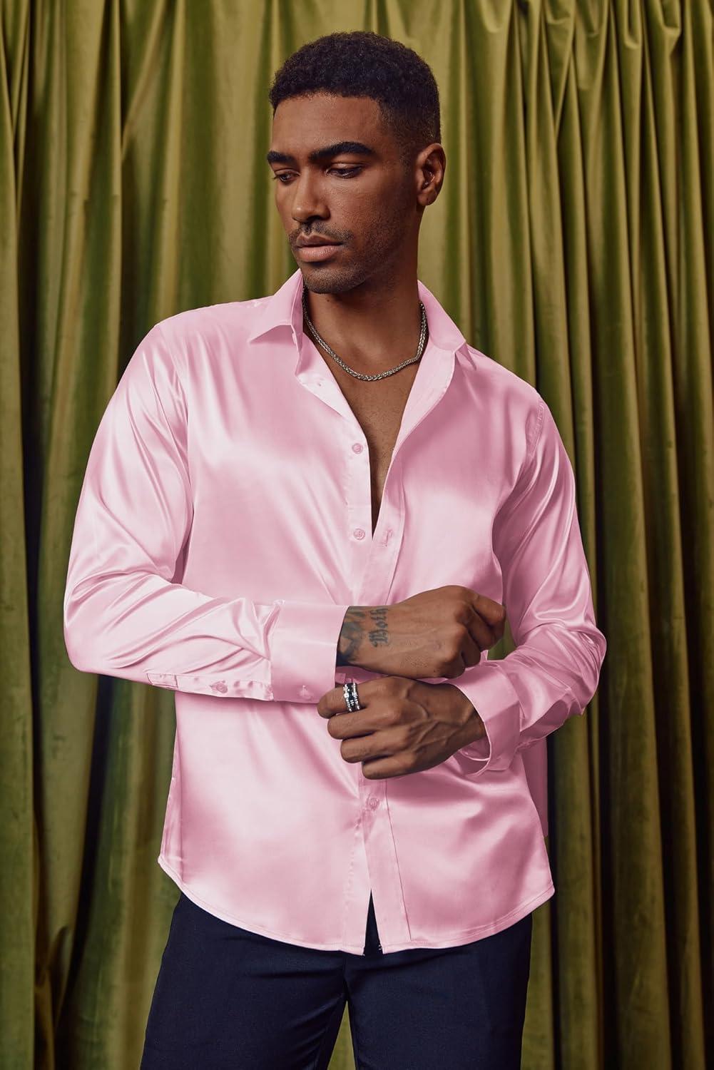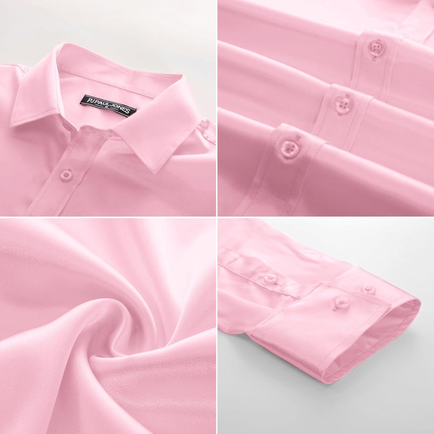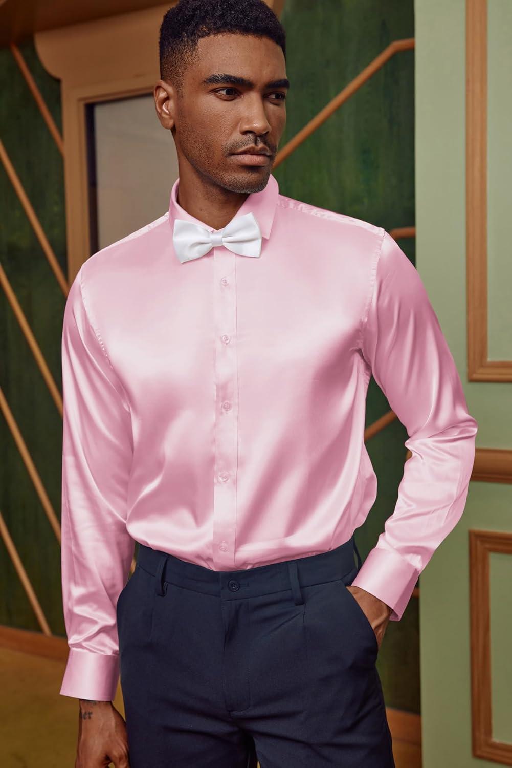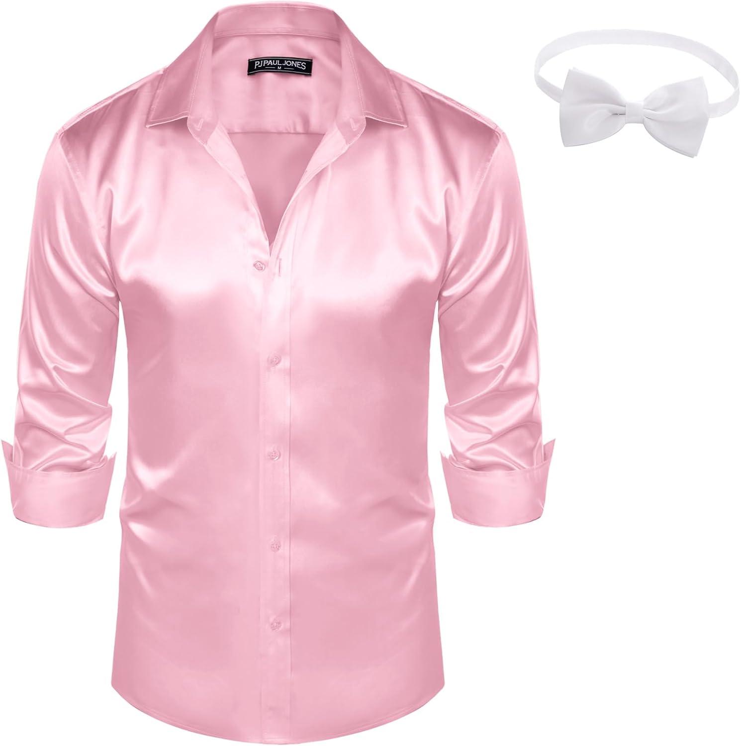 PJ PAUL JONES Men’s Shiny Satin Dress Shirts Long Sleeve Button Down Silk Shirt with Bow Tie(Pink)