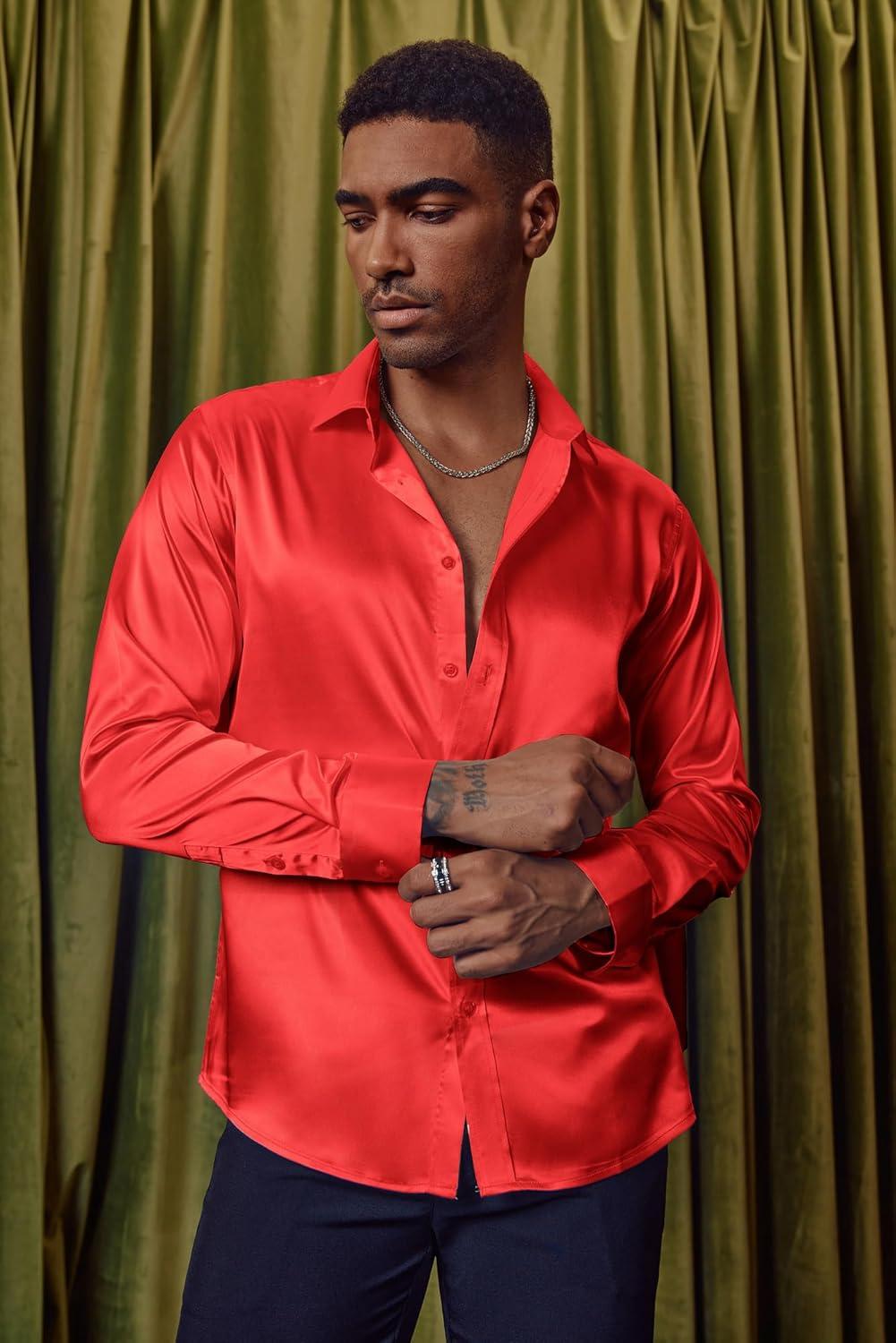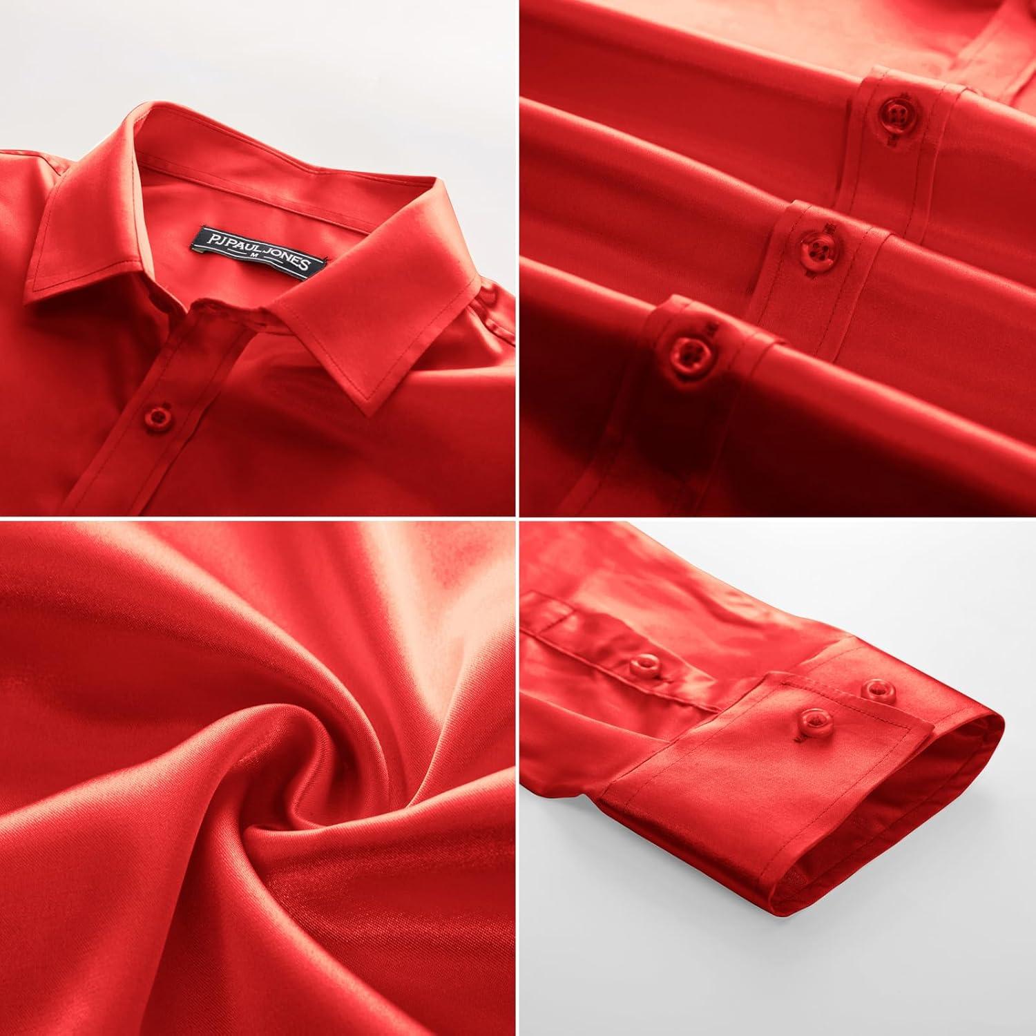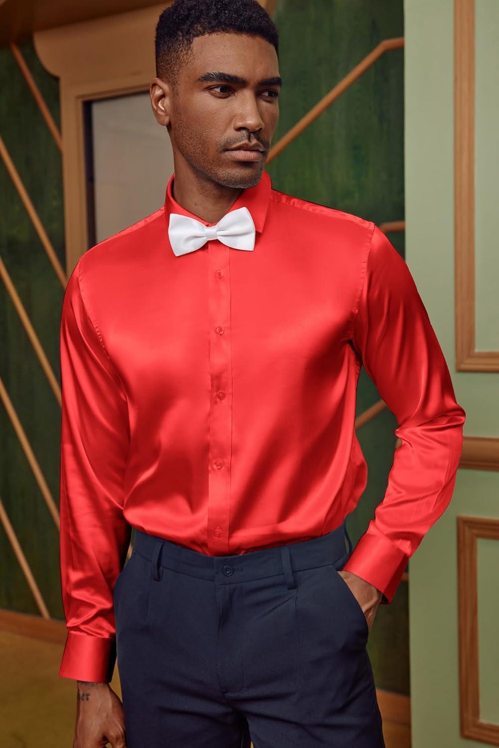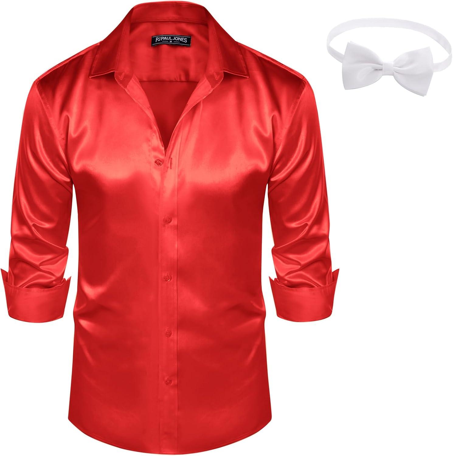 PJ PAUL JONES Men’s Shiny Satin Dress Shirts Long Sleeve Button Down Silk Shirt with Bow Tie(Red)