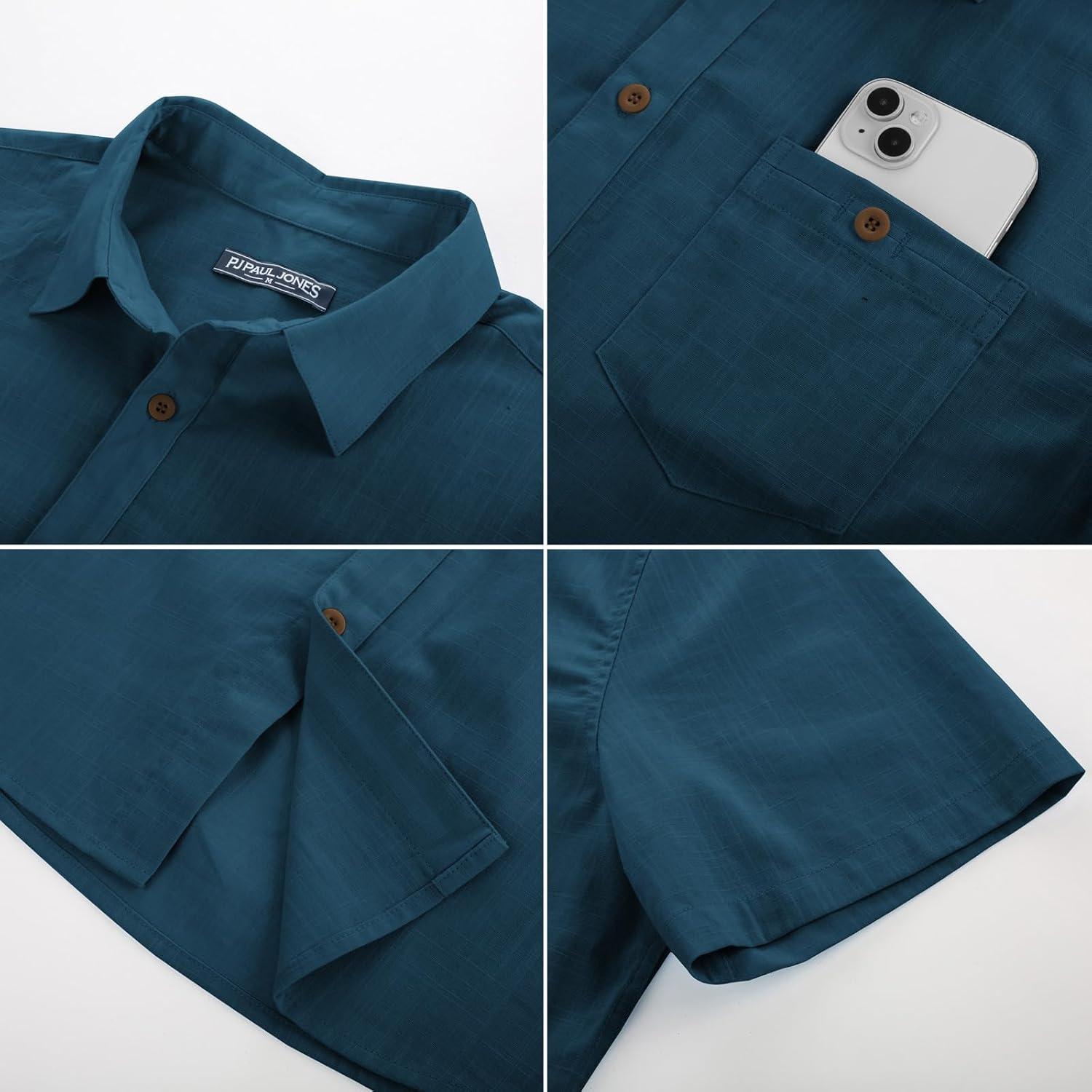 PJ PAUL JONES Mens Short Sleeve Button Down Shirts Summer Beach Shirts Untuckit Cotton Shirt with Pocket(Denim Blue)