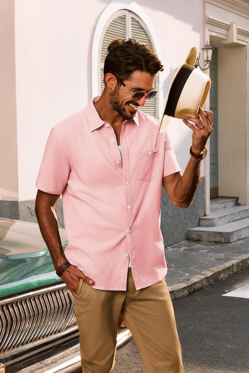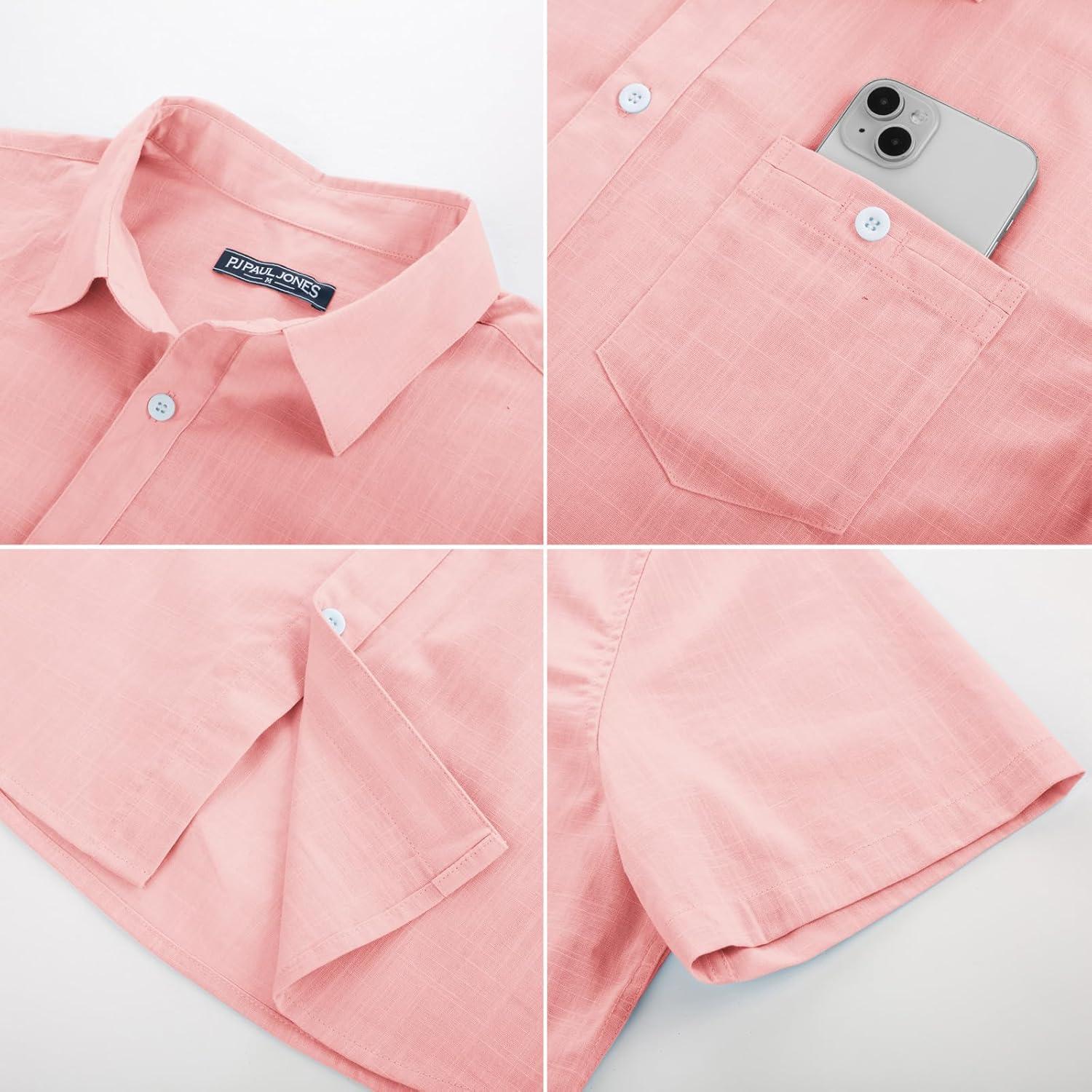 PJ PAUL JONES Mens Short Sleeve Button Down Shirts Summer Beach Shirts Untuckit Cotton Shirt with Pocket(Pink)