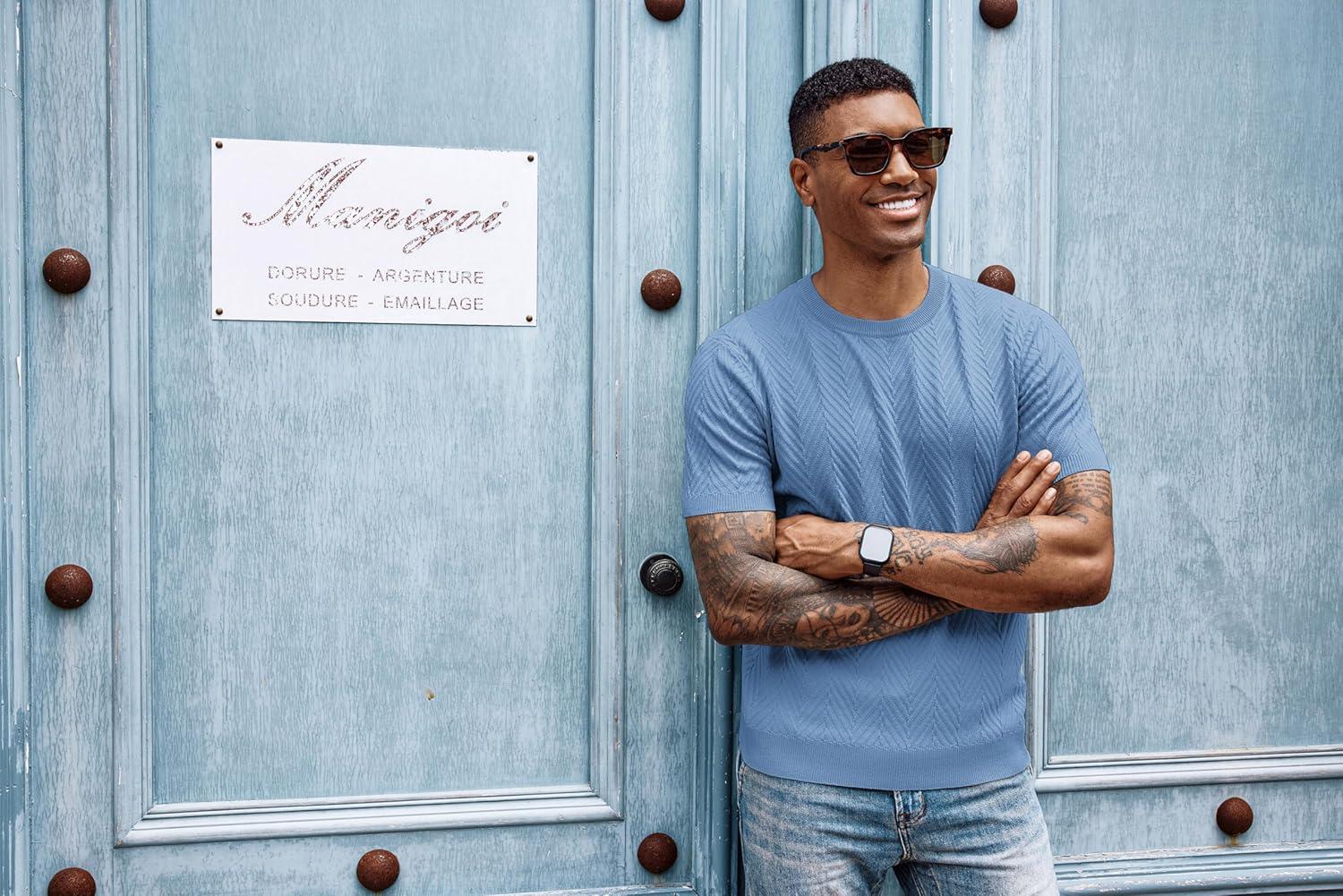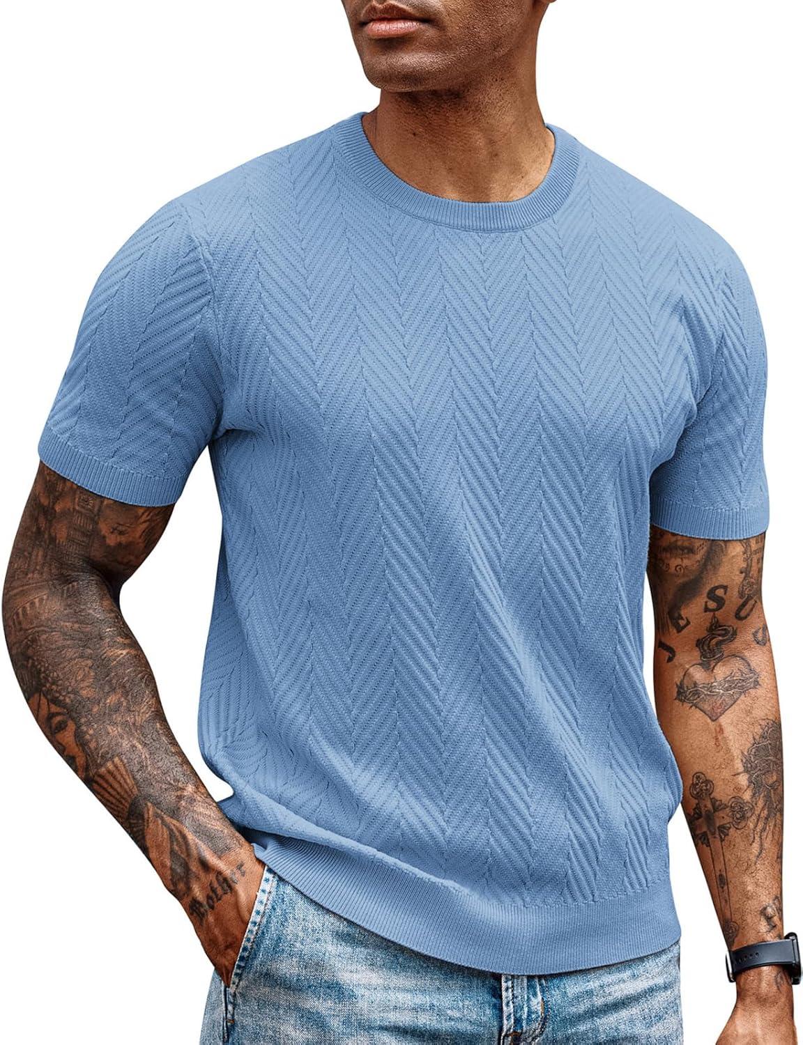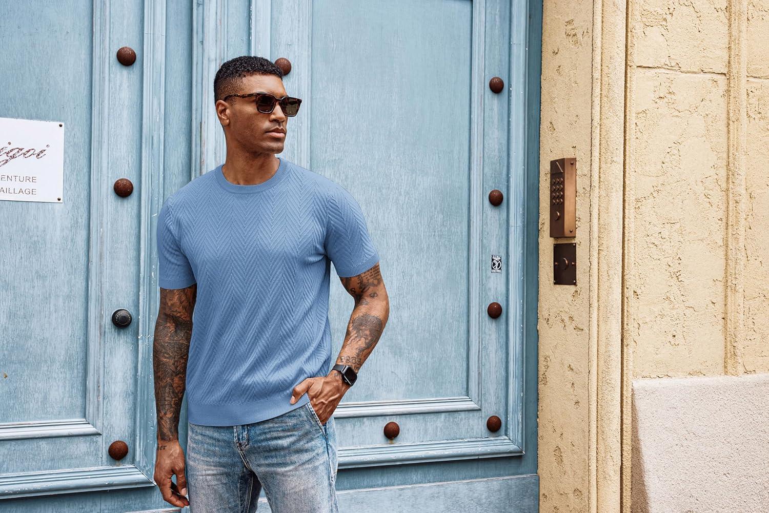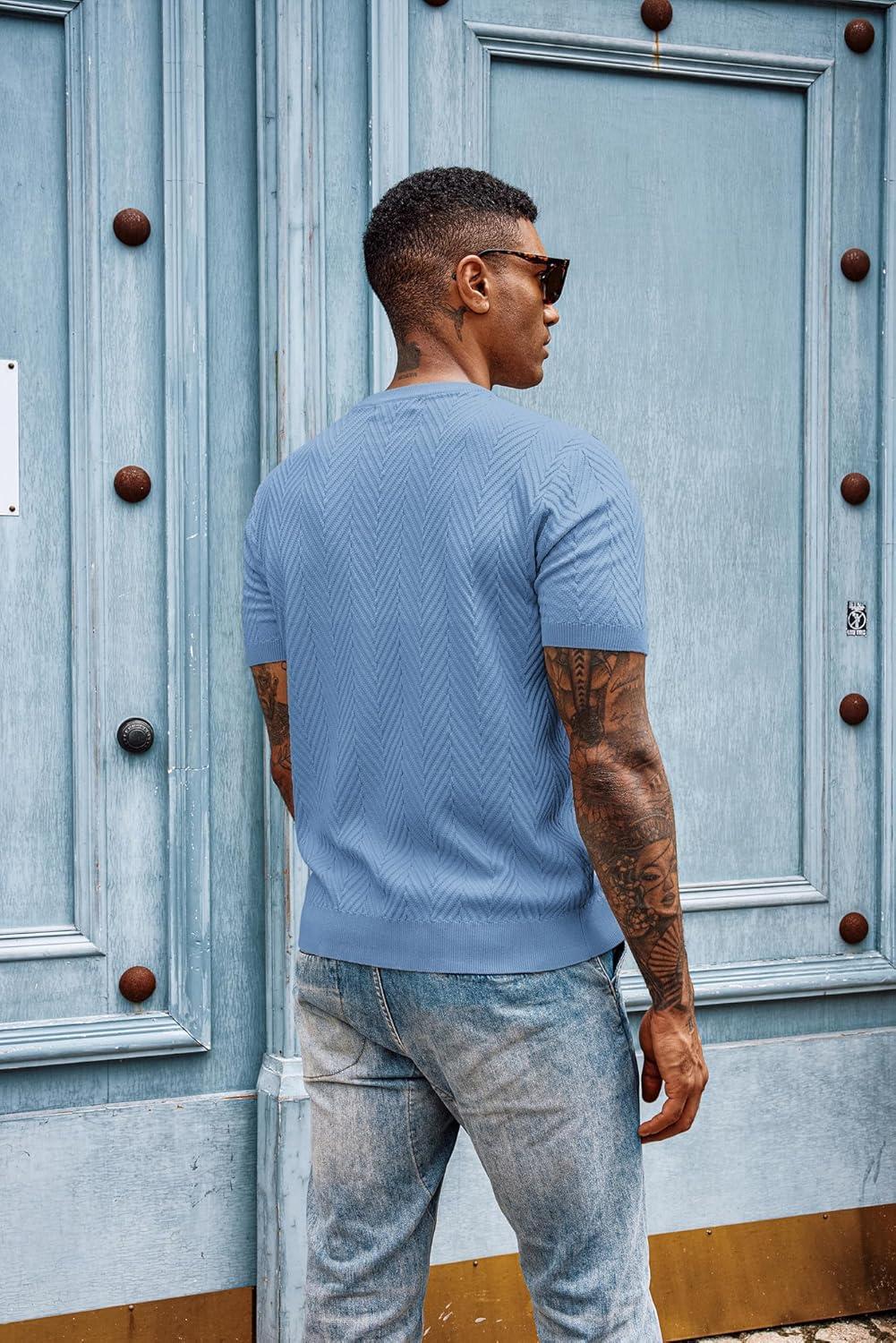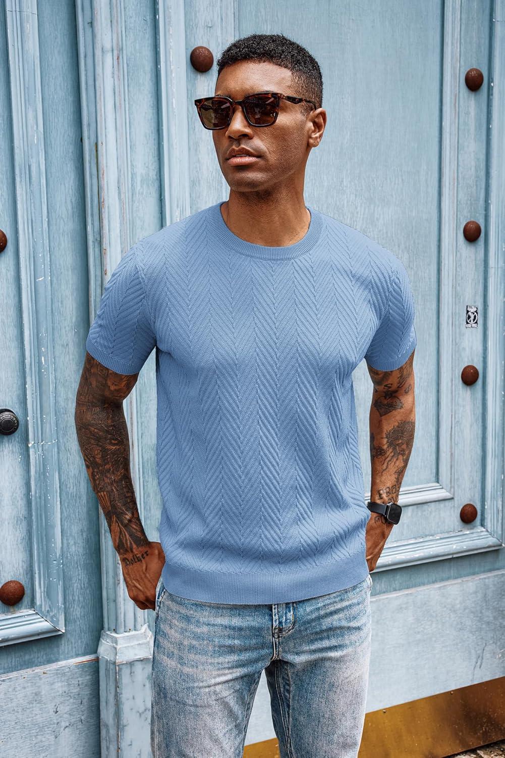PJ PAUL JONES Men’s Short Sleeve Knit T-Shirts Casual Crewneck Solid Texture Knit Shirt(Light Blue)