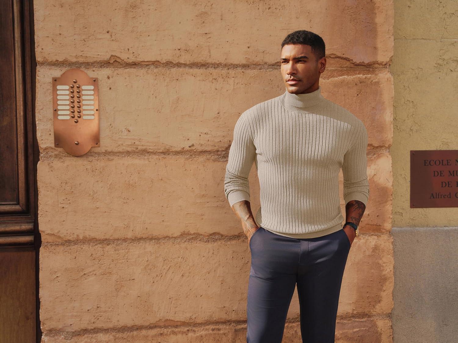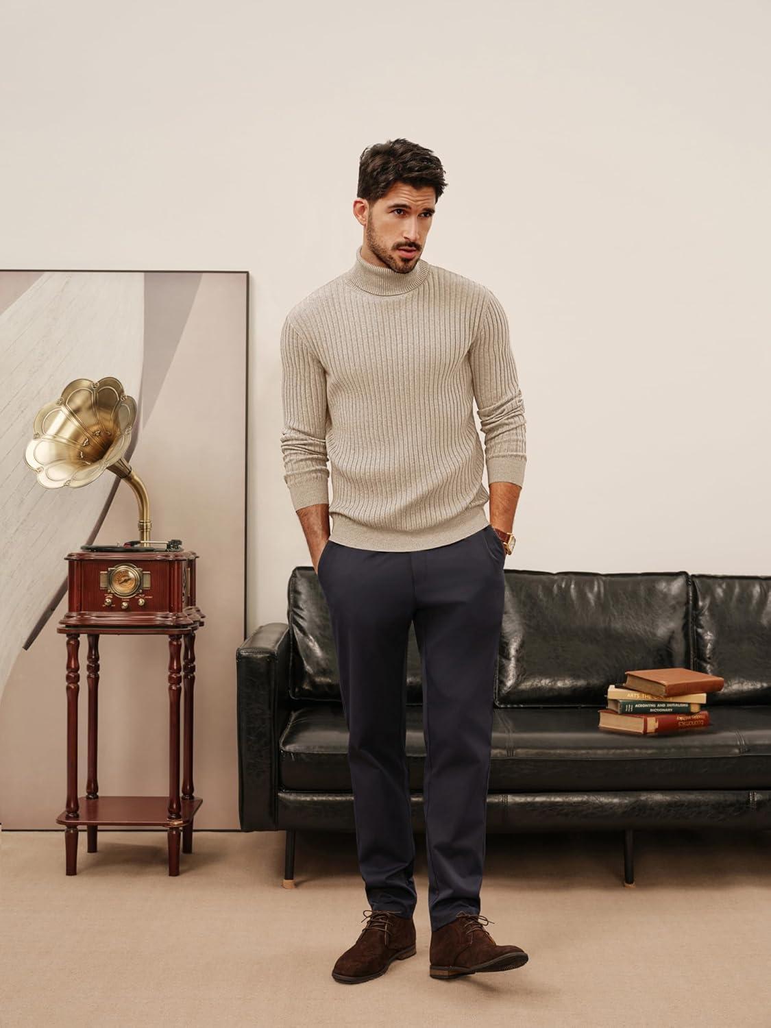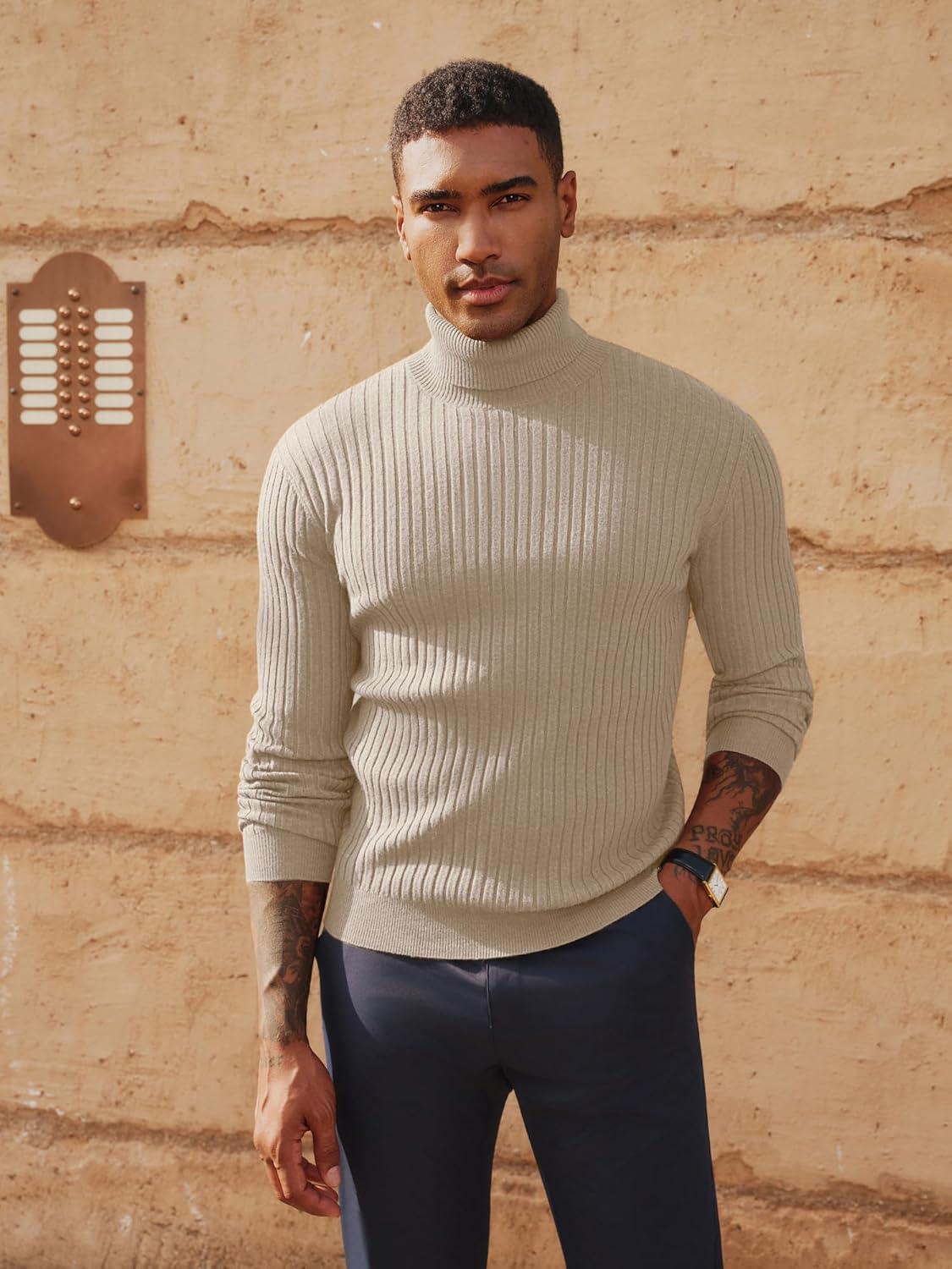 PJ PAUL JONES Men’s Slim Fit Turtleneck Sweater Casual Ribbed Knitted Pullover Sweaters(Apricot)