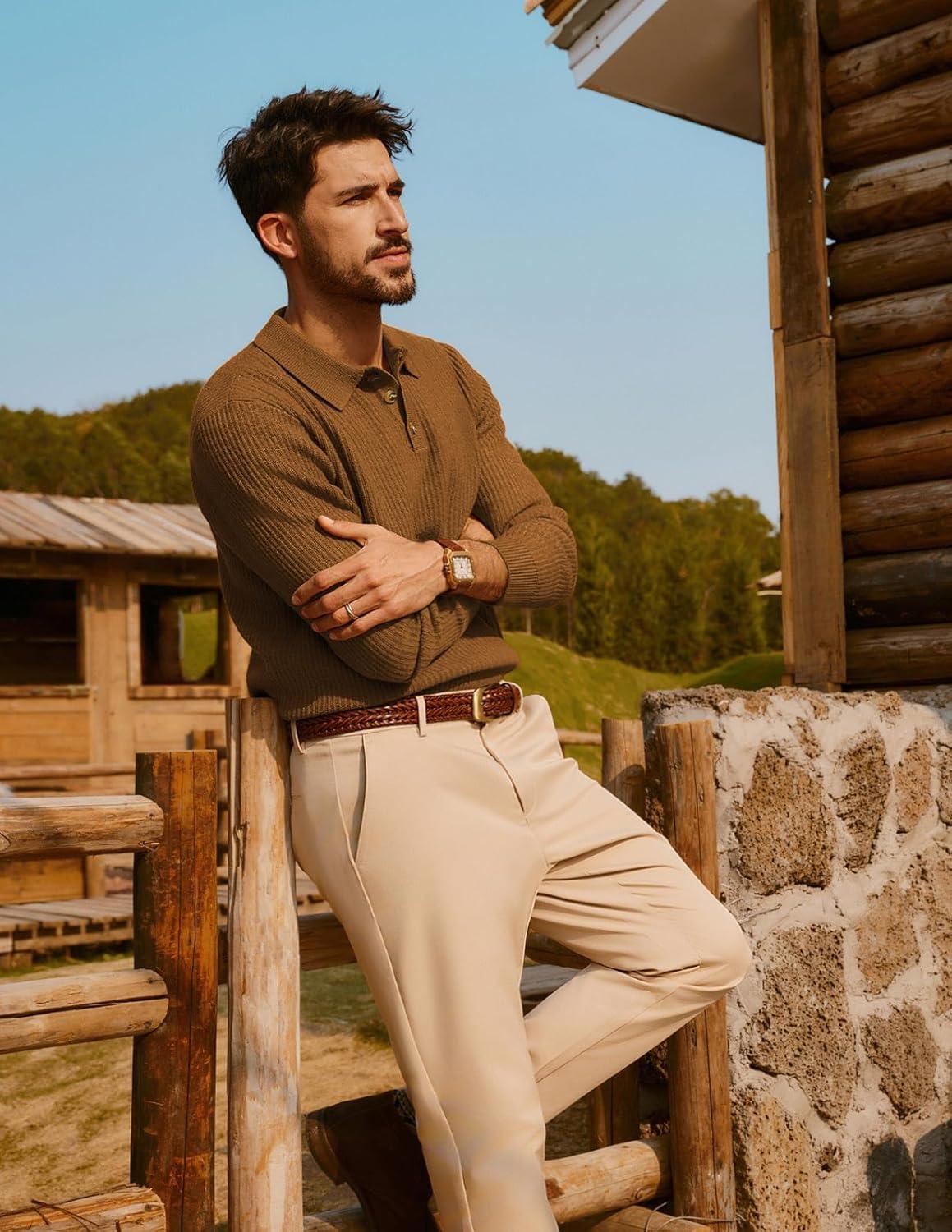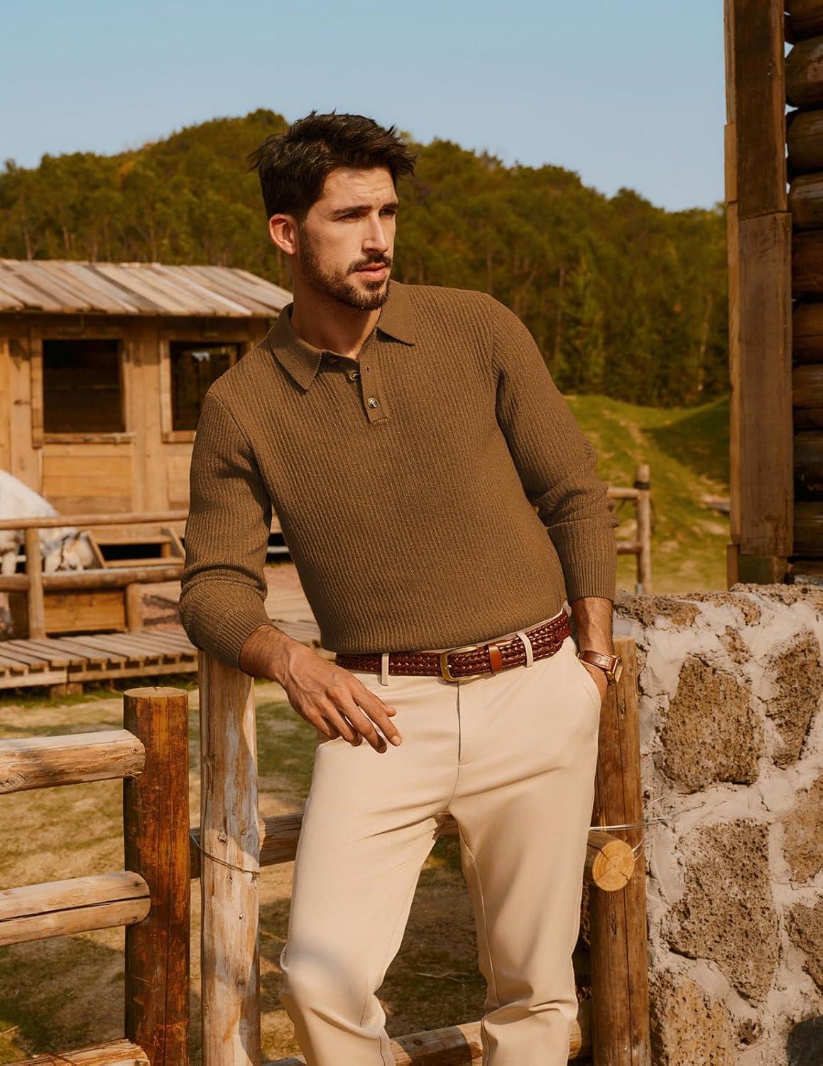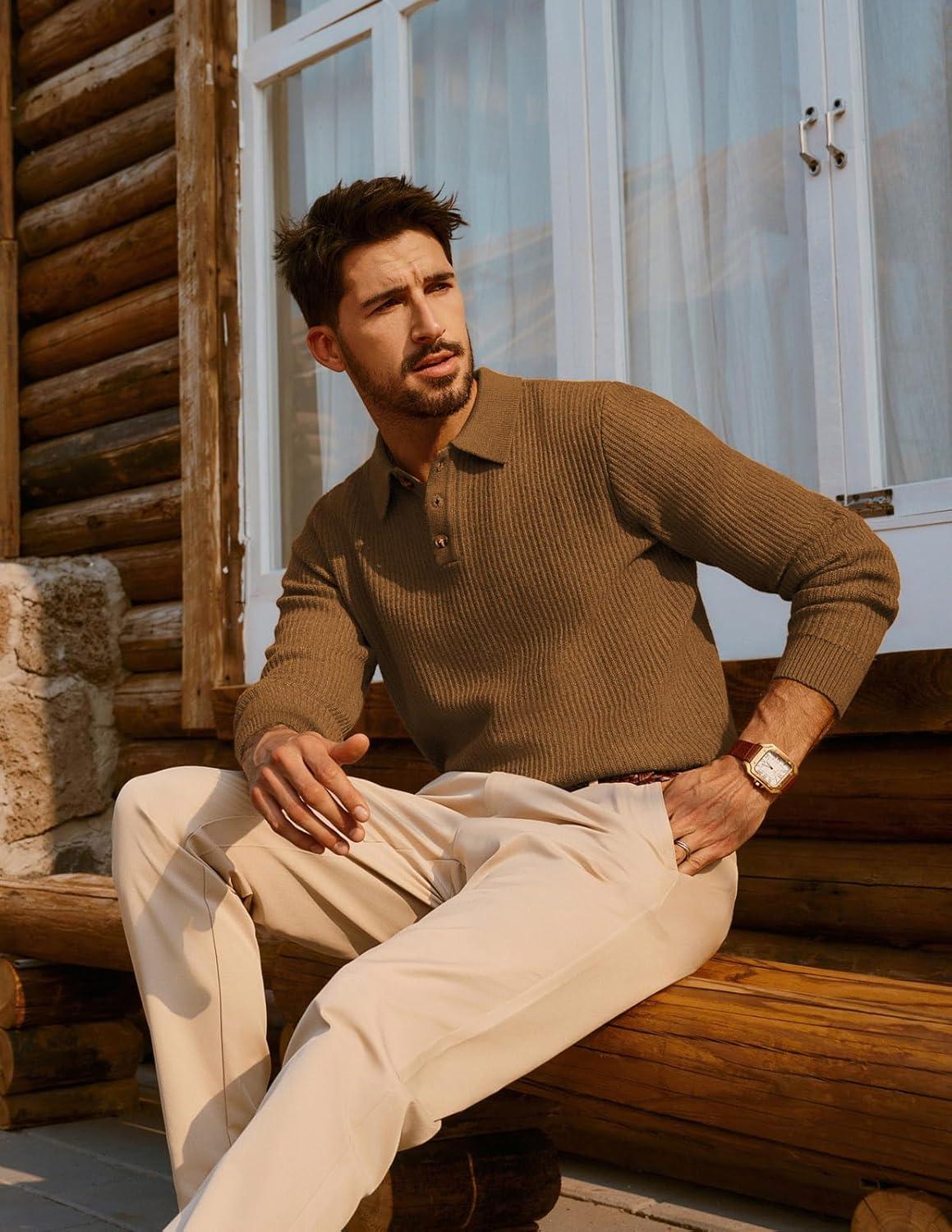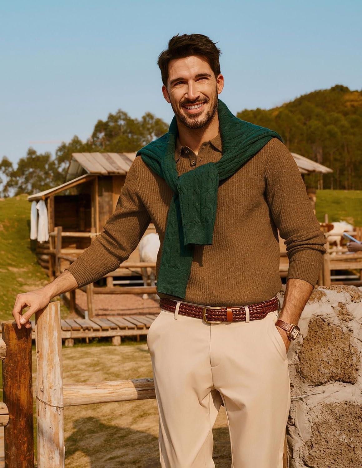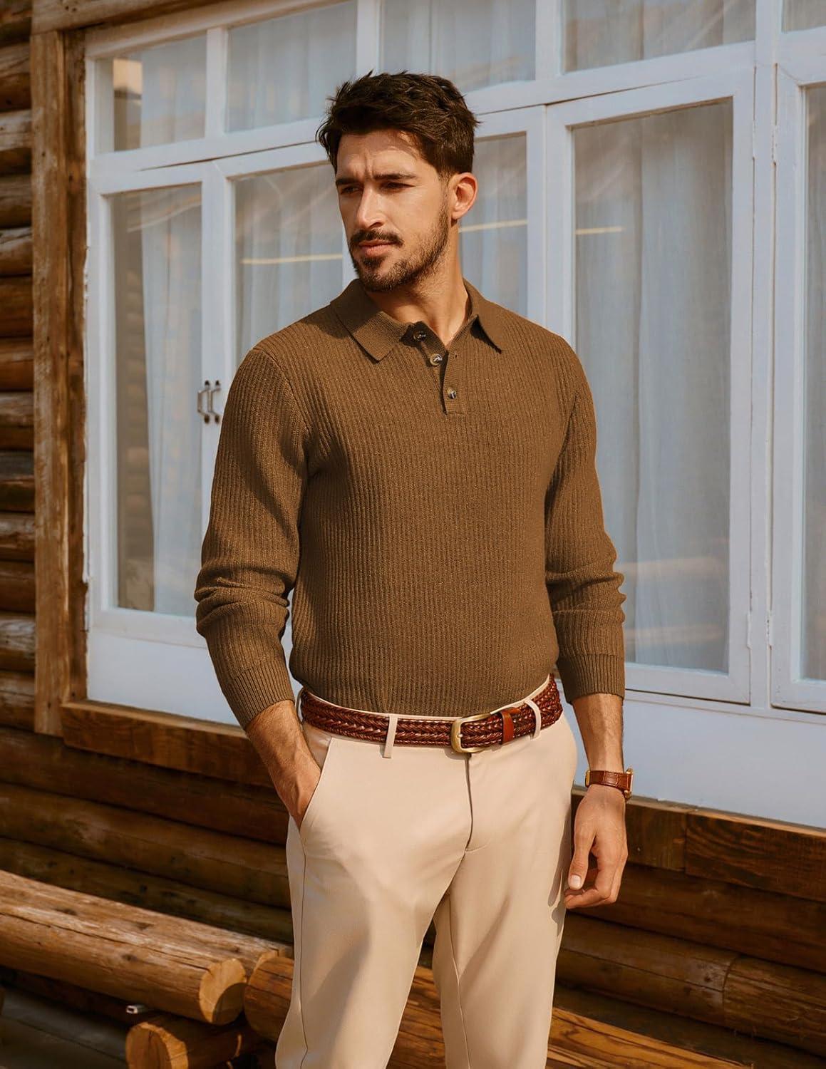 PJ PAUL JONES Mens Sweater Cable Knit Polo Collar Sweaters for Fall Winter(Coffee)