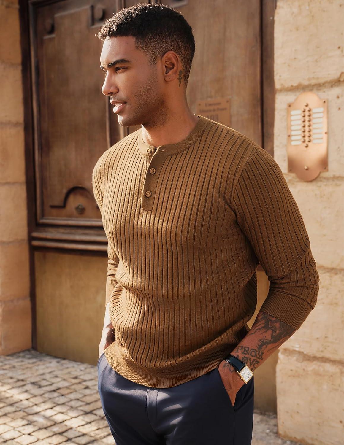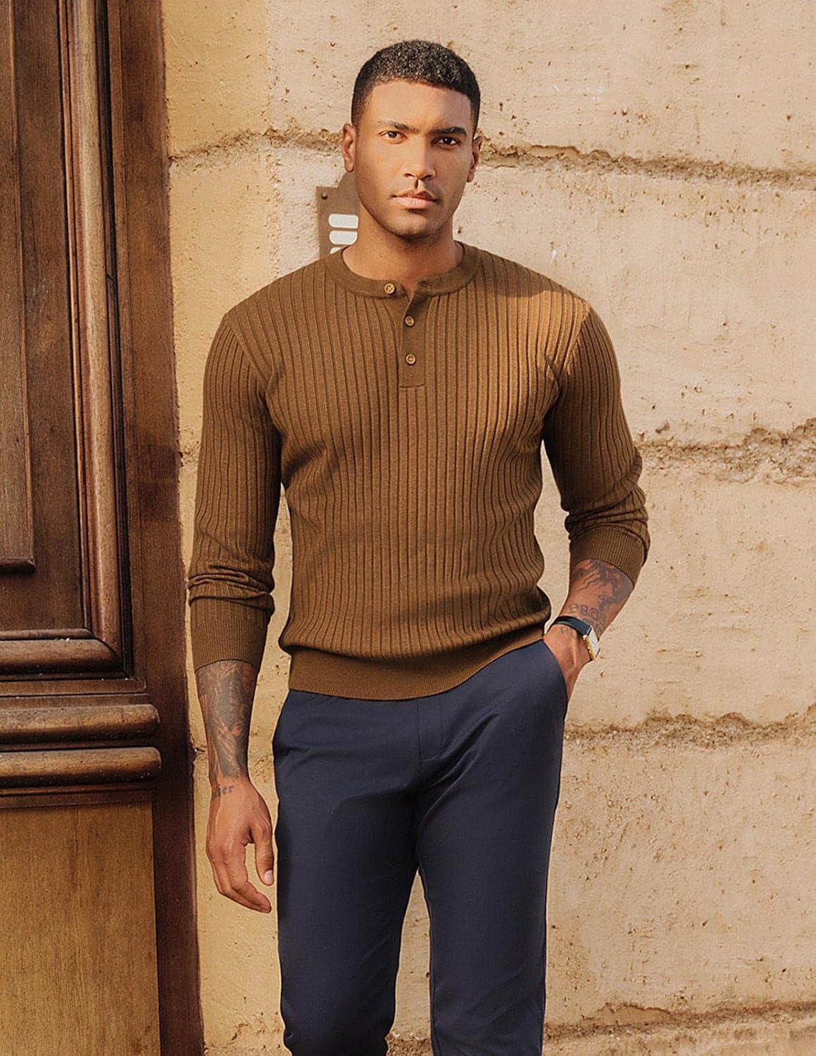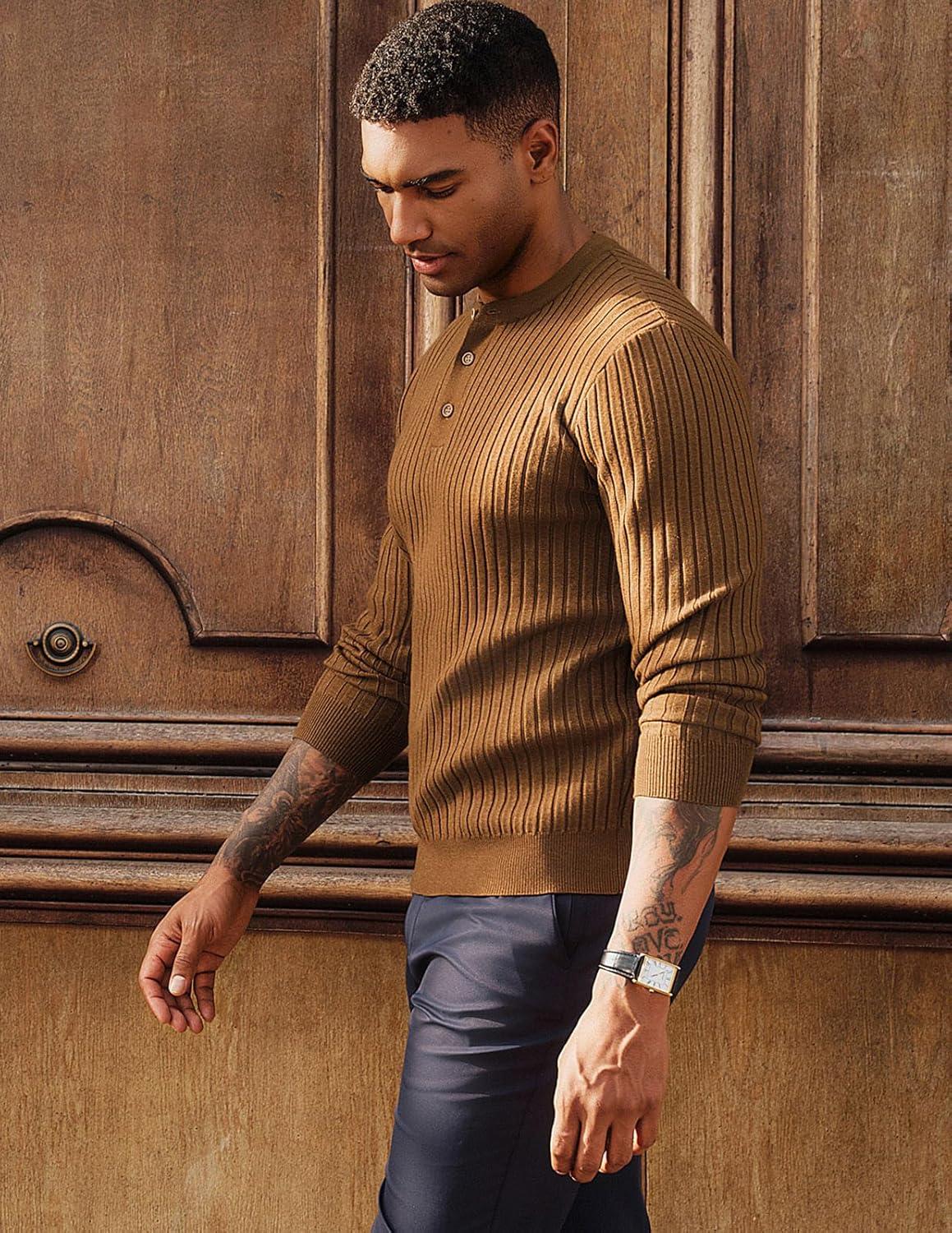 PJ PAUL JONES Mens Sweater Casual Henley Pullover Cable Knitted Sweater(Coffee)