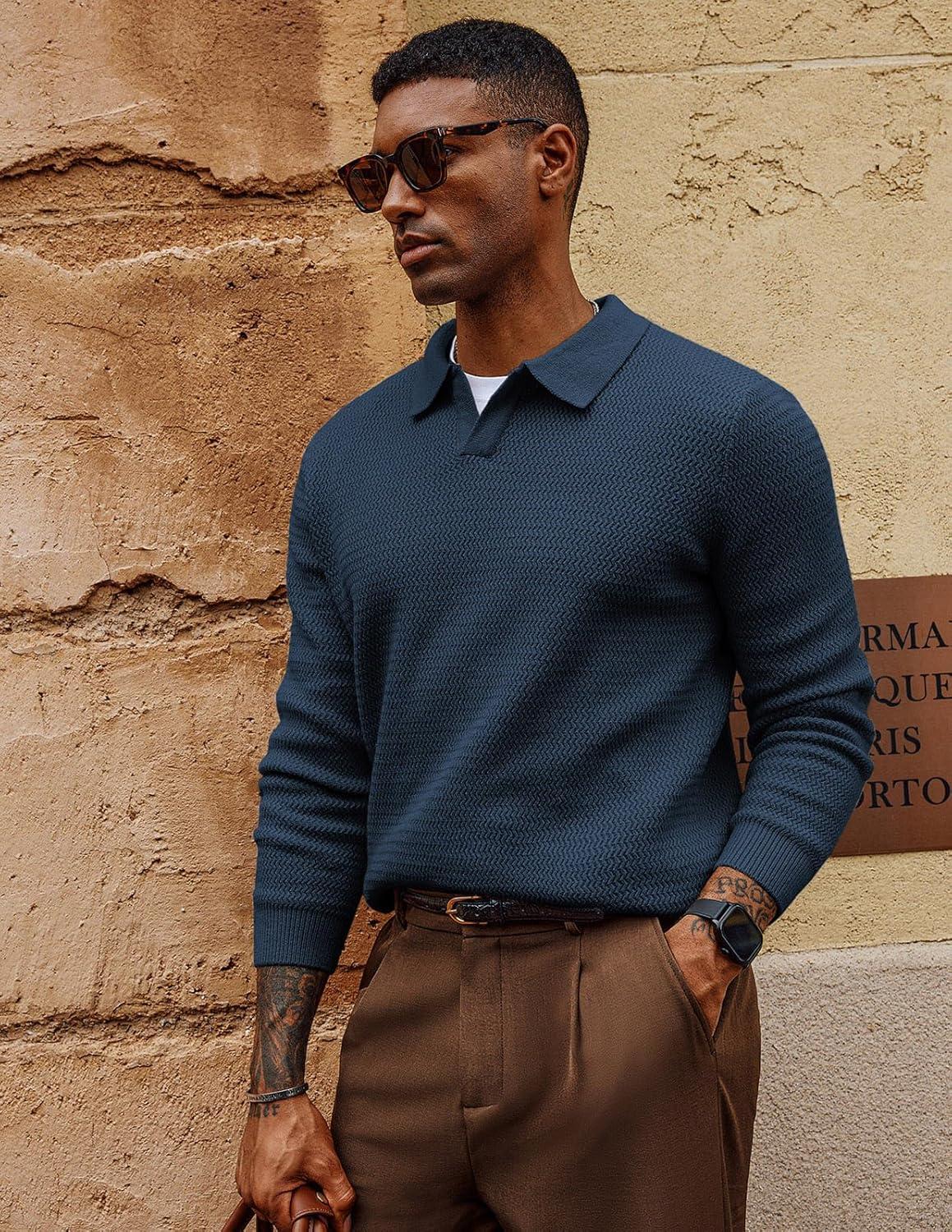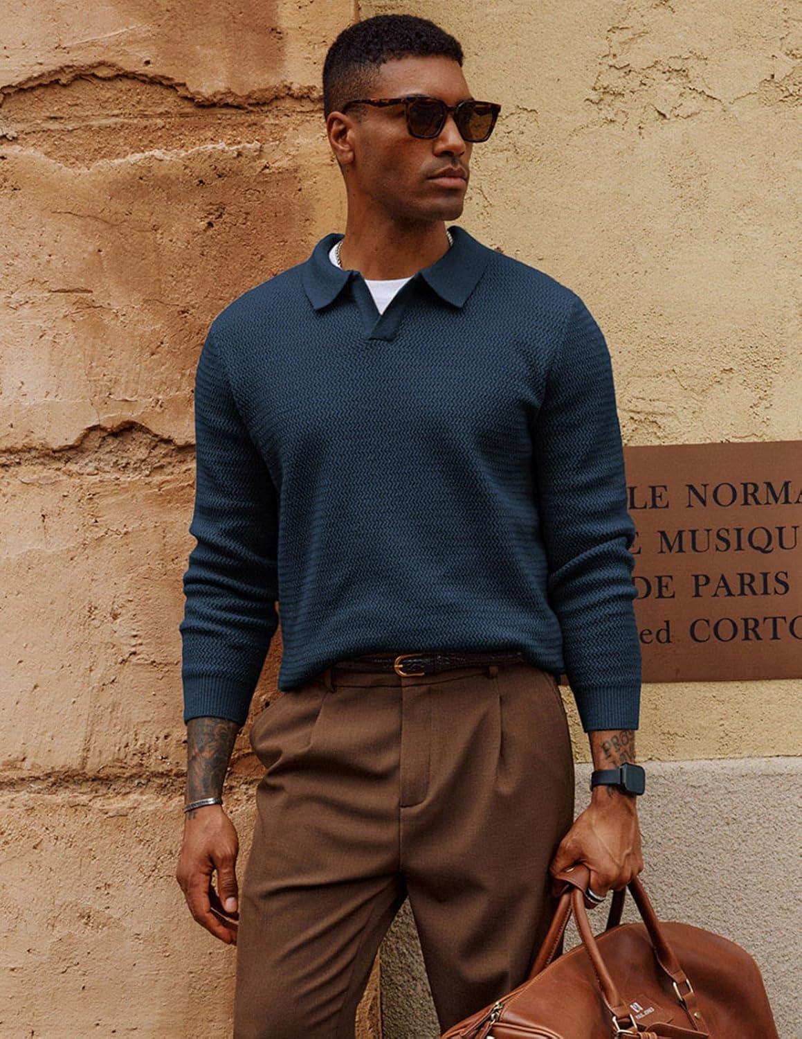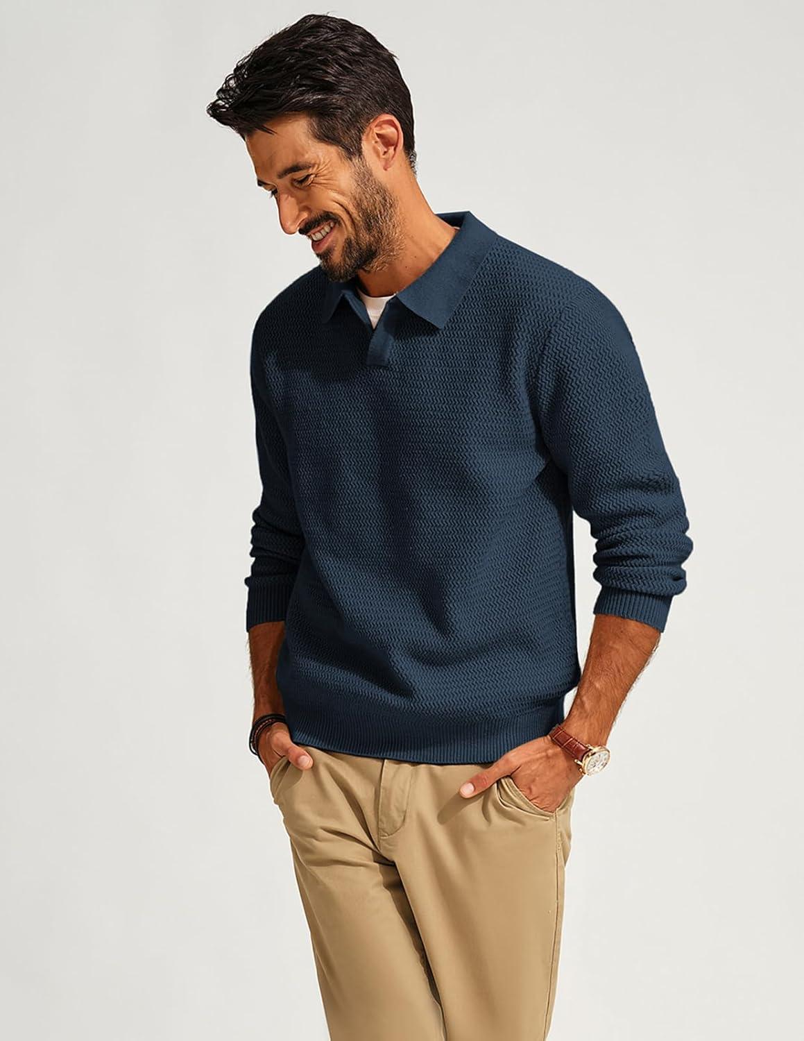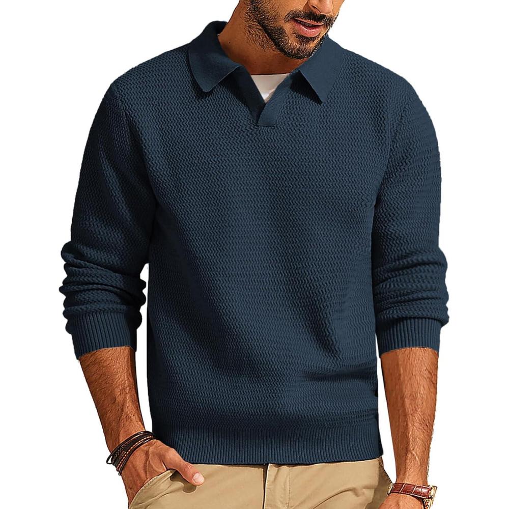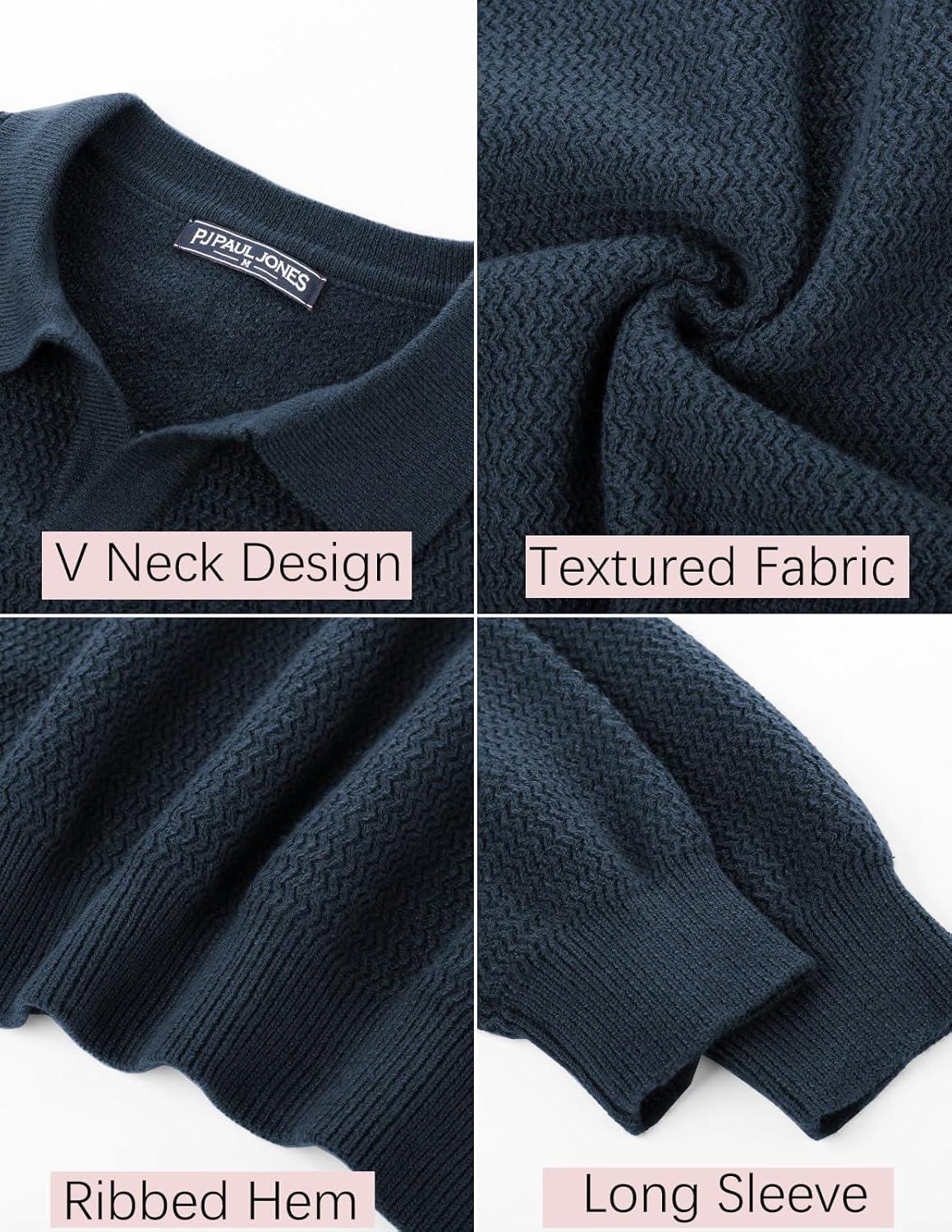 PJ PAUL JONES Mens Sweater V Neck Pullover Sweater Long Sleeve Cable Knit Textured Sweater(Dark Blue)