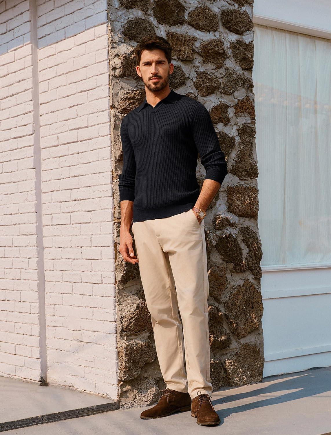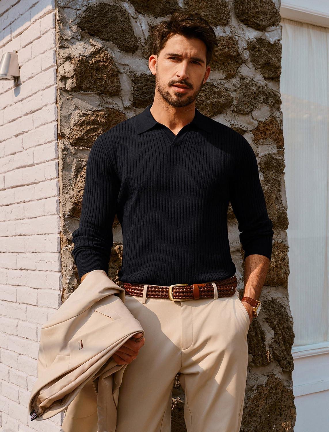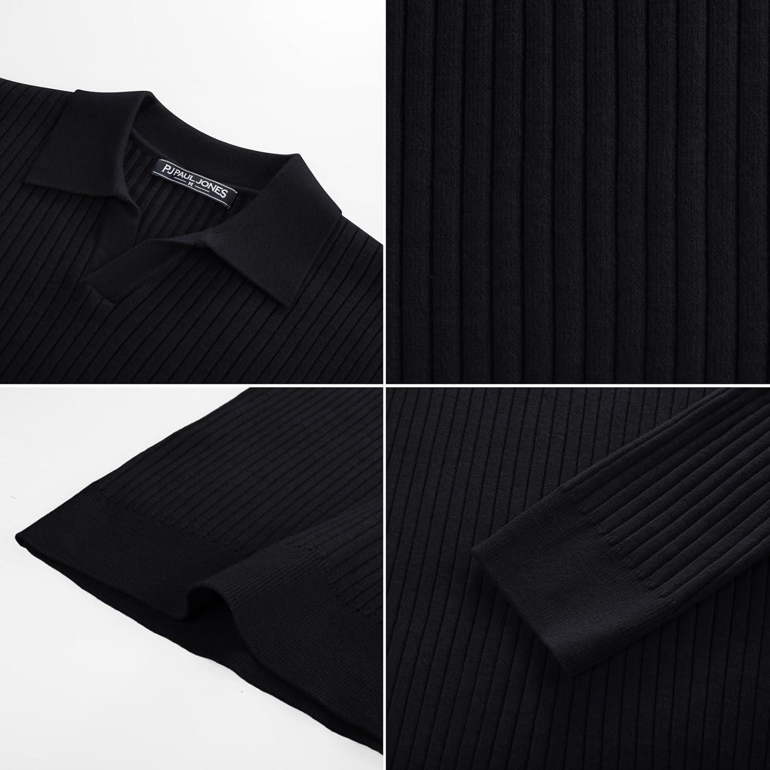 PJ PAUL JONES Mens Sweater V Neck Slim Fit Pullover Sweater Ribbed Textured Polo Sweaters(Black)
