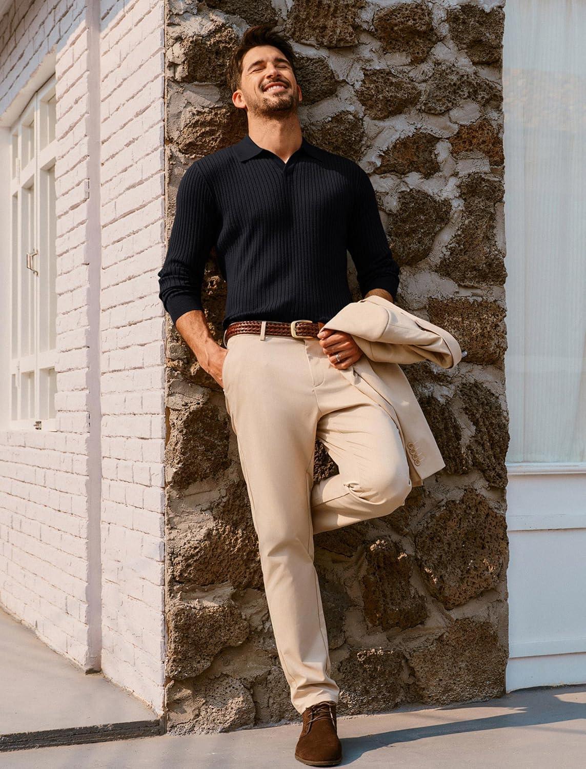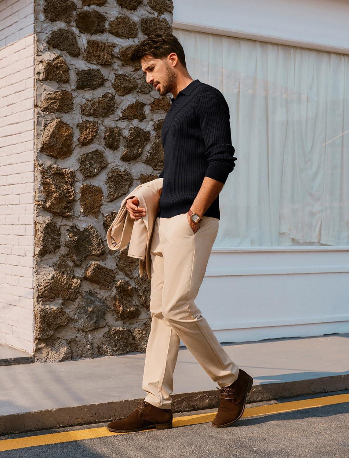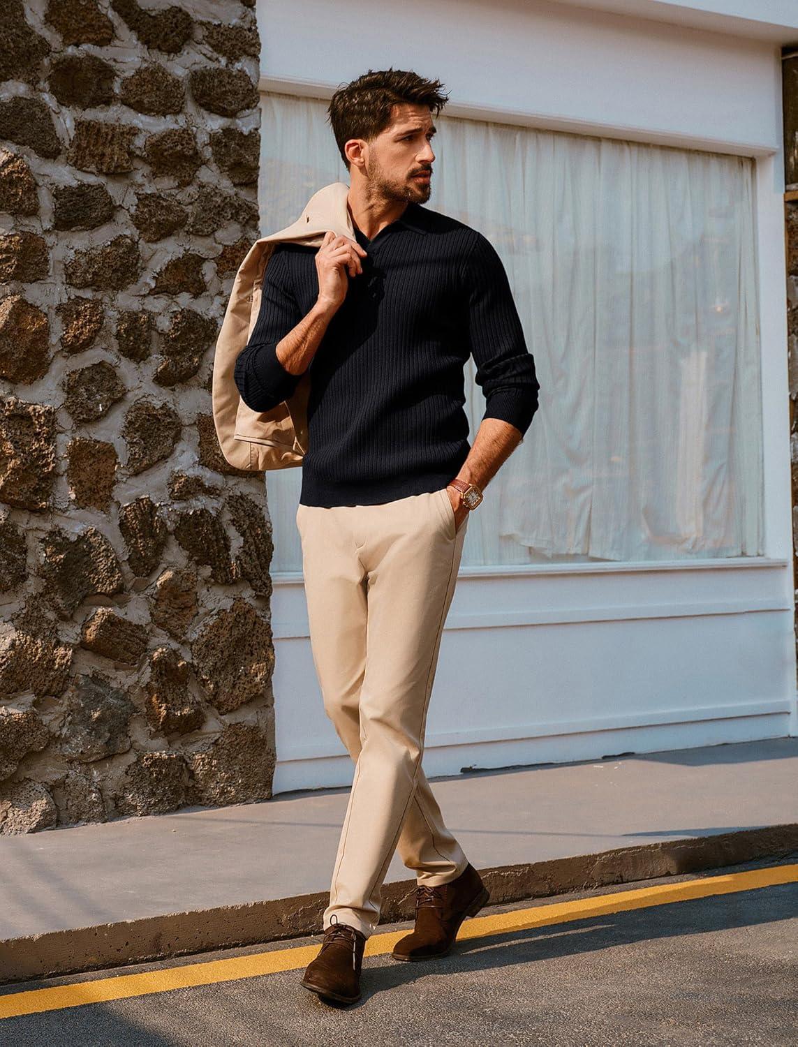 PJ PAUL JONES Mens Sweater V Neck Slim Fit Pullover Sweater Ribbed Textured Polo Sweaters(Black)