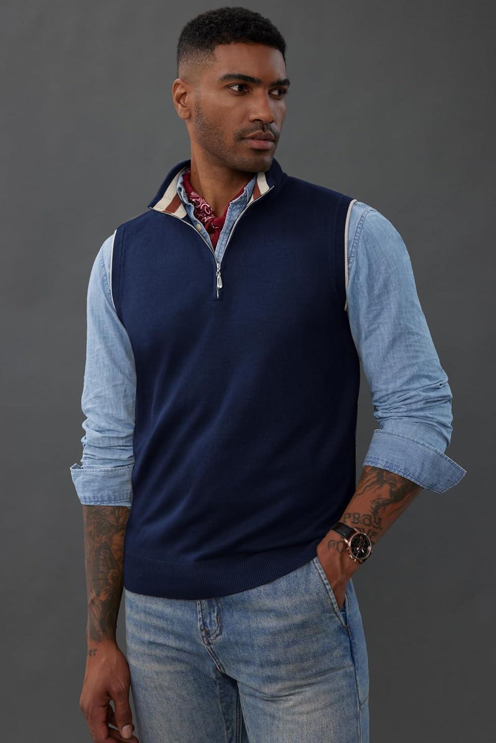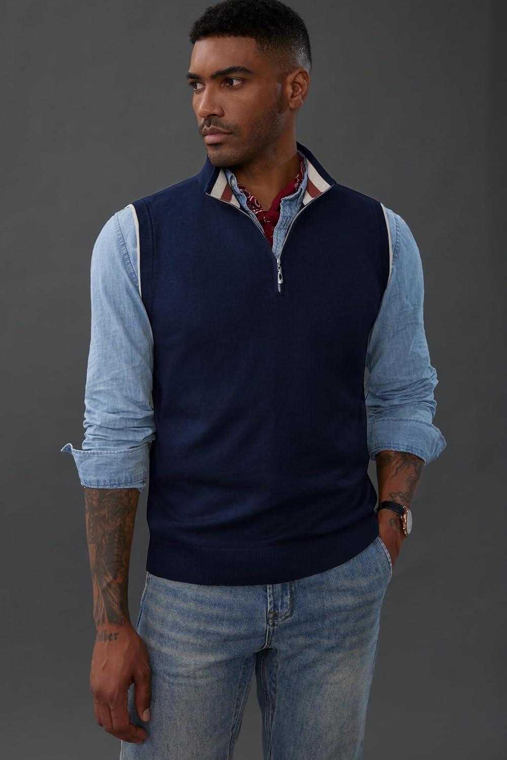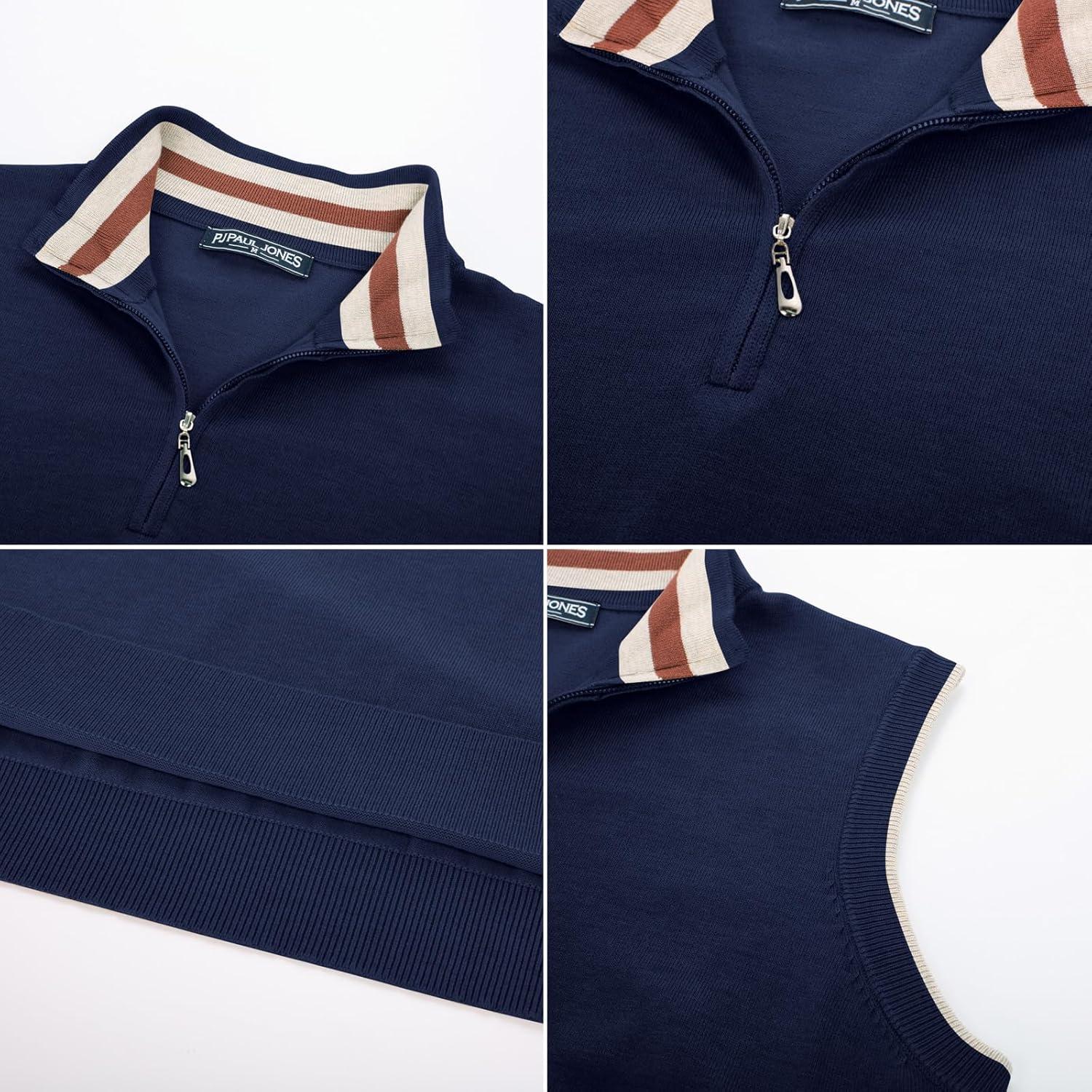 PJ PAUL JONES Mens Sweater Vest Quarter Zip Vest Sweater Stand Collar Contrast Stripes Pullover Knitwear Vest(Navy Blue)