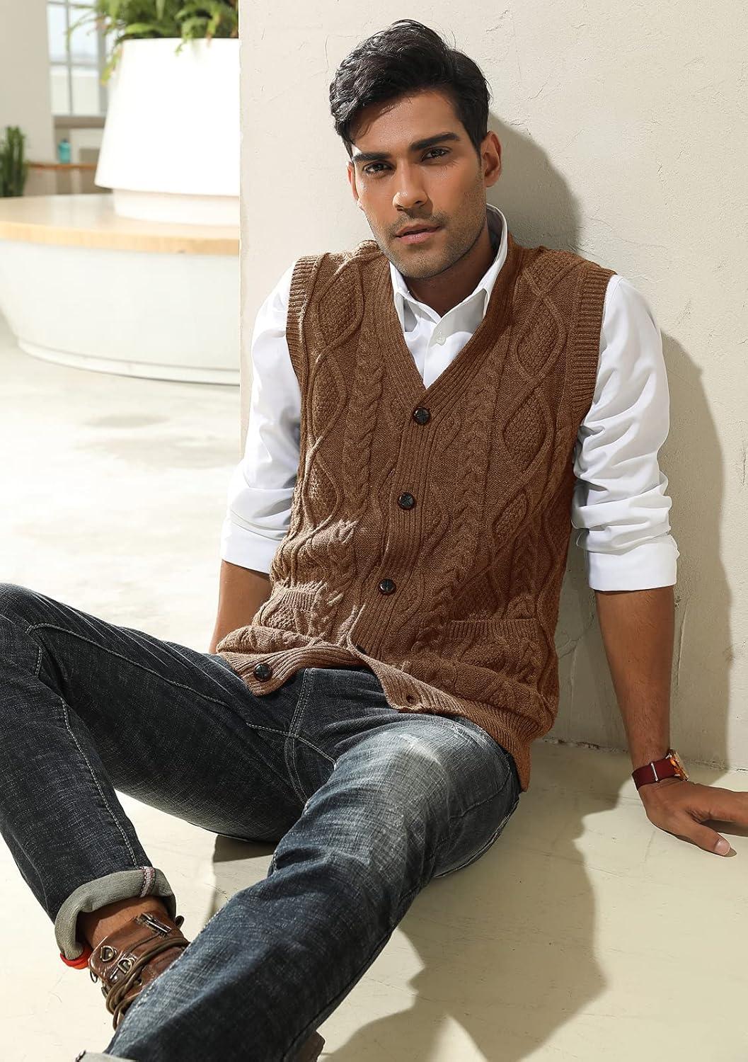 PJ PAUL JONES Men’s Sweater Vest V-Neck Sleeveless Cable Knitted Cardigan Vest(Camel)