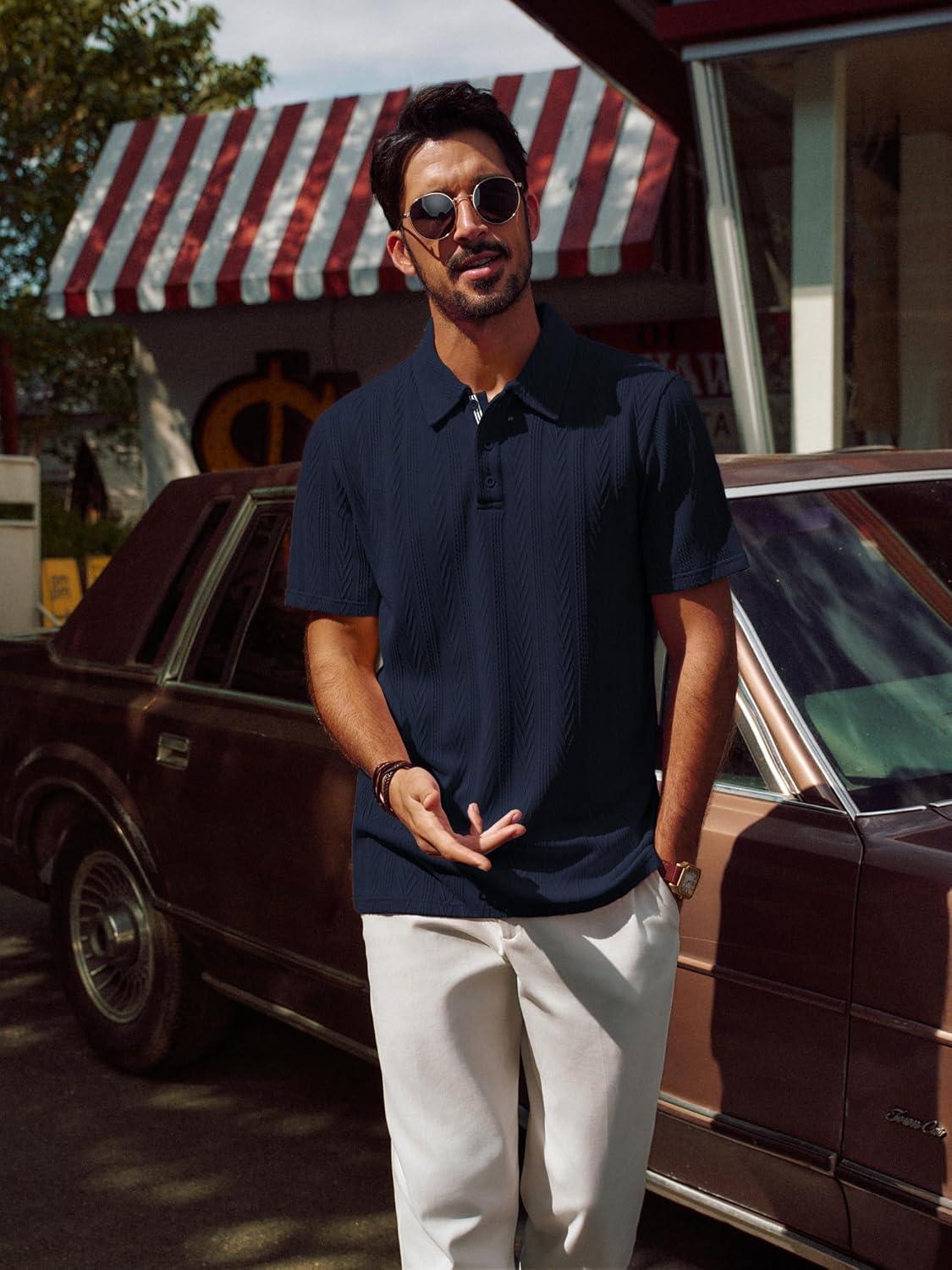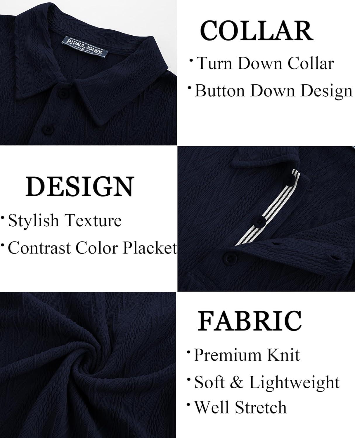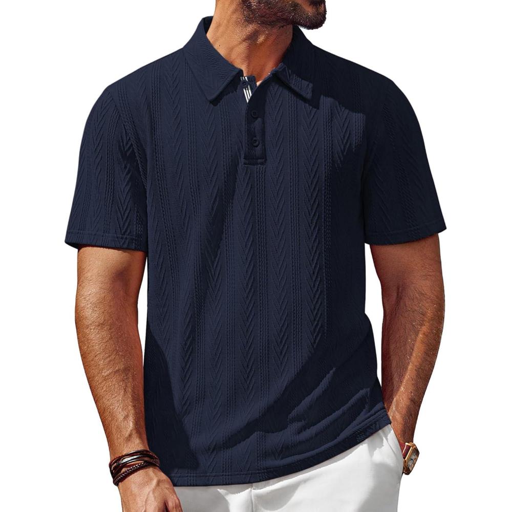 PJ PAUL JONES Men’s Textured Knit Polo Shirt Short Sleeve Regular Fit Stretch Collared Summer Shirts(Navy Blue)