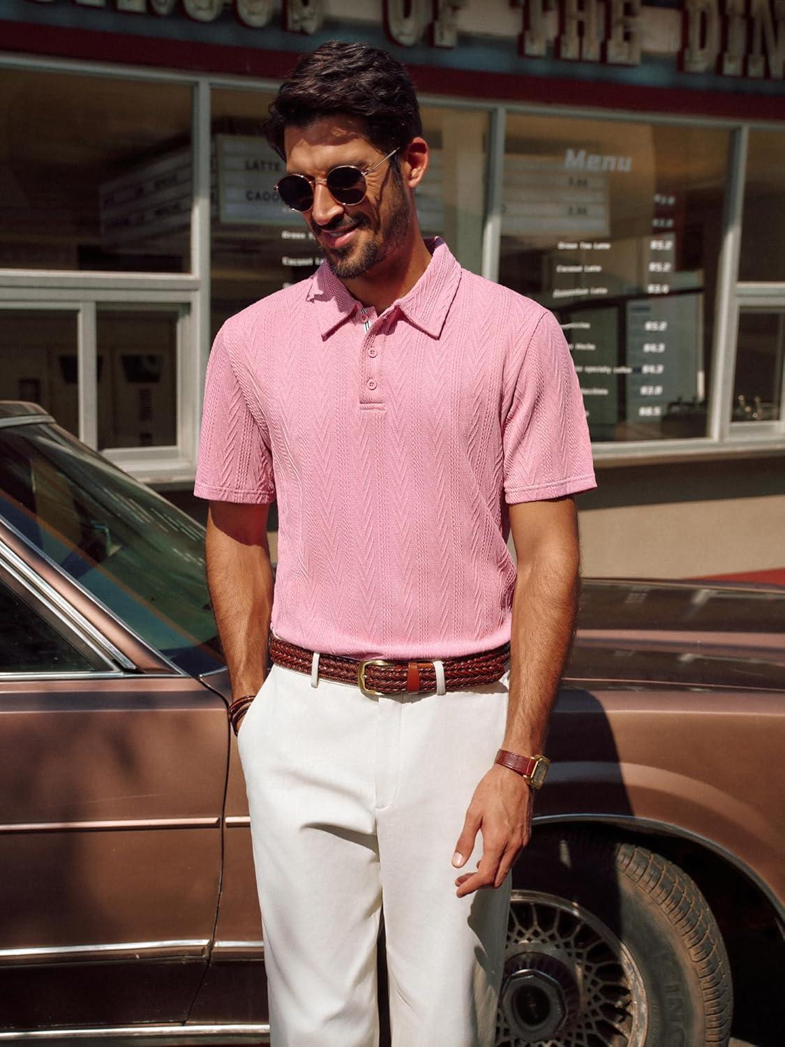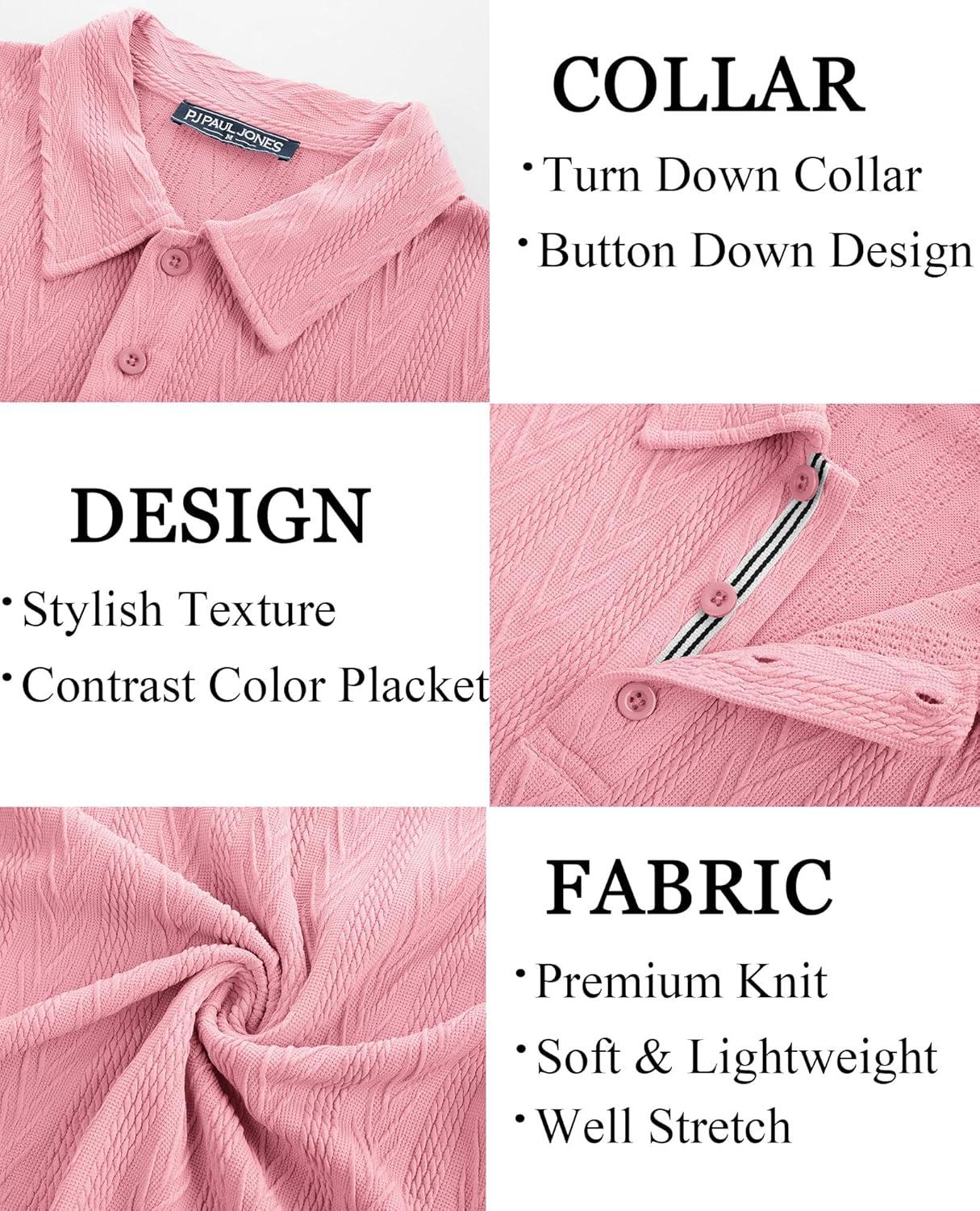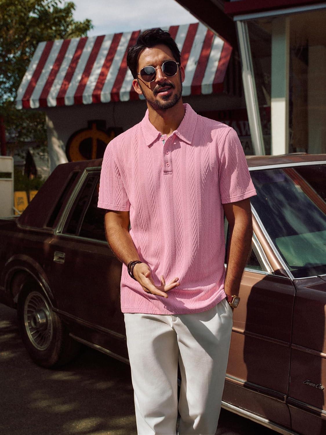 PJ PAUL JONES Men’s Textured Knit Polo Shirt Short Sleeve Regular Fit Stretch Collared Summer Shirts(Pink)