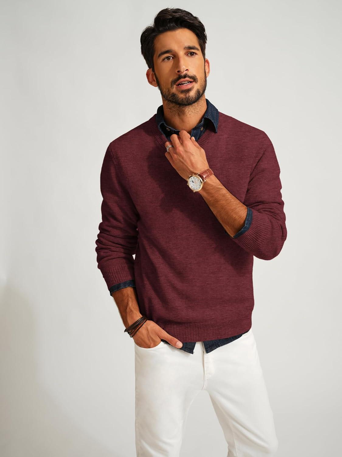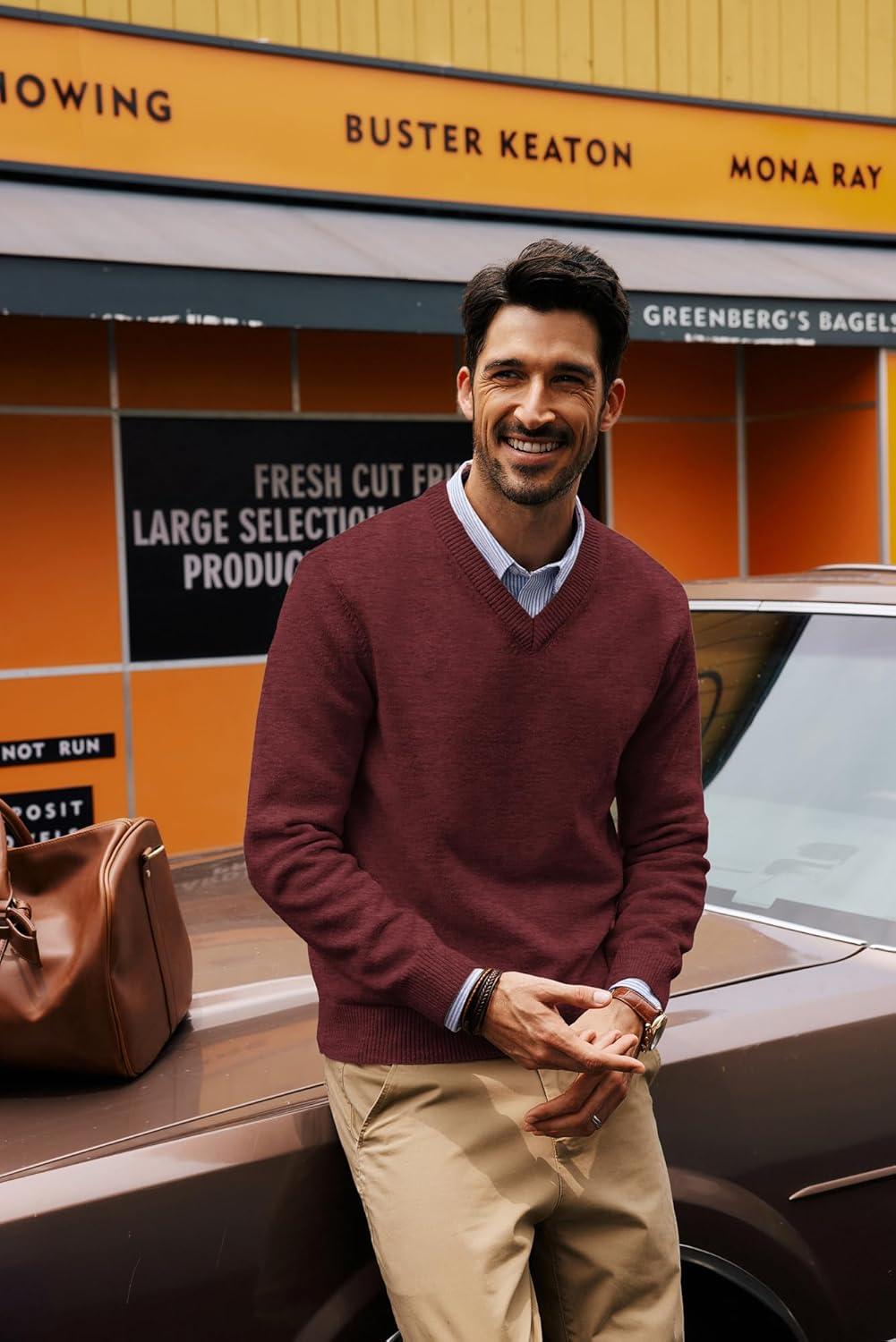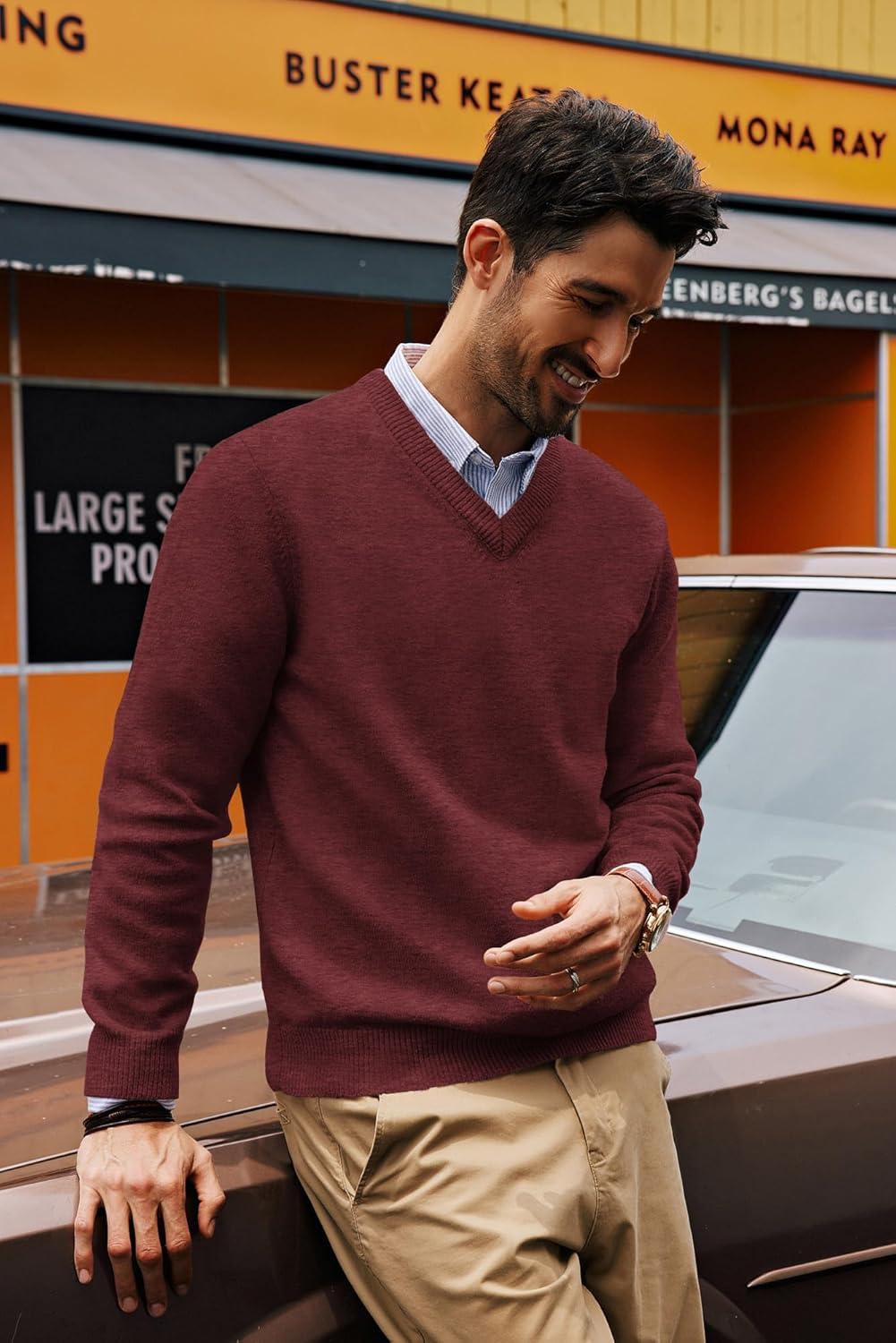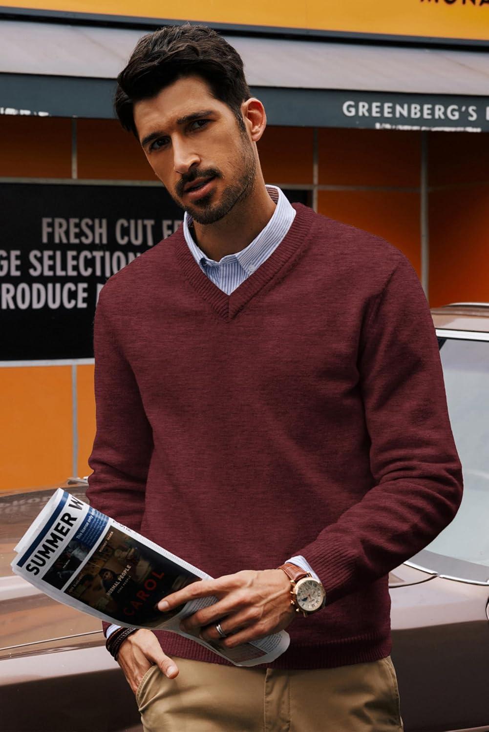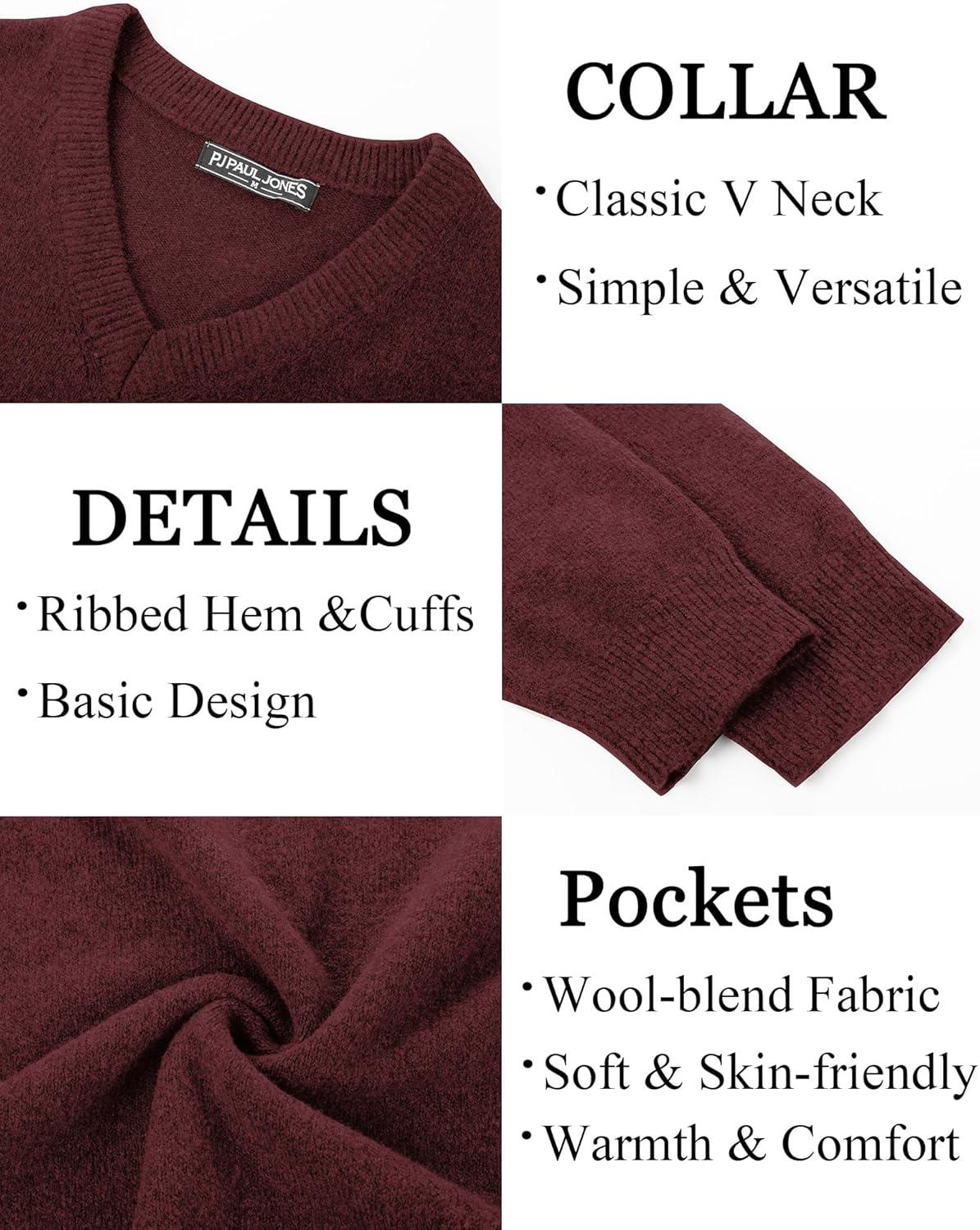 PJ PAUL JONES Mens V Neck Pullover Lightweight Wool Blend Long Sleeve Knit Sweater(Burgundy)