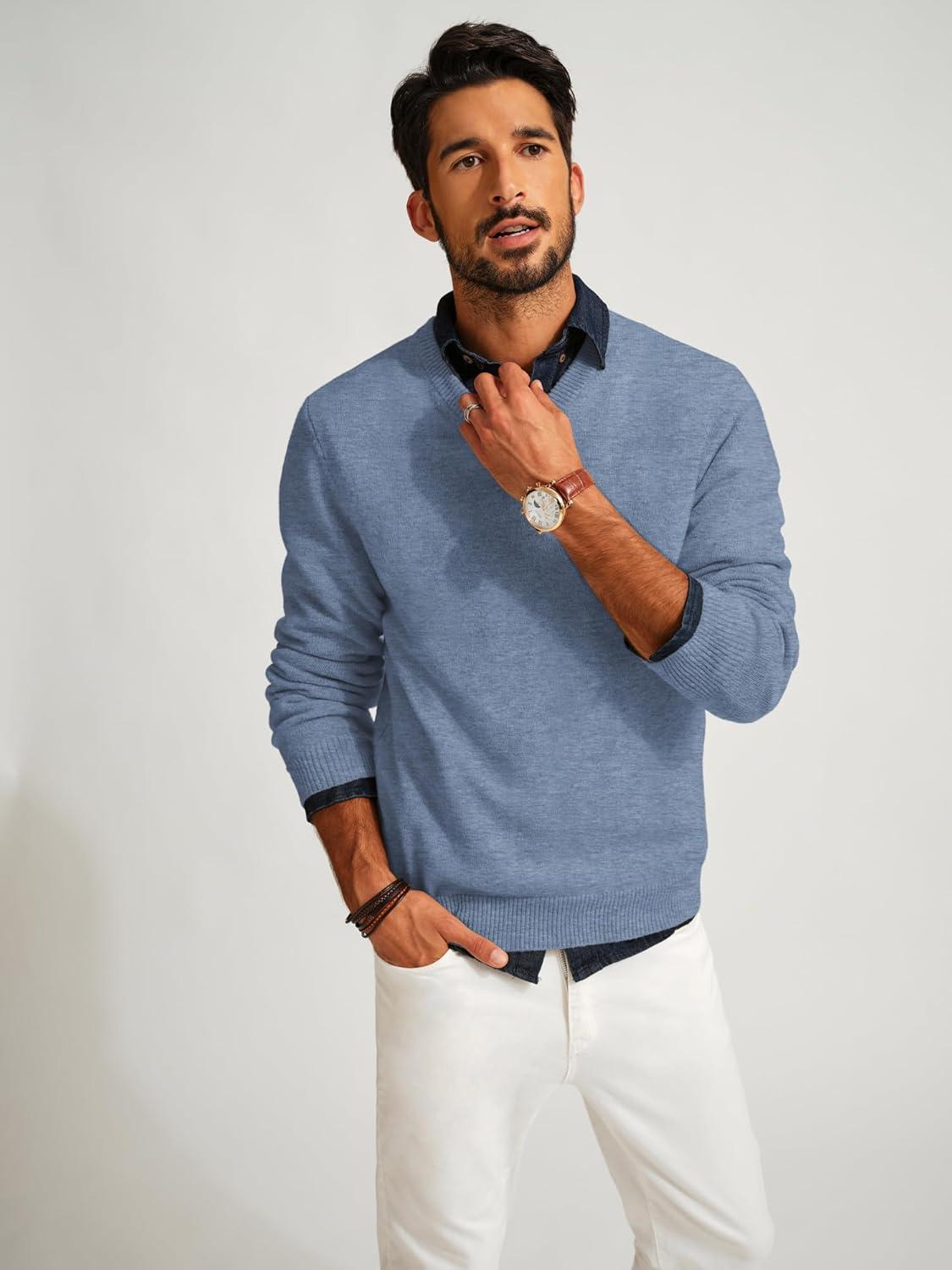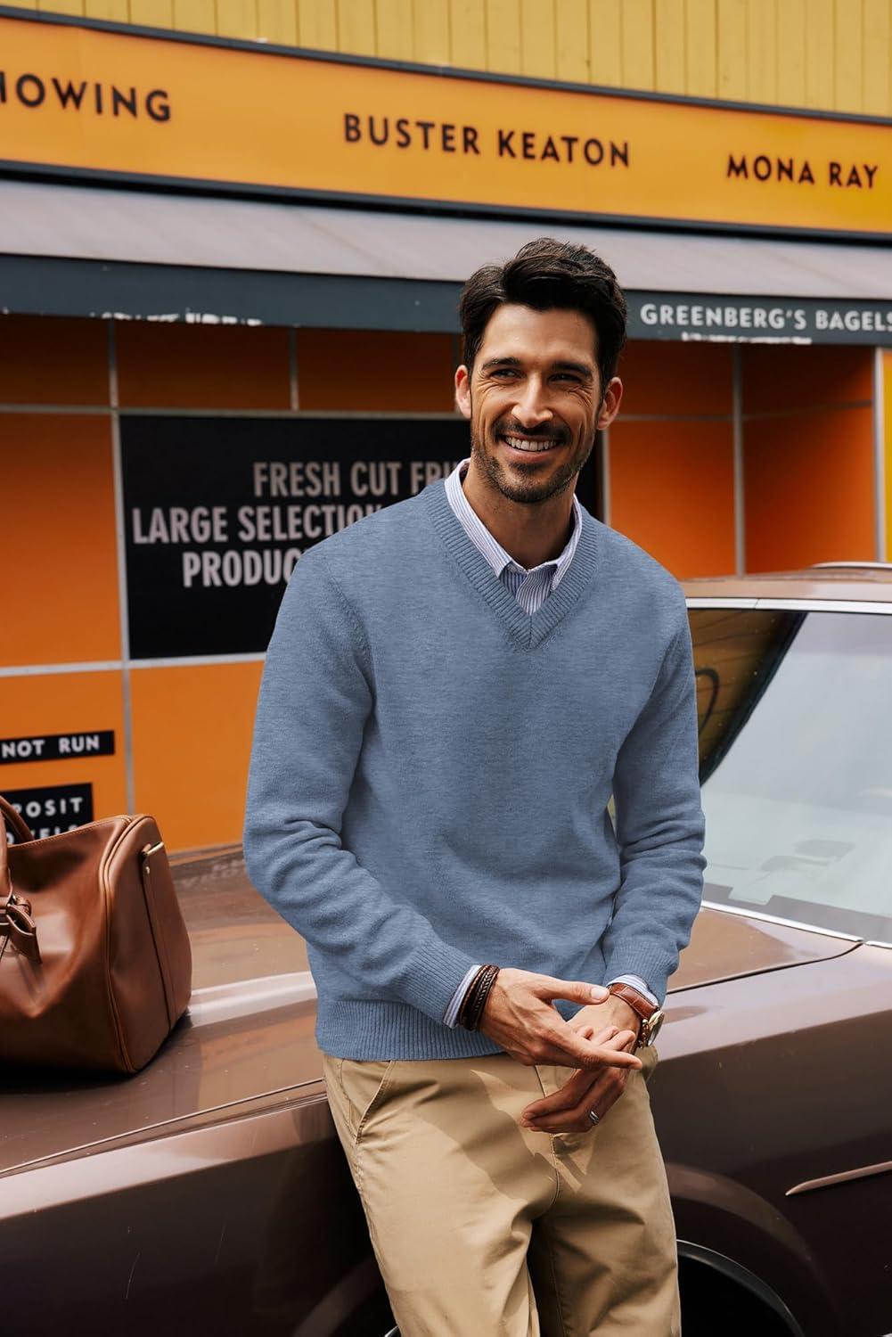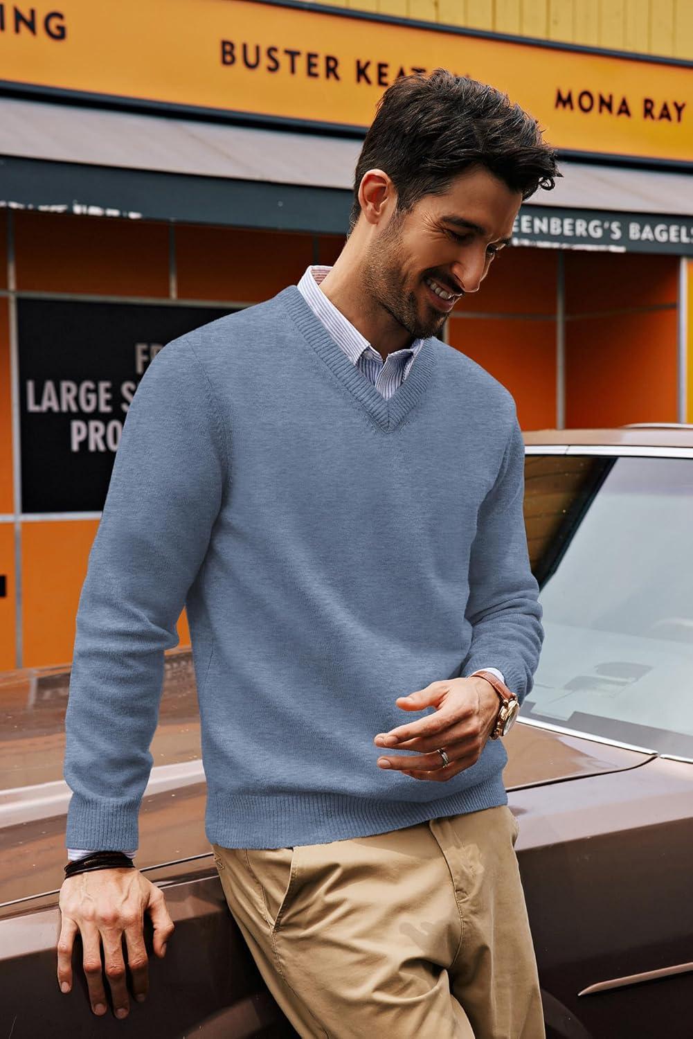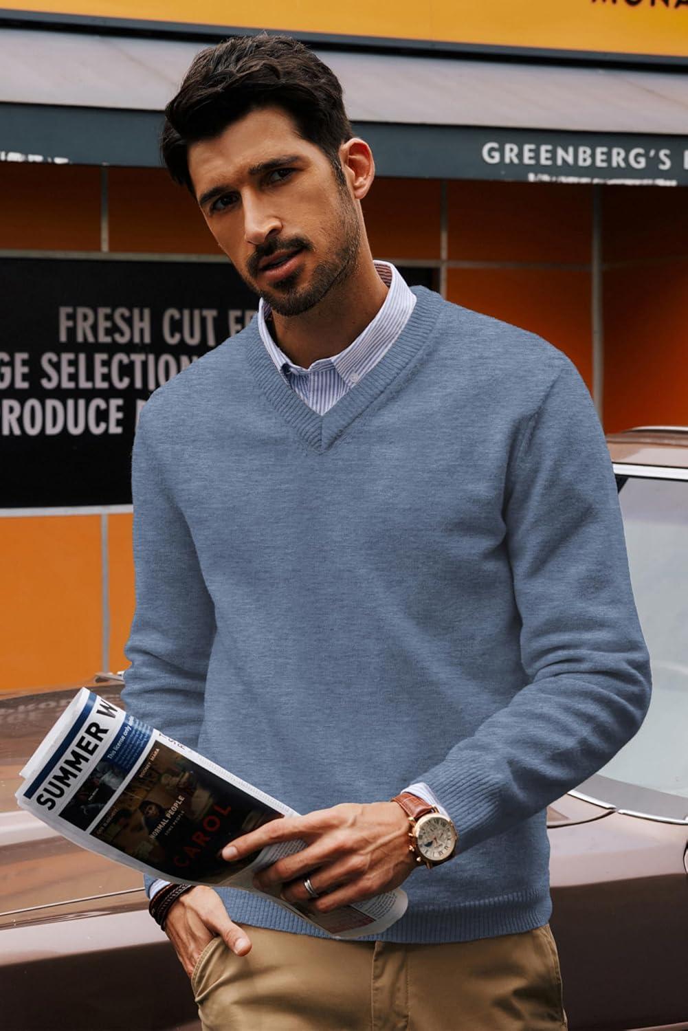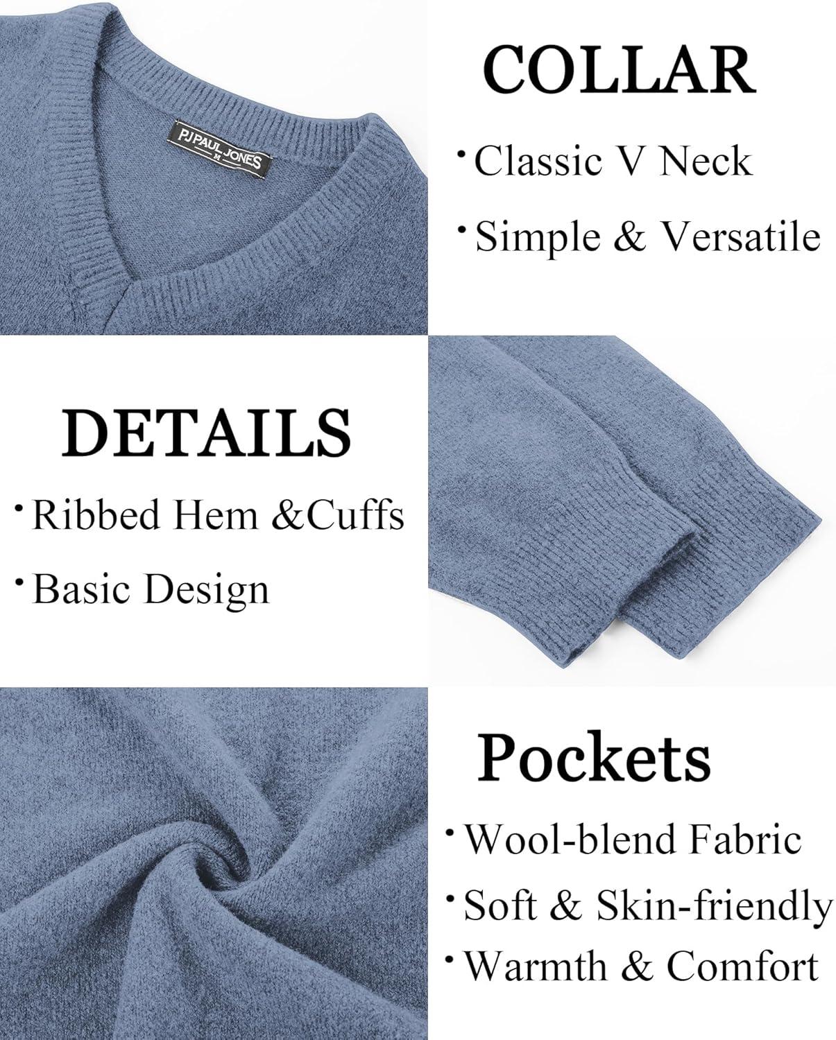 PJ PAUL JONES Mens V Neck Pullover Lightweight Wool Blend Long Sleeve Knit Sweater(Gray Blue)