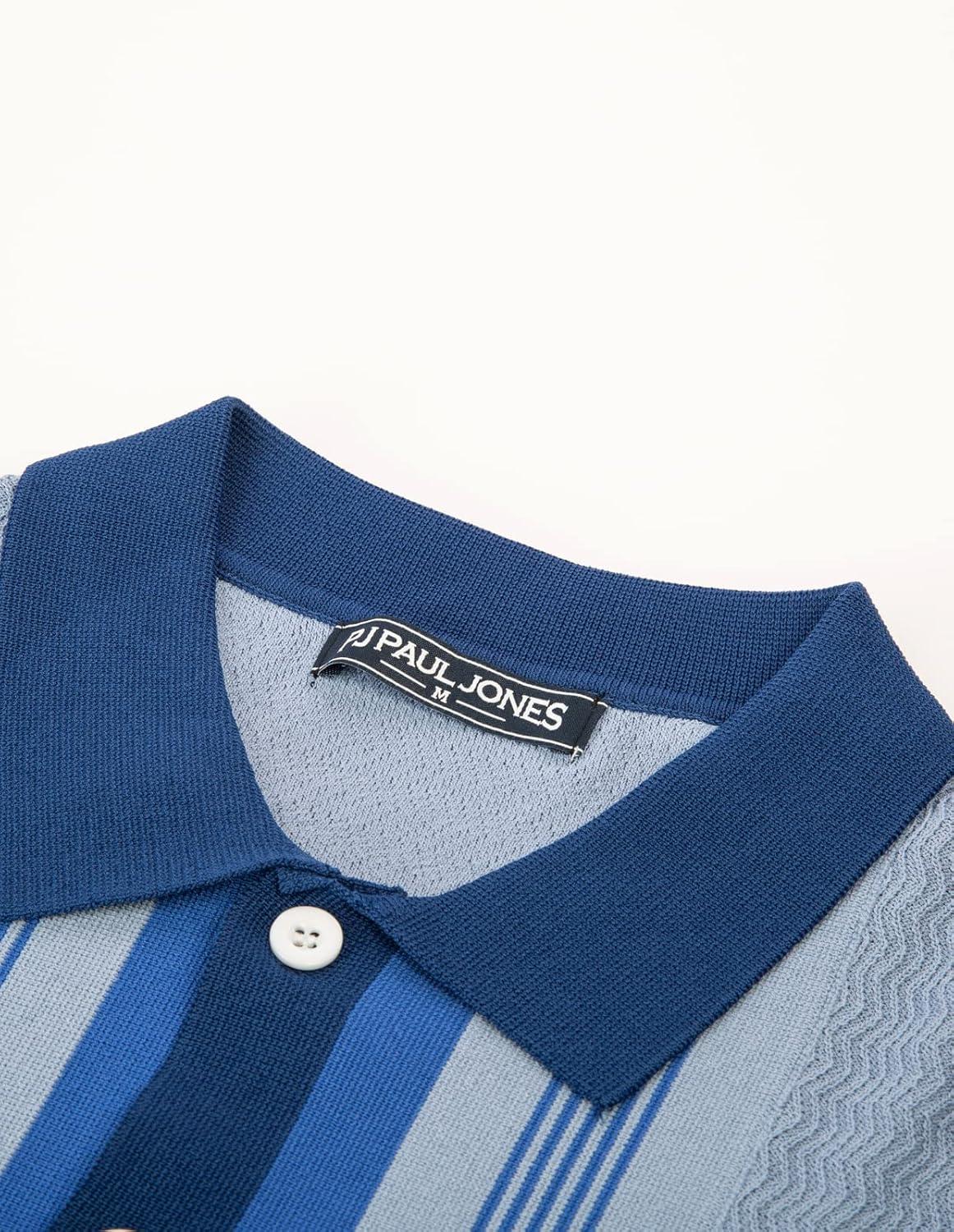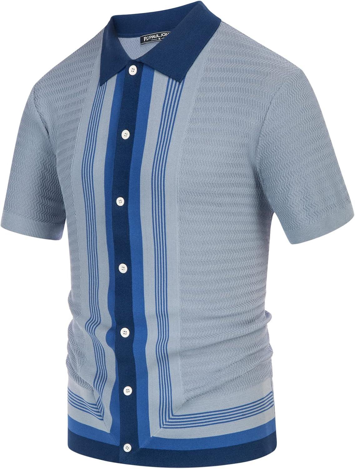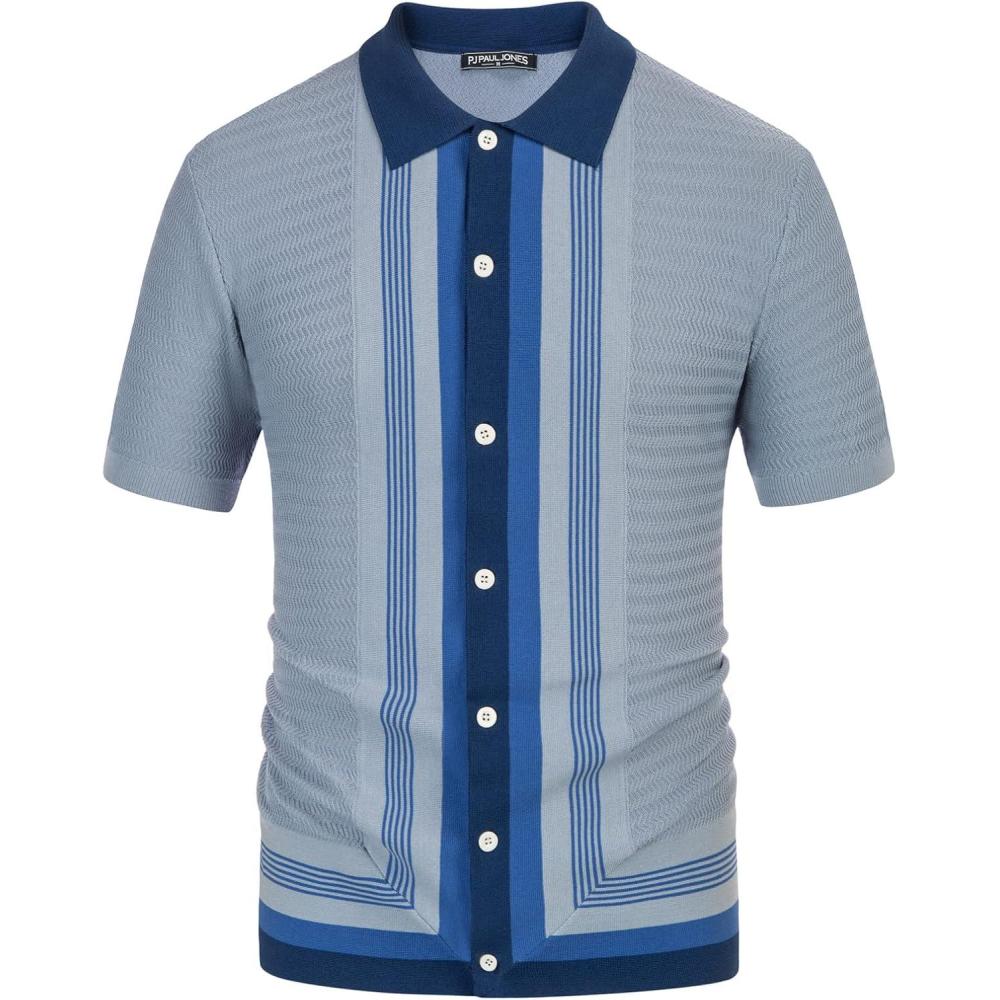 PJ PAUL JONES Men’s Vintage Stripe Knit Polo Shirts Short Sleeve Stylish Button Down Cardigan Sweater(Gray Blue)
