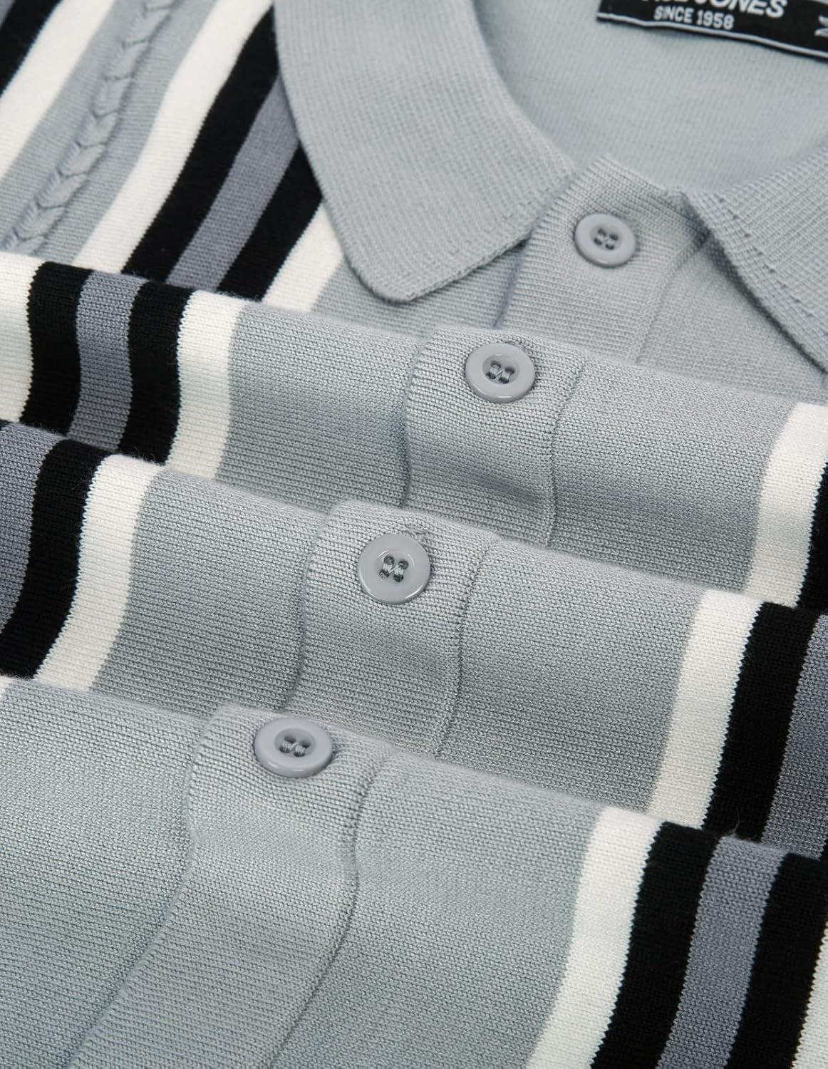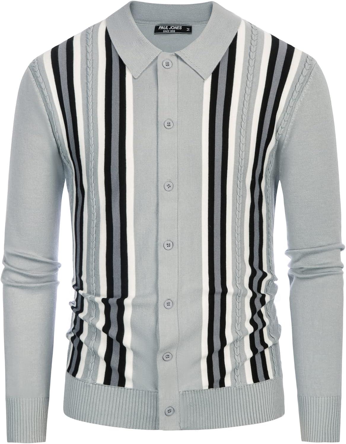 PJ PAUL JONES Mens Vintage Striped Knit Polo Shirt Long Sleeve Button Down Cardigan Sweater(Light Grey-long Sleeve)