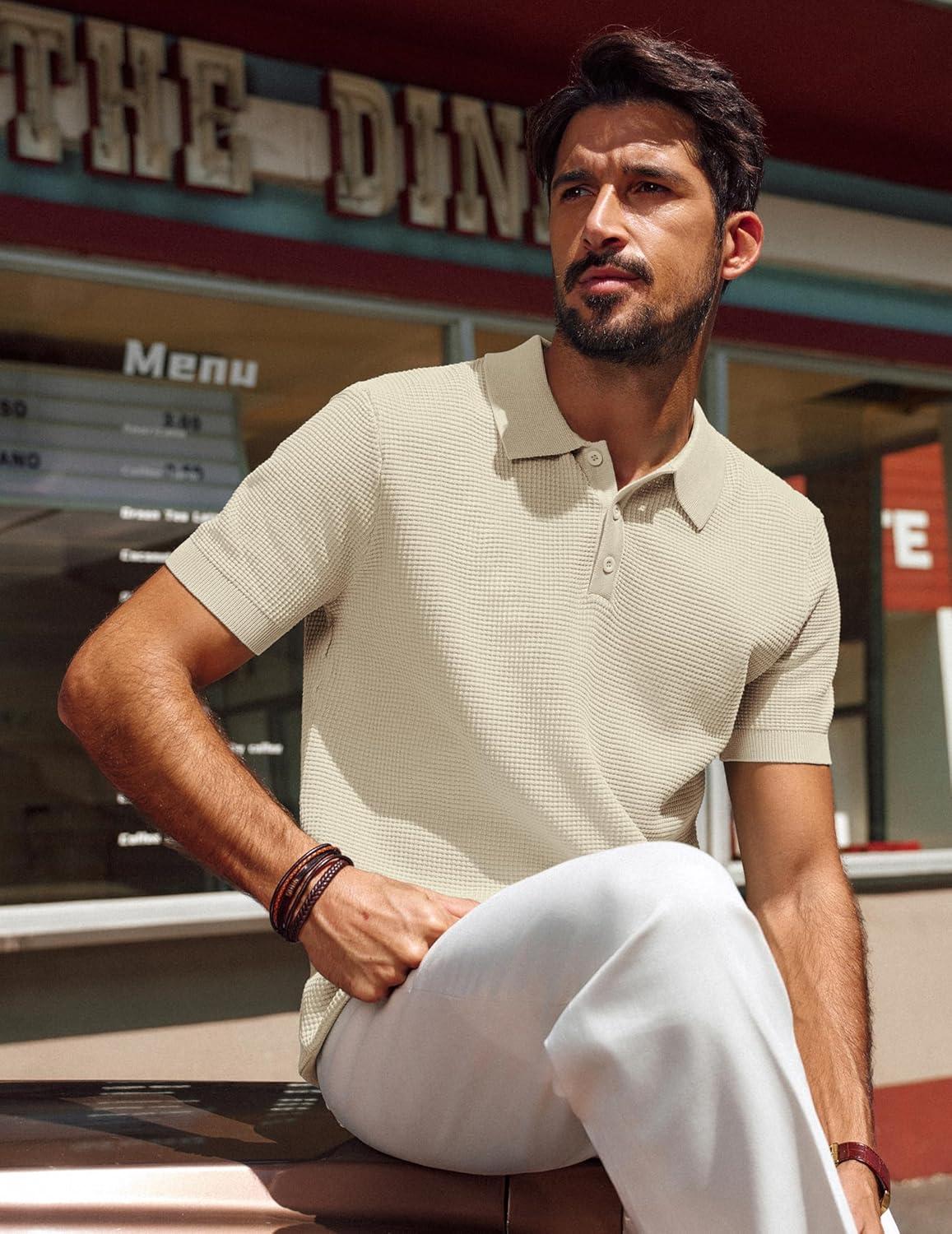 PJ PAUL JONES Polo Shirts for Men Short Sleeve Knit Waffle Texture Casual Dress Polo Golf Shirt(Apricot)