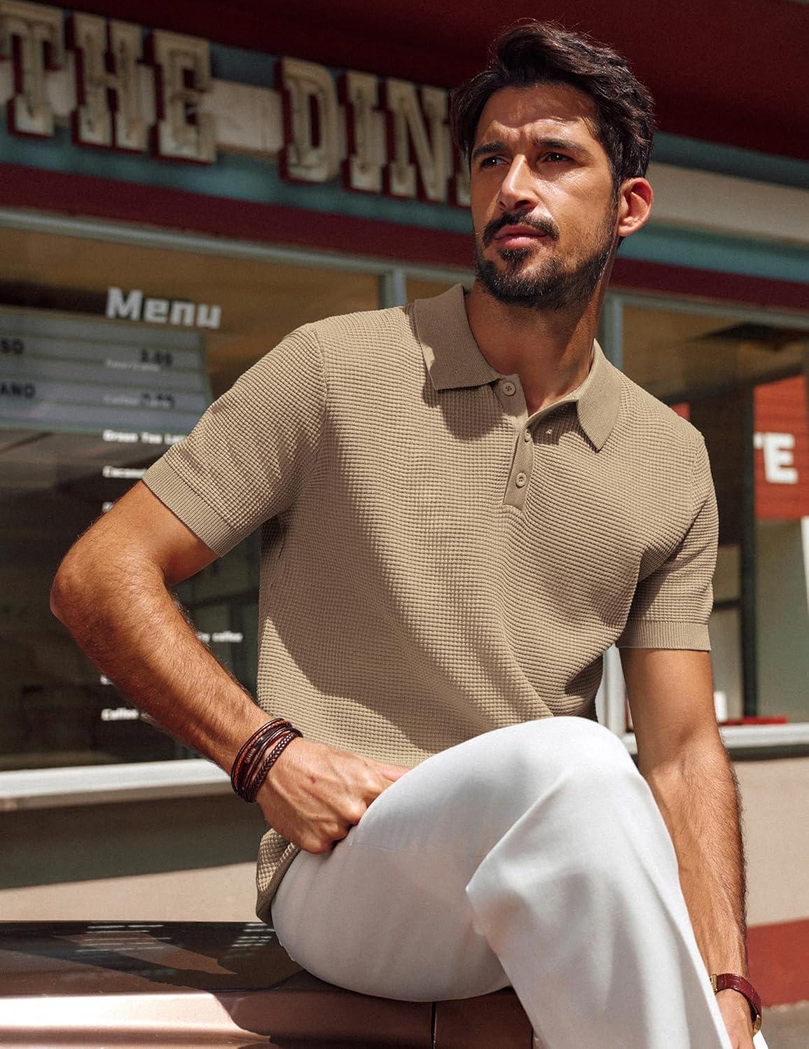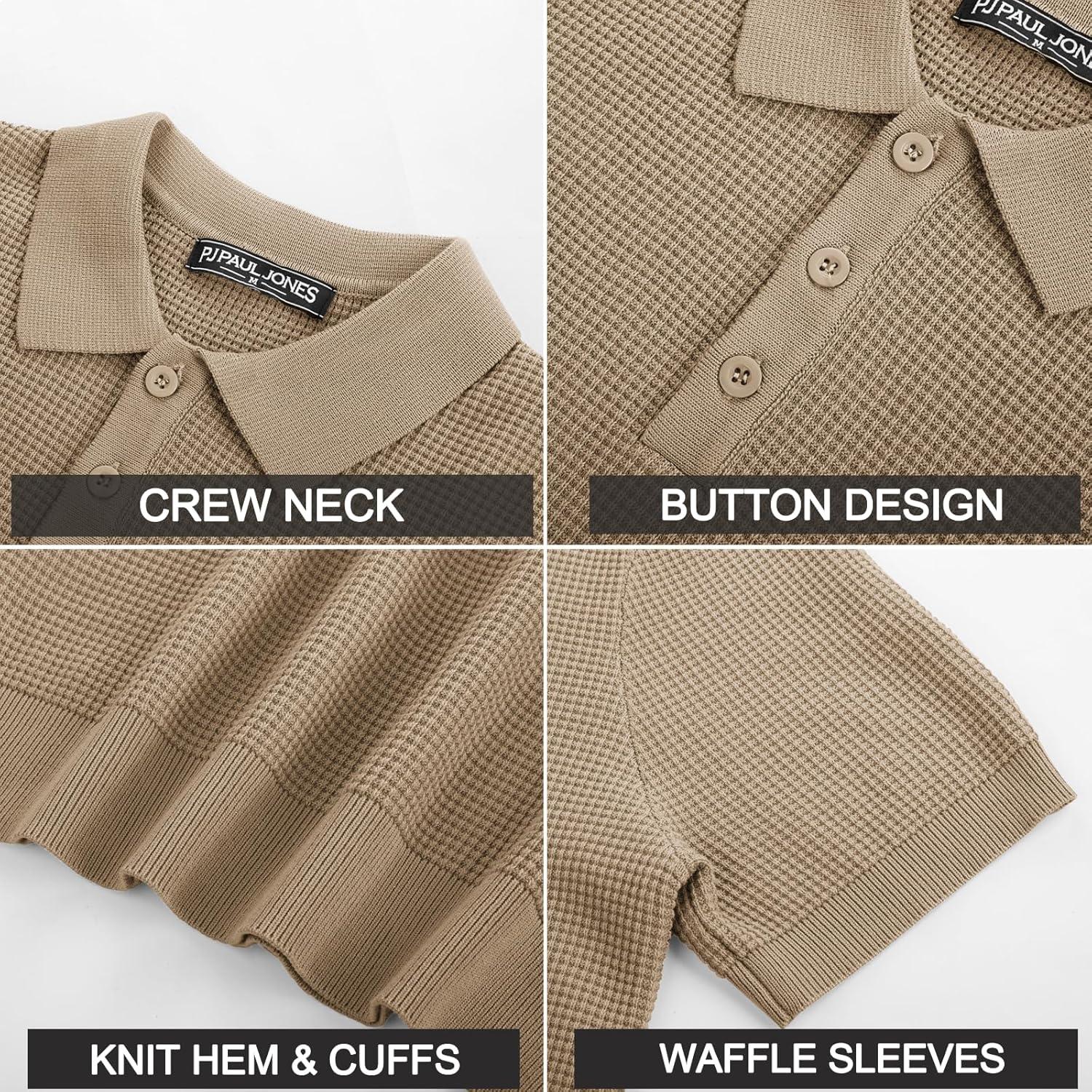 PJ PAUL JONES Polo Shirts for Men Short Sleeve Knit Waffle Texture Casual Dress Polo Golf Shirt(Camel)